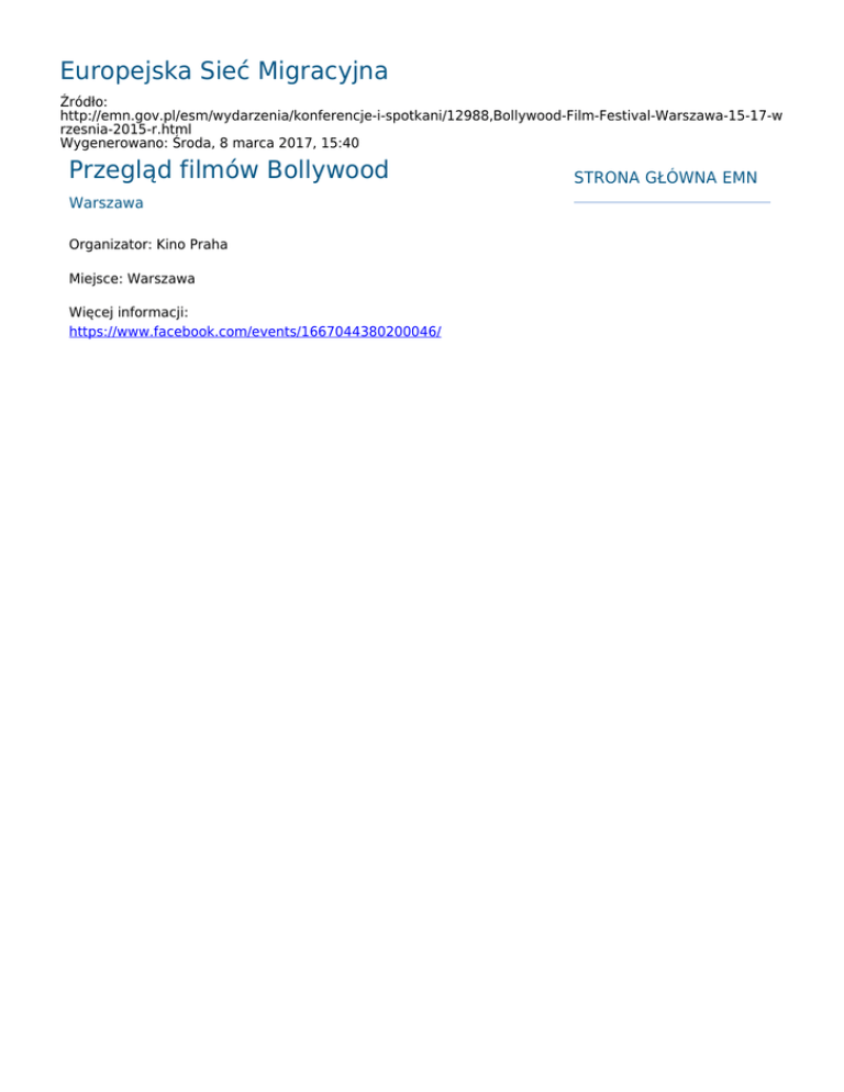Europejska Sieć Migracyjna Źródło: http://emn.gov.pl/esm/wydarzenia/konferencje-i-spotkani/12988,Bollywood-Film-Festival-Warszawa-15-17-w rzesnia-2015-r.html Wygenerowano: Środa, 8 marca 2017, 15:40 Przegląd filmów Bollywood Warszawa Organizator: Kino Praha Miejsce: Warszawa Więcej informacji: https://www.facebook.com/events/1667044380200046/ STRONA GŁÓWNA EMN