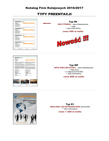 Katalog Firm Kolejowych 2016/2017 TYPY PREENTACJI Typ WI WIZYTÓWKA – dane teleadresowe + logo + wpis internetowy cena 400 zł netto -------------------------------------------------------------------------------------------------------------------------------------- Typ WP WPIS DWUJĘZYCZNY - dane teleadresowe + logo firmy + 3 zdjęcia (format B5) + wpis internetowy cena 800 zł netto -------------------------------------------------------------------------------------------------------------------------------------- Typ R1 REKLAMA CAŁOSTRONICOWA (format B5) + wpis internetowy cena 1 200 zł netto Katalog Firm Kolejowych 2016/2017 Typ R2 REKLAMA DWUSTRONICOWA (format 2 x B5) + wpis internetowy cena 1 900 zł netto -------------------------------------------------------------------------------------------------------------------------------------- Typ P1 WPIS DWUJĘZYCZNY + REKLAMA CAŁOSTRONICOWA dane teleadresowe + logo firmy + 3 zdjęcia (format B5) + reklama całostronicowa (format B5) + wpis internetowy cena 1 800 zł netto -------------------------------------------------------------------------------------------------------------------------------------- Typ P2 WPIS DWUJĘZYCZNY + REKLAMA DWUSTRONICOWA dane teleadresowe + logo firmy + 3 zdjęcia (format B5 ) + reklama dwustronicowa (format 2xB5) + wpis internetowy cena 2 500 zł netto Katalog Firm Kolejowych 2016/2017 -------------------------------------------------------------------------------------------------------------------------------------- Typ O2 REKLAMA NA II OKŁADCE (format B5) + wpis internetowy cena 4 000 zł netto Typ O3 REKLAMA NA III OKŁADCE (format B5) + wpis internetowy cena 3 000 zł netto -------------------------------------------------------------------------------------------------------------------------------------- Typ O4 REKLAMA NA IV OKŁADCE (format B5) + wpis internetowy cena 6 000 zł netto -------------------------------------------------------------------------------------------------------------------------------------- Typ O5 REKLAMA NA STRONIE PRZYOKŁADKOWEJ (format B5) zaraz za II okładką + wpis internetowy cena 2 500 zł netto