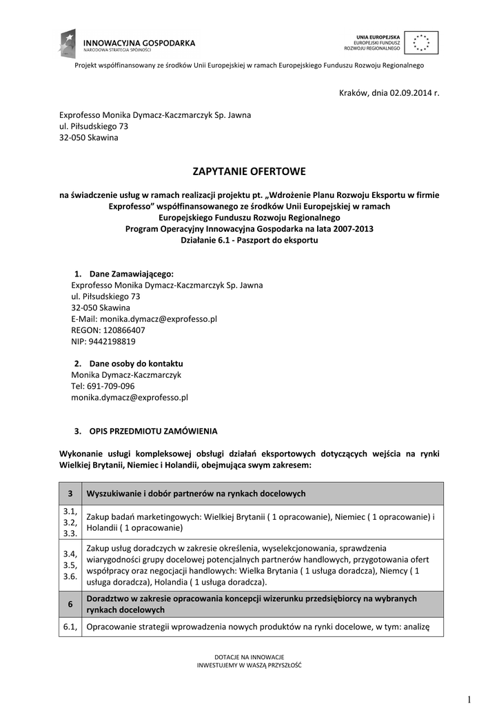 Projekt współfinansowany ze środków Unii Europejskiej w ramach Europejskiego Funduszu Rozwoju Regionalnego Kraków, dnia 02.09.2014 r. Exprofesso Monika Dymacz-Kaczmarczyk Sp. Jawna ul. Piłsudskiego 73 32-050 Skawina ZAPYTANIE OFERTOWE na świadczenie usług w ramach realizacji projektu pt. „Wdrożenie Planu Rozwoju Eksportu w firmie Exprofesso” współfinansowanego ze środków Unii Europejskiej w ramach Europejskiego Funduszu Rozwoju Regionalnego Program Operacyjny Innowacyjna Gospodarka na lata 2007-2013 Działanie 6.1 - Paszport do eksportu 1. Dane Zamawiającego: Exprofesso Monika Dymacz-Kaczmarczyk Sp. Jawna ul. Piłsudskiego 73 32-050 Skawina E-Mail: [email protected] REGON: 120866407 NIP: 9442198819 2. Dane osoby do kontaktu Monika Dymacz-Kaczmarczyk Tel: 691-709-096 [email protected] 3. OPIS PRZEDMIOTU ZAMÓWIENIA Wykonanie usługi kompleksowej obsługi działań eksportowych dotyczących wejścia na rynki Wielkiej Brytanii, Niemiec i Holandii, obejmująca swym zakresem: 3 Wyszukiwanie i dobór partnerów na rynkach docelowych 3.1, Zakup badań marketingowych: Wielkiej Brytanii ( 1 opracowanie), Niemiec ( 1 opracowanie) i 3.2, Holandii ( 1 opracowanie) 3.3. Zakup usług doradczych w zakresie określenia, wyselekcjonowania, sprawdzenia 3.4, wiarygodności grupy docelowej potencjalnych partnerów handlowych, przygotowania ofert 3.5, współpracy oraz negocjacji handlowych: Wielka Brytania ( 1 usługa doradcza), Niemcy ( 1 3.6. usługa doradcza), Holandia ( 1 usługa doradcza). 6 Doradztwo w zakresie opracowania koncepcji wizerunku przedsiębiorcy na wybranych rynkach docelowych 6.1, Opracowanie strategii wprowadzenia nowych produktów na rynki docelowe, w tym: analizę DOTACJE NA INNOWACJE INWESTUJEMY W WASZĄ PRZYSZŁOŚĆ 1 Projekt współfinansowany ze środków Unii Europejskiej w ramach Europejskiego Funduszu Rozwoju Regionalnego 6.2, cyklu życia produktu na wybranych rynkach docelowych, analizę wyglądu produktu pod kątem 6.3. potrzeb wybranych rynków docelowych, analizę wyglądu i bezpieczeństwa produktu oraz opakowania: Wielka Brytania ( 1 strategia), Niemcy ( 1 strategia), Holandia ( 1 strategia) 2 Organizacja i udział w misjach gospodarczych za granicą 2.1, 2.2, 2.3. 2.4, 2.5, 2.6. 2.7, 2.8, 2.9. 8 8.2 Zakup usługi polegającej na organizacji misji. Misja do Wielkiej Brytanii, Misja do Niemiec, Misja do Holandii. Zakup usługi polegającej na organizacji spotkań z potencjalnymi partnerami handlowymi. Misja do Wielkiej Brytanii, Misja do Niemiec, Misja do Holandii. Zakup usług doradczych w zakresie określenia potencjalnych partnerów handlowych, przygotowania ofert współpracy oraz negocjacji handlowych. Misja do Wielkiej Brytanii, Misja do Niemiec, Misja do Holandii. Zakup usługi polegającej na zorganizowaniu misji Misje gospodarcze przedsiębiorców z Wielkiej Brytanii, Niemiec, Holandii. Liczba misji: 4 Prosimy przedstawić ofertę uwzględniając cenę działania oddzielnie dla każdego rynku. 4. OPIS SPOSOBU PRZYGOTOWANIA OFERTY ORAZ ZAWARTOŚĆ OFERTY Oferta powinna zawierać: • Cenę całkowitą netto przedmiotu zamówienia, wyrażoną w PLN • Nazwę i adres oferenta, • Datę sporządzenia, • Termin ważności oferty, • Termin realizacji, • Termin i warunki płatności, • Podpis oferenta (osoba upoważniona). • Informację o ilości zrealizowanych projektów w ramach działania 6.1 5. TERMIN WAŻNOŚCI OFERTY Oferta powinna być ważna minimum 60 dni od dnia złożenia oferty. DOTACJE NA INNOWACJE INWESTUJEMY W WASZĄ PRZYSZŁOŚĆ 2 Projekt współfinansowany ze środków Unii Europejskiej w ramach Europejskiego Funduszu Rozwoju Regionalnego 6. Kryteria wyboru: LP. Kryteria wyboru Cena- mieszcząca się w zaplanowanym budżecie. Kryterium cenowe, stanowi 1 harmonogram działań będący załącznikiem nr 1 do niniejszego zapytania ofertowego. Waga Kryterium Punktacja 1. 3 2. 3. 4. Doświadczenie w obsłudze działań eksportowych dotyczących wejścia na 2 rynki zagraniczne 5. 1. 3 2. 3. Maksymalna liczba punktów 8 Kwota mieszcząca się w przewidzianym budżecie 1 pkt Kwota niemieszcząca się w przewidzianym budżecie 0 pkt Wszystkie działania razem mieszczą się w zaplanowanym budżecie 1 pkt Wszystkie działania razem nie mieszczą się w zaplanowanym budżecie 0 pkt Największa liczba zrealizowanych projektów – 3 pkt Średnia liczba zrealizowanych projektów – 2 pkt Najmniejsza liczba zrealizowanych ofert- 1 pkt. Sumę punktów dla każdej oferty stanowi suma iloczynów poszczególnych kryteriów i ich wag. Najwyższa uzyskana liczba punktów, wyłoni zwycięzką ofertę. 7. Termin, miejsce i forma składania ofert: • • Oferty należy składać do biura: Exprofesso Monika Dymacz-Kaczmarczyk Spółka Jawna Ul. Piłsudskiego 73 32-50 Skawina lub przesłać mailem na adres: [email protected] w terminie do dnia 15 września 2014 roku, do godziny 16.00. Datą złożenia oferty jest data wpływu do siedziby zamawiającego. Przesyłki nadane w Urzędzie Pocztowym, które wpłynęły do zamawiającego po terminie przewidzianym do składania ofert albo zostały złożone bezpośrednio w miejscu składania ofert po upływie wyznaczonego terminu, pozostawia się w aktach konkursu bez rozpoznania. Oferta musi być podpisana przez osobę/osoby uprawnione do występowania w obrocie prawnym w imieniu Oferenta (podpis musi być czytelny lub opatrzony pieczątką imienną) oraz opatrzona pieczątką firmową. DOTACJE NA INNOWACJE INWESTUJEMY W WASZĄ PRZYSZŁOŚĆ 3 Projekt współfinansowany ze środków Unii Europejskiej w ramach Europejskiego Funduszu Rozwoju Regionalnego Załącznik nr 1: Zaplanowany budżet Nr działania 3 Zaplanowane działania Zaplanowany budżet Wyszukiwanie i dobór partnerów na rynkach docelowych 3.1, 3.2, Zakup badań marketingowych: Wielkiej Brytanii ( 1 opracowanie), Niemiec ( 1 3.3. opracowanie) i Holandii ( 1 opracowanie) 50 000,00 zł Zakup usług doradczych w zakresie określenia, wyselekcj