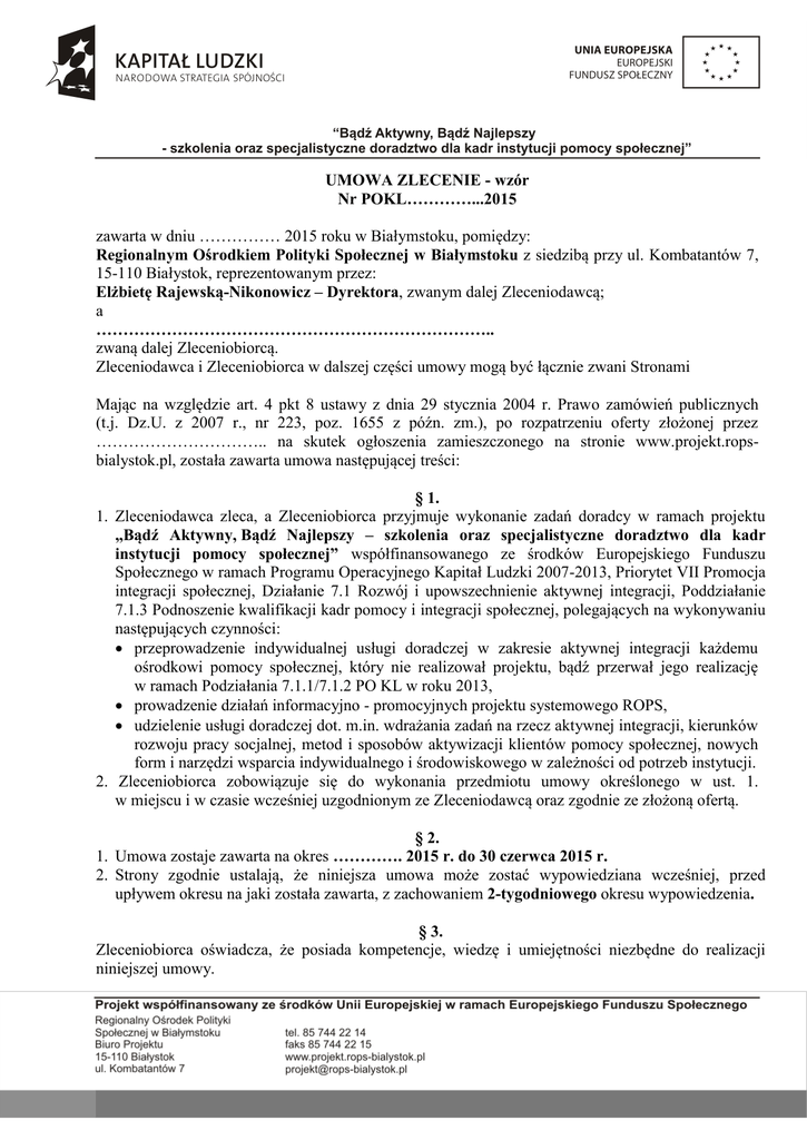 UMOWA ZLECENIE - wzór Nr POKL…………...2015 zawarta w dniu …………… 2015 roku w Białymstoku, pomiędzy: Regionalnym Ośrodkiem Polityki Społecznej w Białymstoku z siedzibą przy ul. Kombatantów 7, 15-110 Białystok, reprezentowanym przez: Elżbietę Rajewską-Nikonowicz – Dyrektora, zwanym dalej Zleceniodawcą; a ……………………………………………………………….. zwaną dalej Zleceniobiorcą. Zleceniodawca i Zleceniobiorca w dalszej części umowy mogą być łącznie zwani Stronami Mając na względzie art. 4 pkt 8 ustawy z dnia 29 stycznia 2004 r. Prawo zamówień publicznych (t.j. Dz.U. z 2007 r., nr 223, poz. 1655 z późn. zm.), po rozpatrzeniu oferty złożonej przez ………………………….. na skutek ogłoszenia zamieszczonego na stronie www.projekt.ropsbialystok.pl, została zawarta umowa następującej treści: § 1. 1. Zleceniodawca zleca, a Zleceniobiorca przyjmuje wykonanie zadań doradcy w ramach projektu „Bądź Aktywny, Bądź Najlepszy – szkolenia oraz specjalistyczne doradztwo dla kadr instytucji pomocy społecznej” współfinansowanego ze środków Europejskiego Funduszu Społecznego w ramach Programu Operacyjnego Kapitał Ludzki 2007-2013, Priorytet VII Promocja integracji społecznej, Działanie 7.1 Rozwój i upowszechnienie aktywnej integracji, Poddziałanie 7.1.3 Podnoszenie kwalifikacji kadr pomocy i integracji społecznej, polegających na wykonywaniu następujących czynności: przeprowadzenie indywidualnej usługi doradczej w zakresie aktywnej integracji każdemu ośrodkowi pomocy społecznej, który nie realizował projektu, bądź przerwał jego realizację w ramach Podziałania 7.1.1/7.1.2 PO KL w roku 2013, prowadzenie działań informacyjno - promocyjnych projektu systemowego ROPS, udzielenie usługi doradczej dot. m.in. wdrażania zadań na rzecz aktywnej integracji, kierunków rozwoju pracy socjalnej, metod i sposobów aktywizacji klientów pomocy społecznej, nowych form i narzędzi wsparcia indywidualnego i środowiskowego w zależności od potrzeb instytucji. 2. Zleceniobiorca zobowiązuje się do wykonania przedmiotu umowy określonego w ust. 1. w miejscu i w czasie wcześniej uzgodnionym ze Zleceniodawcą oraz zgodnie ze złożoną ofertą. § 2. 1. Umowa zostaje zawarta na okres …………. 2015 r. do 30 czerwca 2015 r. 2. Strony zgodnie ustalają, że niniejsza umowa może zostać wypowiedziana wcześniej, przed upływem okresu na jaki została zawarta, z zachowaniem 2-tygodniowego okresu wypowiedzenia. § 3. Zleceniobiorca oświadcza, że posiada kompetencje, wiedzę i umiejętności niezbędne do realizacji niniejszej umowy. § 4. Zleceniobiorca oświadcza, że w przypadku niespełnienia przez niego warunków określonych w złożonym do niniejszej umowy Oświadczeniu, będzie zobowiązany do pokrycia wszelkich kosztów poniesionych z tego tytułu przez Zleceniodawcę. Obowiązek zapłaty nastąpi na podstawie pisemnego wezwania do zapłaty skierowanego przez Zleceniodawcę do Zleceniobiorcy. § 5. 1. Za wykonywanie zlecenia Zleceniobiorcy przysługuje wynagrodzenie w wysokości ………………… zł brutto wliczając w to podatek VAT (słownie: …………………………………) jako stawka godzinowa, rozliczane za każdy miesiąc wykonywania zlecenia w okresie ustalonym w § 2 ust. 1, na podstawie miesięcznej karty realizacji zlecenia stanowiącej załącznik nr 1 do Umowy oraz formularza wykonania usługi doradczej stanowiącego załącznik nr 2 do Umowy, z którego Zleceniodawca dokona stosownych potrąceń, w szczególności zgodnie z przepisami ustawy z dnia 26 lipca 1991 r. o podatku dochodowym od osób fizycznych (Dz.U. z 2011 r. Nr 234, poz. 1391 z późn. zm.). 2. Płatność za właściwie wykonany przedmiot umowy nastąpi w terminie 14 dni od otrzymania rachunku opiewającego na kwotę wskazaną w ust. 1, który to rachunek może być wystawiony nie wcześniej niż po wykonaniu zlecenia oraz przedłożeniu kart pracy oraz ewidencji godzinowej potwierdzającej zaangażowanie w realizację innych projektów realizowanych w ramach NSRO. Zleceniobiorca zobowiązuje się wystawić rachunek o jakim mowa powyżej do 10-go dnia każdego miesiąca następującego po miesiącu, w którym zostało wykonane zlecenie. 3. Strony zgodnie ustalają, że łączna ilość godzin wykonywania zlecenia w całym okresie objętym umową nie może przekroczyć 80 godzin W przypadku gdyby Zleceniobiorca przekroczy limit godzin o jakim mowa, nie przysługuje mu wynagrodzenie za ich wykonanie. 4. Strony zgodnie ustalają, że płatność z tytułu wykonania niniejszej umowy będzie dokonana nie wcześniej niż i pod warunkiem przekazania przez Instytucję Wdrażającą środków finansowych służących finansowaniu niniejszej umowy na wyodrębniony rachunek bankowy Zleceniodawcy. 5. W przypadku braku środków o jakich mowa w powyższym ustępie na rachunku Zleceniodawcy, płatność z tytułu niniejszej umowy nie będzie uznana za opóźnioną. 6. Wynagrodzenie objęte niniejszą umową współfinansowane jest ze środków Unii Europejskiej w ramach Europejskiego Funduszu Społecznego. § 6. Zgodnie ze stanem faktycznym istniejącym na datę podpisania niniejszej umowy Zleceniobiorca oświadcza, że z tytułu jej wykonywania: *) 1) podlega obowiązkowemu ubezpieczeniu emerytalnemu i rentowemu, 2) nie podlega obowiązkowemu ubezpieczeniu emerytalnemu i rentowemu, W przypadku gdy zaznaczono pkt 1, Zleceniobiorca oświadcza, że: chce być objęty dobrowolnym ubezpieczeniem chorobowym i wnosi o objęcie takim ubezpieczeniem W przypadku gdy zaznaczono pkt 2, Zleceniobiorca oświadcza, że: chce podlegać dobrowolnemu ubezpieczeniu emerytalnemu i rentowemu i wnosi o objęcie takimi ubezpieczeniami. *) właściwe zaznaczyć § 7. 1. Strony zgodnie oświadczają, że w przypadku nienależytego lub nieterminowego wykonania zlecenia, Zleceniodawca ma prawo odmowy wypłaty całości lub części umow