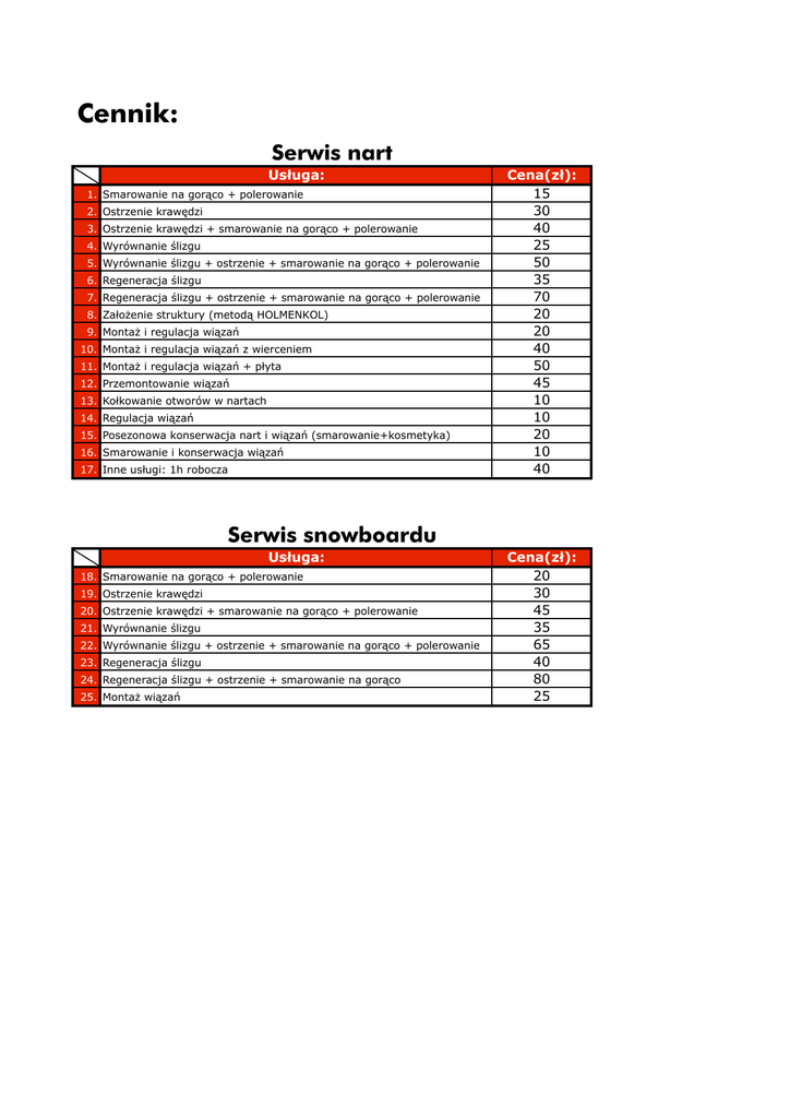 Cennik: Serwis nart Usługa: 1. Smarowanie na gorąco + polerowanie 2. Ostrzenie krawędzi 3. Ostrzenie krawędzi + smarowanie na gorąco + polerowanie 4. Wyrównanie ślizgu 5. Wyrównanie ślizgu + ostrzenie + smarowanie na gorąco + polerowanie 6. Regeneracja ślizgu 7. Regeneracja ślizgu + ostrzenie + smarowanie na gorąco + polerowanie 8. Założenie struktury (metodą HOLMENKOL) 9. Montaż i regulacja wiązań 10. Montaż i regulacja wiązań z wierceniem 11. Montaż i regulacja wiązań + płyta 12. Przemontowanie wiązań 13. Kołkowanie otworów w nartach 14. Regulacja wiązań 15. Posezonowa konserwacja nart i wiązań (smarowanie+kosmetyka) 16. Smarowanie i konserwacja wiązań 17. Inne usługi: 1h robocza Cena(zł): 15 30 40 25 50 35 70 20 20 40 50 45 10 10 20 10 40 Serwis snowboardu Usługa: 18. Smarowanie na gorąco + polerowanie 19. Ostrzenie krawędzi 20. Ostrzenie krawędzi + smarowanie na gorąco + polerowanie 21. Wyrównanie ślizgu 22. Wyrównanie ślizgu + ostrzenie + smarowanie na gorąco + polerowanie 23. Regeneracja ślizgu 24. Regeneracja ślizgu + ostrzenie + smarowanie na gorąco 25. Montaż wiązań Cena(zł): 20 30 45 35 65 40 80 25
