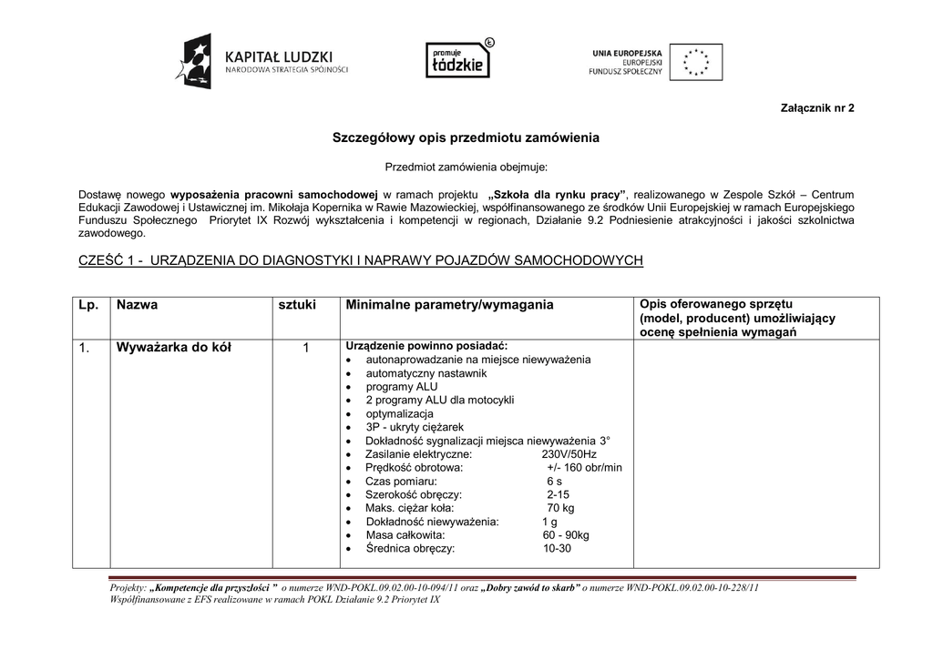 Załącznik nr 2 Szczegółowy opis przedmiotu zamówienia Przedmiot zamówienia obejmuje: Dostawę nowego wyposażenia pracowni samochodowej w ramach projektu „Szkoła dla rynku pracy”, realizowanego w Zespole Szkół – Centrum Edukacji Zawodowej i Ustawicznej im. Mikołaja Kopernika w Rawie Mazowieckiej, współfinansowanego ze środków Unii Europejskiej w ramach Europejskiego Funduszu Społecznego Priorytet IX Rozwój wykształcenia i kompetencji w regionach, Działanie 9.2 Podniesienie atrakcyjności i jakości szkolnictwa zawodowego. CZEŚĆ 1 - URZĄDZENIA DO DIAGNOSTYKI I NAPRAWY POJAZDÓW SAMOCHODOWYCH Lp. Nazwa 1. Wyważarka do kół sztuki 1 Minimalne parametry/wymagania Opis oferowanego sprzętu (model, producent) umożliwiający ocenę spełnienia wymagań Urządzenie powinno posiadać: autonaprowadzanie na miejsce niewyważenia automatyczny nastawnik programy ALU 2 programy ALU dla motocykli optymalizacja 3P - ukryty ciężarek Dokładność sygnalizacji miejsca niewyważenia 3° Zasilanie elektryczne: 230V/50Hz Prędkość obrotowa: +/- 160 obr/min Czas pomiaru: 6s Szerokość obręczy: 2-15 Maks. ciężar koła: 70 kg Dokładność niewyważenia: 1g Masa całkowita: 60 - 90kg Średnica obręczy: 10-30 Projekty: „Kompetencje dla przyszłości ” o numerze WND-POKL.09.02.00-10-094/11 oraz „Dobry zawód to skarb” o numerze WND-POKL.09.02.00-10-228/11 Współfinansowane z EFS realizowane w ramach POKL Działanie 9.2 Priorytet IX 2. Urządzenie do demontażu oponmontażownica wraz z kompresorem 1 Montażownica Urządzenie powinno zapewniać: Automatyczny demontaż i montaż opon dętkowych i bezdętkowych, demontaż i montaż opon na koła samochodów osobowych i dostawczych, obsługę kół z obręczami aluminiowymi, kolumna i ramiona poruszane i blokowane pneumatycznie, Funkcje Montażownicy: odpiekanie odrywanie opony od obręczy demontaż i montaż opony pompowanie koła za pomocą pistoletu z manometrem Parametry moc silnika; 0,75 kW; masa maszyny; 150 - 180 kg; wewnętrzne mocowanie obręczy; 13-23; zasilanie elektryczne; ; 3x400V/50Hz; max. szerkość koła; 15; prędkość obrotowa; 7/14 obr/min; ciśnienie robocze; 8-10 Bar; zewnętrzne mocowanie obręczy; 10-20; siła nacisku siłownika odklejacza; 1500 kg; Kompresor Urządzenie powinno zapewniać: pracę w trybie wolnoobrotowym pracę w stosunku 60% - 40% (czas sprężania czas odpoczynku maszyny) w maksymalnym czasie do 12 godzin dziennie. Ponadto sprężarka powinna posiadać: wysokiej jakości silnik elektryczny, metalową, przemysłową osłonę kół pasowych wydajny układ chłodzenia pompy sprężarkowej Projekty: „Kompetencje dla przyszłości ” o numerze WND-POKL.09.02.00-10-094/11 oraz „Dobry zawód to skarb” o numerze WND-POKL.09.02.00-10-228/11 Współfinansowane z EFS realizowane w ramach POKL Działanie 9.2 Priorytet IX powiększony karter na olej dla lepszego chłodzenia i smarowania, łatwą kontrolę poziomu oleju, dwa koła z tyłu, jedno obrotowe z przodu wykonane z gumy, wyposażenie w reduktor ciśnieniowy z dwoma szybkozłączami, dodatkowe szybkozłącze umieszczone od czoła zbiornika Parametry: Pojemność zbiornika - 150l -160l Ssanie – 400 l/min Ciśnienie maksymalne - 10bar Moc - 3.0/2.2 KM/kW Napięcie zasilania - 400V 3. Urządzenie do naprawy ogumienia 1 Urządzenie do naprawy ogumienia Rozpieracz wulkanizatorski do opon Obrotowy uchwyt 360°, regulowany zakres, 4 nastawy siły rozporu. 4. Przyrząd optyczny do kontroli ustawienia świateł 1 Przyrząd umożliwiający ustawianie świateł we wszystkich modelach aut. Obsługuje lampy Xenonowe. Soczewka z żywicy poliwęglanowej. Wysokość 170 cm. Możliwość regulacji wysokości z blokadą. Obrotowa prowadnica umożliwia pracę w zakresie 360°. Pozycjonowanie laserem. Cyfrowy miernik luksów i kandeli Projekty: „Kompetencje dla przyszłości ” o numerze WND-POKL.09.02.00-10-094/11 oraz „Dobry zawód to skarb” o numerze WND-POKL.09.02.00-10-228/11 Współfinansowane z EFS realizowane w ramach POKL Działanie 9.2 Priorytet IX 5. Urządzenie do pomiaru i regulacji geometrii kół w samochodach osobowych 1 Przyrząd przeznaczony do szybkiego pomiaru ustawienia kół różnych typów samochodów, posiadających obręcze kół o średnicy od 12" do 18". Możliwość pomiaru zbieżności połówkowej kół przednich względem geometrycznej osi jazdy z uwzględnieniem przesunięcia kół osi przedniej. Przy jednorazowym zamocowaniu przyrząd powinien umożliwiać pomiar lub obliczenie następujących parametrów: kątów pochylenia kół tylnych zbieżności połówkowych kół tylnych zbieżności całkowitej kół tylnych odchylenia geometrycznej osi jazdy od osi symetrii kątów wyprzedzenia osi sworzni zwrotnic, kątów pochylenia kół przednich, kątów pochylenia osi sworzni zwrotnic, zbieżności połówkowych kół przednich, zbieżności całkowitej kół przednich, przesunięcia kół osi przedniej, nierównoległości osi kół, różnicy kątów skrętu kół przy skręcie o 20°, śladowości kół Charakterystyka techniczna przyrządu Średnica obręczy kół samochodu od 12" do 18" Zasilanie przyrządu 220 V, 50 VA Zasilanie zespołów pomiarowych: - akumulatorowe (bezprzewodowe) 6V= - poprzez zasilacz (przewodowe) 10V= Maksymalny czas szybkiego ładowania akumulatorów 3 godz. Minimalny czas pracy ciągłej zespołu pomiarowego: przy zasilaniu akumulatorowym 7 godz. Projekty: „Kompetencje dla przyszłości ” o numerze WND-POKL.09.02.00-10-094/11 oraz „Dobry zawód to skarb” o numerze WND-POKL.09.02.00-10-228/11 Współfinansowane z EFS realizowane w ramach POKL Działanie 9.2 Priorytet IX 6. Przyrząd do pomiaru luzu układu kierowniczego 1 Laser: źródło laserowe przeznaczone do pracy ciągłej klasy 2 spełniające normę PN-EN 60825-1 Przyrząd diagnostyczny przeznaczony do pomiaru sumarycznego luzu układu kierowniczego oraz ruchu jałowego kierownicy we wszystkich typach samochod