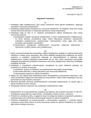 Załącznik nr 2 do zarządzenia nr 82/2015 Formularz P.156_F3 Regulamin hospitacji §1 1. Hospitacje zajęć dydaktycznych, jako waŜny instrument oceny jakości kształcenia, obejmują wszystkich nauczycieli akademickich. 2. Hospitacje przeprowadza doświadczony nauczyciel akademicki. W hospitacji moŜe brać udział równieŜ kierownik jednostki, w której jest zatrudniona osoba hospitowana. 3. Hospitacje mają na celu m. in. wsparcie prowadzących zajęcia dydaktyczne oraz ocenę nauczyciela poprzez: a) przekazanie sugestii nauczycieli akademickich z duŜym doświadczeniem dydaktycznym, na temat sposobu prowadzenia zajęć, metod aktywizacji studentów, poprawności materiałów dydaktycznych, rozplanowania i wykorzystania czasu zajęć oraz relacji pomiędzy nauczycielem a studentami, b) doskonalenie umiejętności dydaktycznych nauczycieli, zwłaszcza doktorantów i nauczycieli z krótkim staŜem pracy dydaktycznej. §2 1. KaŜdy nauczyciel akademicki prowadzący zajęcia dydaktyczne, podlega co najmniej dwukrotnej hospitacji w czasie oceny okresowej. Gdy ocena ostatniej hospitacji jest negatywna lub opinia wyraŜona w ankietach studenckich wskazuje na nieprawidłowości w realizacji zajęć dydaktycznych, kolejną hospitację przeprowadza się po roku. Nowo zatrudnieni nauczyciele podlegają obowiązkowej hospitacji w pierwszym roku pracy dydaktycznej. Doktoranci podlegają hospitacji corocznie. 2. Hospitacje o charakterze interwencyjnym zarządzane są przez dziekana wydziału lub prorektora ds. studiów na wniosek: a) studentów, złoŜony do dziekana za pośrednictwem samorządu studenckiego, b) kierownika jednostki, w której zatrudniony jest nauczyciel akademicki, c) kierunkowego zespołu ds. jakości kształcenia. 3. Zaleca się, aby zajęcia były hospitowane przez samodzielnych pracowników naukowych. Gdy osoba prowadząca zajęcia jest samodzielnym pracownikiem, takŜe osoba hospitująca musi być samodzielnym pracownikiem naukowym. 4. Kierownik jednostki informuje zainteresowanych nauczycieli akademickich, Ŝe zostali ujęci w planie hospitacji na dany semestr. 5. Hospitujący powinien zapoznać się z sylabusem hospitowanych zajęć. §3 1. Bezpośrednio po przeprowadzonej hospitacji sporządzany jest protokół (formularz P.156_F2). Hospitowany zapoznaje się z jego treścią, a hospitujący omawia wnioski i zalecenia. 2. Protokół ma charakter poufny, a wgląd do niego ma wyłącznie dziekan, bezpośredni przełoŜony hospitowanego oraz członkowie kierunkowego zespołu ds. jakości kształcenia. 3. Protokoły hospitacyjne są przechowywane z zachowaniem przepisów o ochronie danych osobowych przez okres trzech lat przez kierunkowy zespół ds. jakości kształcenia. Po upływie tego okresu zostają zniszczone.