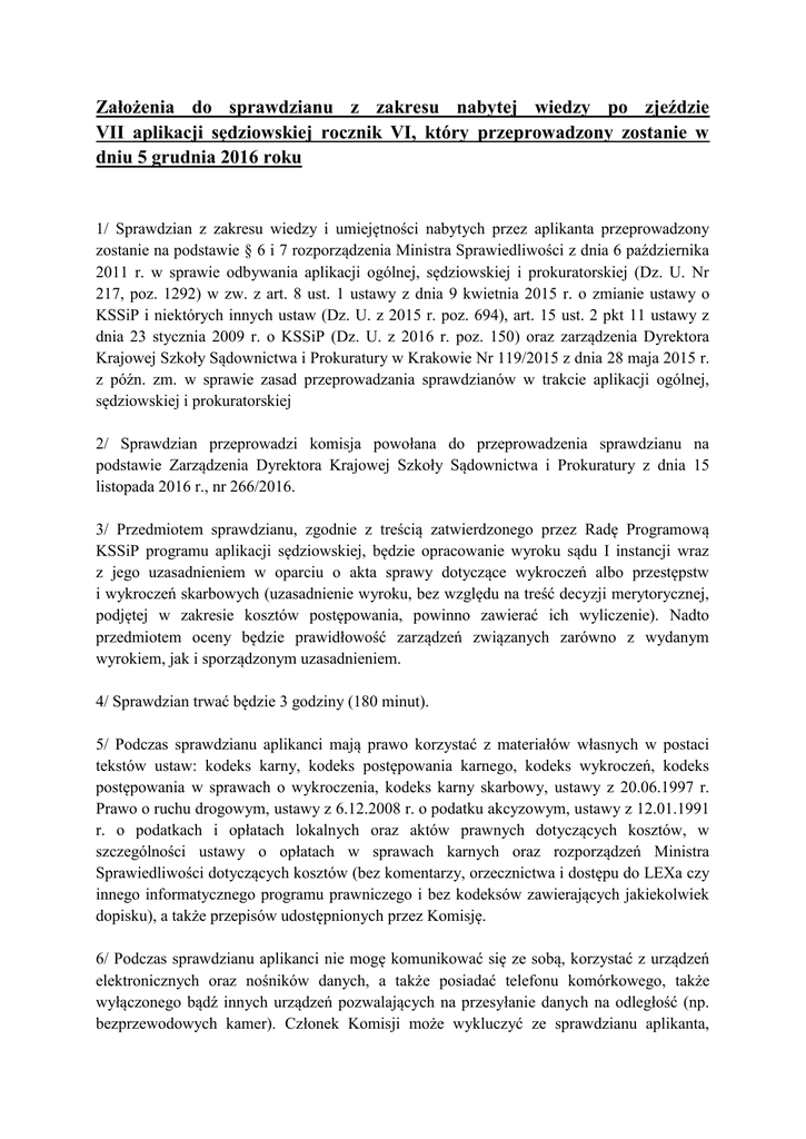 Założenia do sprawdzianu z zakresu nabytej wiedzy po zjeździe VII aplikacji sędziowskiej rocznik VI, który przeprowadzony zostanie w dniu 5 grudnia 2016 roku 1/ Sprawdzian z zakresu wiedzy i umiejętności nabytych przez aplikanta przeprowadzony zostanie na podstawie § 6 i 7 rozporządzenia Ministra Sprawiedliwości z dnia 6 października 2011 r. w sprawie odbywania aplikacji ogólnej, sędziowskiej i prokuratorskiej (Dz. U. Nr 217, poz. 1292) w zw. z art. 8 ust. 1 ustawy z dnia 9 kwietnia 2015 r. o zmianie ustawy o KSSiP i niektórych innych ustaw (Dz. U. z 2015 r. poz. 694), art. 15 ust. 2 pkt 11 ustawy z dnia 23 stycznia 2009 r. o KSSiP (Dz. U. z 2016 r. poz. 150) oraz zarządzenia Dyrektora Krajowej Szkoły Sądownictwa i Prokuratury w Krakowie Nr 119/2015 z dnia 28 maja 2015 r. z późn. zm. w sprawie zasad przeprowadzania sprawdzianów w trakcie aplikacji ogólnej, sędziowskiej i prokuratorskiej 2/ Sprawdzian przeprowadzi komisja powołana do przeprowadzenia sprawdzianu na podstawie Zarządzenia Dyrektora Krajowej Szkoły Sądownictwa i Prokuratury z dnia 15 listopada 2016 r., nr 266/2016. 3/ Przedmiotem sprawdzianu, zgodnie z treścią zatwierdzonego przez Radę Programową KSSiP programu aplikacji sędziowskiej, będzie opracowanie wyroku sądu I instancji wraz z jego uzasadnieniem w oparciu o akta sprawy dotyczące wykroczeń albo przestępstw i wykroczeń skarbowych (uzasadnienie wyroku, bez względu na treść decyzji merytorycznej, podjętej w zakresie kosztów postępowania, powinno zawierać ich wyliczenie). Nadto przedmiotem oceny będzie prawidłowość zarządzeń związanych zarówno z wydanym wyrokiem, jak i sporządzonym uzasadnieniem. 4/ Sprawdzian trwać będzie 3 godziny (180 minut). 5/ Podczas sprawdzianu aplikanci mają prawo korzystać z materiałów własnych w postaci tekstów ustaw: kodeks karny, kodeks postępowania karnego, kodeks wykroczeń, kodeks postępowania w sprawach o wykroczenia, kodeks karny skarbowy, ustawy z 20.06.1997 r. Prawo o ruchu drogowym, ustawy z 6.12.2008 r. o podatku akcyzowym, ustawy z 12.01.1991 r. o podatkach i opłatach lokalnych oraz aktów prawnych dotyczących kosztów, w szczególności ustawy o opłatach w sprawach karnych oraz rozporządzeń Ministra Sprawiedliwości dotyczących kosztów (bez komentarzy, orzecznictwa i dostępu do LEXa czy innego informatycznego programu prawniczego i bez kodeksów zawierających jakiekolwiek dopisku), a także przepisów udostępnionych przez Komisję. 6/ Podczas sprawdzianu aplikanci nie mogę komunikować się ze sobą, korzystać z urządzeń elektronicznych oraz nośników danych, a także posiadać telefonu komórkowego, także wyłączonego bądź innych urządzeń pozwalających na przesyłanie danych na odległość (np. bezprzewodowych kamer). Członek Komisji może wykluczyć ze sprawdzianu aplikanta, który w trakcie jego trwania komunikuje się z innymi zdającymi lub z osobami z zewnątrz, posiada urządzenie lub materiały, których posiadanie jest niedozwolone, bądź w inny sposób zakłóca przebieg sprawdzianu. 7/ Sprawdzian zostanie przeprowadzony w formie elektronicznej – przy użyciu sprzętu komputerowego Krajowej Szkoły 8/ W trakcie trwania sprawdzianu – po upływie 90 minut od jego rozpoczęcia - aplikanci mogą tylko w wyjątkowych wypadkach, uzasadnionych szczególnymi okolicznościami, pojedynczo opuszczać salę, po uzyskaniu zgody osoby nadzorującej, dopiero po zablokowaniu komputera. 9/ Orzeczenie, będące przedmiotem sprawdzianu, aplikanci opatrzą datą właściwą dla biegu postępowania wynikającego z akt sprawy oraz imionami i nazwiskami uczestniczących w nim osób. Stan faktyczny i prawny jest oceniany na podstawie stanu prawnego obowiązującego w dniu przeprowadzania sprawdzianu. 10/ Praca pisemna oceniana będzie przy uwzględnieniu w szczególności następujących kryteriów: A/ kryterium merytoryczne: a. trafność rozstrzygnięcia; b. prawidłowość zastosowania instytucji prawa materialnego; c. poprawność przyjętej kwalifikacji prawnej; d. prawidłowość zastosowania instytucji prawa procesowego; e. poprawność, kompleksowość i kompletność argumentacji w odniesieniu do przyjętego rozwiązania; f. poprawność przeprowadzonej oceny dowodów; g. umiejętność uwzględniania okoliczności faktycznych i prawnych; h. zdolność zwięzłego formułowania myśli we wszystkich elementach uzasadnienia, w tym zdolność ograniczenia do niezbędnego minimum rozważań o charakterze teoretycznym; i. szczególnie wyróżniająca się argumentacja prawnicza. B/ kryterium formalne: a. prawidłowość oznaczenia organu podejmującego decyzję oraz sygnatury akt sprawy; b. poprawność konstrukcji decyzji i jej uzasadnienia; c. zgodność przedstawionych danych z treścią akt. C/ kryterium językowe: a. poprawność użytego w pracy języka - w tym prawnego i prawniczego; b. styl wypowiedzi; c. czytelność pracy i jej strona graficzna; d. błędy ortograficzne oraz interpunkcyjne. 11/ Warunkiem zaliczenia sprawdzianu jest uzyskanie co najmniej 2 punktów. Od wystawionej przez Komisję oceny ze sprawdzianu nie przysługuje odwołanie. Do każdej pracy jest sporządzany arkusz oceny zawierający uzasadnienie wystawionej oceny, podlegający udostępnieniu zainteresowanemu aplikantowi. 12/ Aplikanci uczestniczący w sprawdzianie zobowiązani są zapoznać się z treścią i przestrzegać wszystkich postanowień zarządzenia Dyrektora Krajowej Szkoły Sądownictwa i Prokuratury w Krakowie Nr 119/2015 z dnia 28 maja 2015 r. z późn. zm. w sprawie zasad przeprowadzenia sprawdzianów w trakcie aplikacji ogólnej, sędziowskiej i prokuratorskiej. Komisja przeprowadzająca sprawdzian: S.S.O. dr Michał Błoński (przewodniczący) S.S.A. Marek Sulima S.S.O. Sławomir Siwierski
