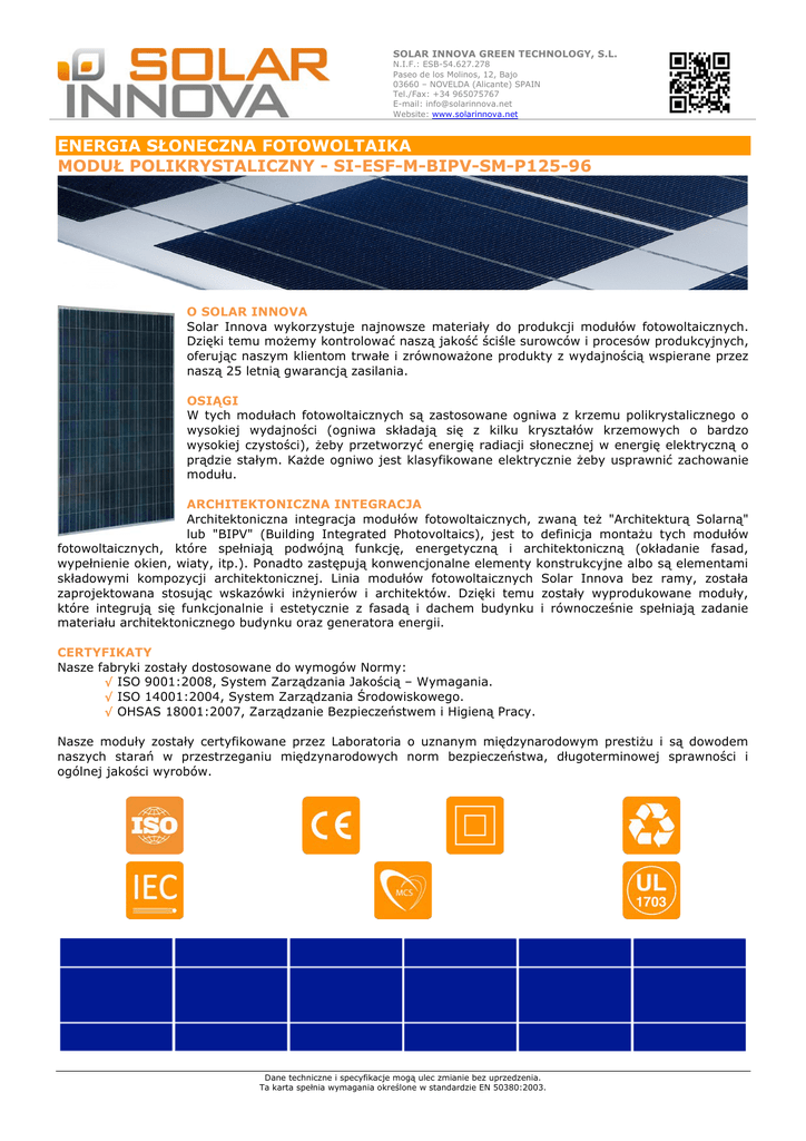 SOLAR INNOVA GREEN TECHNOLOGY, S.L. N.I.F.: ESB-54.627.278 Paseo de los Molinos, 12, Bajo 03660 – NOVELDA (Alicante) SPAIN Tel./Fax: +34 965075767 E-mail: [email protected] Website: www.solarinnova.net ENERGIA SŁONECZNA FOTOWOLTAIKA MODUŁ POLIKRYSTALICZNY - SI-ESF-M-BIPV-SM-P125-96 O SOLAR INNOVA Solar Innova wykorzystuje najnowsze materiały do produkcji modułów fotowoltaicznych. Dzięki temu możemy kontrolować naszą jakość ściśle surowców i procesów produkcyjnych, oferując naszym klientom trwałe i zrównoważone produkty z wydajnością wspierane przez naszą 25 letnią gwarancją zasilania. OSIĄGI W tych modułach fotowoltaicznych są zastosowane ogniwa z krzemu polikrystalicznego o wysokiej wydajności (ogniwa składają się z kilku kryształów krzemowych o bardzo wysokiej czystości), żeby przetworzyć energię radiacji słonecznej w energię elektryczną o prądzie stałym. Każde ogniwo jest klasyfikowane elektrycznie żeby usprawnić zachowanie modułu. ARCHITEKTONICZNA INTEGRACJA Architektoniczna integracja modułów fotowoltaicznych, zwaną też "Architekturą Solarną" lub "BIPV" (Building Integrated Photovoltaics), jest to definicja montażu tych modułów fotowoltaicznych, które spełniają podwójną funkcję, energetyczną i architektoniczną (okładanie fasad, wypełnienie okien, wiaty, itp.). Ponadto zastępują konwencjonalne elementy konstrukcyjne albo są elementami składowymi kompozycji architektonicznej. Linia modułów fotowoltaicznych Solar Innova bez ramy, została zaprojektowana stosując wskazówki inżynierów i architektów. Dzięki temu zostały wyprodukowane moduły, które integrują się funkcjonalnie i estetycznie z fasadą i dachem budynku i równocześnie spełniają zadanie materiału architektonicznego budynku oraz generatora energii. CERTYFIKATY Nasze fabryki zostały dostosowane do wymogów Normy: √ ISO 9001:2008, System Zarządzania Jakością – Wymagania. √ ISO 14001:2004, System Zarządzania Środowiskowego. √ OHSAS 18001:2007, Zarządzanie Bezpieczeństwem i Higieną Pracy. Nasze moduły zostały certyfikowane przez Laboratoria o uznanym międzynarodowym prestiżu i są dowodem naszych starań w przestrzeganiu międzynarodowych norm bezpieczeństwa, długoterminowej sprawności i ogólnej jakości wyrobów. Dane techniczne i specyfikacje mogą ulec zmianie bez uprzedzenia. Ta karta spełnia wymagania określone w standardzie EN 50380:2003. SOLAR INNOVA GREEN TECHNOLOGY, S.L. N.I.F.: ESB-54.627.278 Paseo de los Molinos, 12, Bajo 03660 – NOVELDA (Alicante) SPAIN Tel./Fax: +34 965075767 E-mail: [email protected] Website: www.solarinnova.net ENERGIA SŁONECZNA FOTOWOLTAIKA MODUŁ POLIKRYSTALICZNY - SI-ESF-M-BIPV-SM-P125-96 CECHY ELECTRYCZNE Moc maksymalna (Pmpp) [Wp] Tolerancja [Wp] 260 265 270 48,99 49,07 275 0~+5 Napięcie mocy maksymalnej (Vmpp) [V] 49,46 49,54 Natężenie mocy maksymalnej (Impp) [A] 5,31 5,40 5,46 5,55 Napięcie otwartego obwodu (Voc) [V] 60,48 60,58 61,06 61,16 Natężenie zwarciowe (Isc) [A] 5,63 5,64 5,72 5,75 Napięcie maksymalne systemu (Vsyst) [V] 600 (UL) / 1.000 (IEC) Bezpiecznik maksymalny w szeregu [A] 15 Współczynnik Formy [%] ≥ 73 CECHY MECHANICZNE Wysokość mm 1.574 Szerokość mm 1.063 Grubość mm 35 kg 21 Waga Część przednia Hartowane szkło o wysokiej przepuszczalności Materiał Część przednia-Grubość mm 4 ± 0,2 Ogniwa Typ Polikrystaliczny Ogniwa-Jedinice Ilość 8 x 12 Ogniwa-Rozmiary mm 125 x 125 Ogniwa-Połączenie szeregowe Ilość 96 Ogniwa-Połączenie równolegle Ilość 1 Hermetyzacja-przekładkowa Materiały Puszka łączeniowa Typ Puszka łączeniowa Izolacja Przewody Szyba/EVA/Ogniwa/EVA/TPT IP67 Przeciwko wilgoci oraz warunkom atmosferycznym Typ Symetryczne w długości Przewody-Długość mm 900 Przewody-Przekrój z miedzi mm2 4 Przewody Łączniki Niski opór przewodnictwa Minimalne straty przez spadek napięcia Cechy Typ MC4 CECHY TERMICZNE Współczynnik temperatury natężenia zwarciowego α (Isc) %/º C + 0,0825 Współczynnik temperatury napięcia otwartego obwodu β (Voc) %/º C - 0,4049 Współczynnik temperatury mocy γ (Pmpp) %/º C - 0,4336 Współczynnik temperatury maksymalnej mocy (Impp) %/º C + 0,10 Współczynnik temperatury napięcia maksymalnej mocy (Vmpp) %/º C - 0,38 NOCT (Znamionowa Temperatura Pracy Ogniwa) ºC + 47 ± 2 GWARANCJE Gwarancja na wady fabryczne Gwarancja wydajności Lata 12 Minimalna Moc Znamionowa Wyjściowa 90 % na 10 lat, %/Rok 80 % na 25 lat. Dane techniczne i specyfikacje mogą ulec zmianie bez uprzedzenia. Ta karta spełnia wymagania określone w standardzie EN 50380:2003.