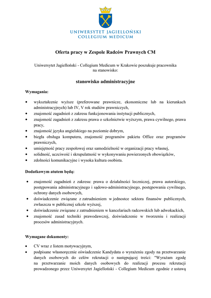 Oferta pracy w Zespole Radców Prawnych CM Uniwersytet Jagielloński - Collegium Medicum w Krakowie poszukuje pracownika na stanowisko: stanowisko administracyjne Wymagania: • • • • • • • • wykształcenie wyższe (preferowane prawnicze, ekonomiczne lub na kierunkach administracyjnych) lub IV, V rok studiów prawniczych, znajomość zagadnień z zakresu funkcjonowania instytucji publicznych, znajomość zagadnień z zakresu prawa o szkolnictwie wyższym, prawa cywilnego, prawa pracy, znajomość języka angielskiego na poziomie dobrym, biegła obsługa komputera, znajomość programów pakietu Office oraz programów prawniczych, umiejętność pracy zespołowej oraz samodzielność w organizacji pracy własnej, solidność, uczciwość i skrupulatność w wykonywaniu powierzonych obowiązków, zdolności komunikacyjne i wysoka kultura osobista. Dodatkowym atutem będą: • • • • znajomość zagadnień z zakresu: prawa o działalności leczniczej, prawa autorskiego, postępowania administracyjnego i sądowo-administracyjnego, postępowania cywilnego, ochrony danych osobowych, doświadczenie związane z zatrudnieniem w jednostce sektora finansów publicznych, zwłaszcza w publicznej szkole wyższej, doświadczenie związane z zatrudnieniem w kancelariach radcowskich lub adwokackich, znajomość zasad techniki prawodawczej, doświadczenie w tworzeniu i realizacji procesów administracyjnych. Wymagane dokumenty: CV wraz z listem motywacyjnym, podpisane własnoręcznie oświadczenie Kandydata o wyrażeniu zgody na przetwarzanie danych osobowych do celów rekrutacji o następującej treści: "Wyrażam zgodę na przetwarzanie moich danych osobowych do realizacji procesu rekrutacji prowadzonego przez Uniwersytet Jagielloński - Collegium Medicum zgodnie z ustawą z dnia 29 sierpnia 1997 r. o ochronie danych osobowych (tekst jedn. Dz. U. z 2016, poz. 922)". Do dokumentów aplikacyjnych należy dołączyć podpisany skan, oryginał winien być dostarczony na rozmowę kwalifikacyjną. Zainteresowane osoby prosimy o składanie dokumentów w nieprzekraczalnym terminie do dnia 16 grudnia 2016 r. do godz. 12.00 na adres email: [email protected]. Dokumenty zgłoszone w terminie późniejszym nie będą uwzględniane w procesie rekrutacji.