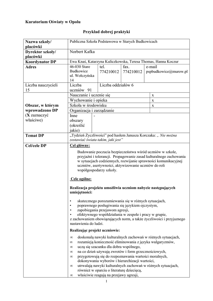 Kuratorium Oświaty w Opolu Przykład dobrej praktyki Nazwa szkoły/ placówki Dyrektor szkoły/ placówki Koordynator DP Adres Liczba nauczycieli 15 Obszar, w którym wprowadzono DP (X zaznaczyć właściwe) Temat DP Cel/cele DP Publiczna Szkoła Podstawowa w Starych Budkowicach Norbert Kafka Ewa Knaś, Katarzyna Kuliczkowska, Teresa Thomas, Hanna Koczur 46-030 Stare tel. fax. e-mail Budkowice 774210012 774210012 [email protected] ul. Wołczyńska 14 Liczba Liczba oddziałów 6 uczniów 91 Nauczanie i uczenie się Wychowanie i opieka Szkoła w środowisku Organizacja i zarządzanie Inne obszary (określić jakie) x x x „Tydzień Życzliwości” pod hasłem Janusza Korczaka: „ Nie można zostawiać świata takim, jaki jest” Cel główny: Budowanie poczucia bezpieczeństwa wśród uczniów w szkole, przyjaźni i tolerancji. Propagowanie zasad kulturalnego zachowania w sytuacjach codziennych, rozwijanie sprawności komunikacyjnej uczniów, asertywności, aktywizowanie uczniów do roli współgospodarzy szkoły. Cele ogólne: Realizacja projektu umożliwia uczniom nabycie następujących umiejętności: • skutecznego porozumiewania się w różnych sytuacjach, • poprawnego posługiwania się językiem ojczystym, • zapobiegania przejawom agresji, • efektywnego współdziałania w zespole i pracy w grupie, z zachowaniem obowiązujących norm, a także życzliwości i przyjaznego nastawienia do ludzi. Realizując projekt uczniowie: • • • • • • • doskonalą nawyki kulturalnych zachowań w różnych sytuacjach, rozumieją konieczność eliminowania z języka wulgaryzmów, uczą się szacunku dla dobra wspólnego, na co dzień używają zwrotów i form grzecznościowych, przygotowują się do rozpoznawania wartości moralnych, dokonywania wyborów i hierarchizacji wartości, utrwalają nawyki kulturalnych zachowań w różnych sytuacjach, również w oparciu o literaturę dziecięcą, właściwie reagują na przejawy agresji, 1 • • kształtują postawę dialogu, umiejętność słuchania innych i rozumienia ich poglądów, uczą się rozładowywać emocje poprzez zabawę i sport. Cele szczegółowe: W wyniku szeregu działań, uczeń potrafi: • kulturalnie zachować się w sytuacjach dnia codziennego w szkole i poza nią, • stosować najprostsze wyrazy uprzejmości w kontaktach międzyludzkich, • akceptować i naśladować pozytywne wzorce zachowania: umiejętność prowadzenia rozmowy, uprzejmość, umiejętność słuchania, punktualność, słowność, asertywność, • wyjaśnić, dlaczego nie należy używać wulgarnych słów, • wyeliminować wulgaryzmy ze swojego języka, • dobrać stosowny ubiór w zależności od okoliczności, • organizować czas podczas przerw szkolnych i po zajęciach lekcyjnych, • aktywnie spędzać czas wolny, • podzielić się refleksjami na temat kulturalnych zdarzeń w szkole, • współdziałać w zespole, wspólnie podejmować decyzje, planować i organizować swoją pracę, być tolerancyjnym. Koncepcja zmian Metody realizacji Uczestnicy i ich rola w DP Zaangażowane środki a) osobowe b) materialne Środki finansowe Czas realizacji Efekty Krótki opis DP Na podstawie obserwacji i diagnozy uczniów oraz w oparciu o raport z ewaluacji wewnętrznej wynikało, iż należy z większym zaangażowaniem zapewnić bezpieczeństwo uczniom w szkole i poza nią. W związku z tym coroczna akcja jest poszerzana o nowe doświadczenia i wzbogacana o nowe pomysły uczniów. Przede wszystkim celem projektu było budowanie bezpieczeństwa wśród uczniów, wyposażenie dzieci w niezbędną wiedzę na temat kulturalnego zachowania się w sytuacjach dnia codziennego, zgodnego z zasadami współżycia społecznego. W szczególności zwracana była uwaga na poznawanie i przestrzeganie norm społecznych. 1. Zajęcia profilaktyczne z udziałem przedstawiciela KMP w Opolu. 2. Warsztaty plastyczne. 3. Warsztaty teatralne. 4. Inscenizacje; metoda dramy. 5. Zabawy ruchowe i sportowe Wszyscy uczniowie klas I-VI w roli gospodarzy projektu. Nauczyciele w roli wspierających działania uczniów. W realizację projektu zaangażowani byli wszyscy uczniowie oraz nauczyciele. Środkami materialnymi były, nagrody rzeczowe, dyplomy, medale wykonane przez uczniów z masy solnej, dekoracje. Nagrody rzeczowe ufundowane zostały ze środków pozyskanych od Gminnej Komisji do Spraw Rozwiązywania Problemów Alkoholowych. Projekt realizowany jest już piąty rok szkolny. W tym roku był realizowany 15-19 kwietnia 2013r. Korzyści zastosowania DP: Ten tydzień był dla uczniów wspaniałą i pouczającą zabawą. 2 Wspólne działania sprawiły, iż uczniowie potrafili razem angażować się w wiele zadań, byli kreatywni i pomysłowi. Wzajemnie się szanowali byli życzliwi i pomocni. Uczniowie zwracali uwagę na zachowanie swoje oraz kolegów i koleżanek. Dlatego warto podejmować tego rodzaju działania profilaktyczne. Wpływ na uczniów Dzięki działaniom, wspólnej pracy wzmocniła się więź między uczniami w klasie i w szkole. Uczniowie zdobyli wiedzę o tym, jak nie należy się zachowywać, jak zapobiegać agresji. Dzieci przekonały się, że zabawa jest dobrym sposobem na rozładowanie emocji. Ten tydzień na pewno wpłynął na poprawę relacji koleżeńskich i atmosferę w szkole. Sprawił, że wszyscy się w niej dobrze i bezpiecznie czuli. Każdy z uczniów mógł poszerzać swoje zainteresowania w wielu dziedzinach aktywności społecznej. Wpływ na pracę szkoły Realizacja projektu trwała tydzień. Uczniowie samodzielnie zgłaszali swoje propozycje, chętnie podejmowali działania, wspólnie organizowali swoją pracę i przyczynili się do stworzenia przyjaznej, miłej atmosfery, życzliwego nastawienia do ludzi i właściwych relacji w szkole. Wpływ na środowisko lokalne Formy monitorowania, metoda pomiaru wyników DP Działania, które się sprawdziły Wnioski, uwagi, trudności w realizacji DP Załączniki (np. prezentacja) A