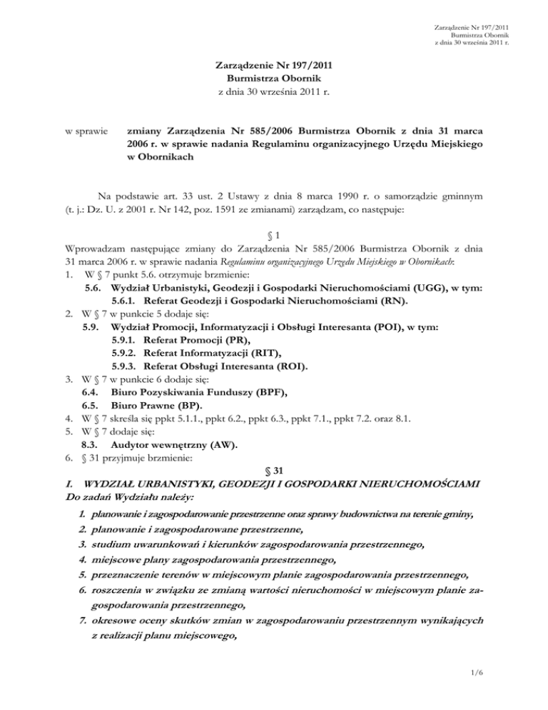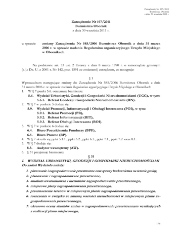 Zarządzenie Nr 197/2011 Burmistrza Obornik z dnia 30 września 2011 r. Zarządzenie Nr 197/2011 Burmistrza Obornik z dnia 30 września 2011 r. w sprawie zmiany Zarządzenia Nr 585/2006 Burmistrza Obornik z dnia 31 marca 2006 r. w sprawie nadania Regulaminu organizacyjnego Urzędu Miejskiego w Obornikach Na podstawie art. 33 ust. 2 Ustawy z dnia 8 marca 1990 r. o samorządzie gminnym (t. j.: Dz. U. z 2001 r. Nr 142, poz. 1591 ze zmianami) zarządzam, co następuje: §1 Wprowadzam następujące zmiany do Zarządzenia Nr 585/2006 Burmistrza Obornik z dnia 31 marca 2006 r. w sprawie nadania Regulaminu organizacyjnego Urzędu Miejskiego w Obornikach: 1. W § 7 punkt 5.6. otrzymuje brzmienie: 5.6. Wydział Urbanistyki, Geodezji i Gospodarki Nieruchomościami (UGG), w tym: 5.6.1. Referat Geodezji i Gospodarki Nieruchomościami (RN). 2. W § 7 w punkcie 5 dodaje się: 5.9. Wydział Promocji, Informatyzacji i Obsługi Interesanta (POI), w tym: 5.9.1. Referat Promocji (PR), 5.9.2. Referat Informatyzacji (RIT), 5.9.3. Referat Obsługi Interesanta (ROI). 3. W § 7 w punkcie 6 dodaje się: 6.4. Biuro Pozyskiwania Funduszy (BPF), 6.5. Biuro Prawne (BP). 4. W § 7 skreśla się ppkt 5.1.1., ppkt 6.2., ppkt 6.3., ppkt 7.1., ppkt 7.2. oraz 8.1. 5. W § 7 dodaje się: 8.3. Audytor wewnętrzny (AW). 6. § 31 przyjmuje brzmienie: § 31 I. WYDZIAŁ URBANISTYKI, GEODEZJI I GOSPODARKI NIERUCHOMOŚCIAMI Do zadań Wydziału należy: planowanie i zagospodarowanie przestrzenne oraz sprawy budownictwa na terenie gminy, planowanie i zagospodarowane przestrzenne, studium uwarunkowań i kierunków zagospodarowania przestrzennego, miejscowe plany zagospodarowania przestrzennego, przeznaczenie terenów w miejscowym planie zagospodarowania przestrzennego, roszczenia w związku ze zmianą wartości nieruchomości w miejscowym planie zagospodarowania przestrzennego, 7. okresowe oceny skutków zmian w zagospodarowaniu przestrzennym wynikających z realizacji planu miejscowego, 1. 2. 3. 4. 5. 6. 1/6 Zarządzenie Nr 197/2011 Burmistrza Obornik z dnia 30 września 2011 r. 8. wydawanie wypisów, wyrysów, zaświadczeń itp. w zakresie planowania i zagospodarowania przestrzennego, 9. ustalanie warunków zabudowy i zagospodarowania terenu, 10. wstrzymywanie użytkowania terenu oraz przywracanie poprzedniego sposobu zagospodarowania, 11. stwierdzanie wygaśnięcia decyzji o warunkach zabudowy i zagospodarowania terenu, 12. ustalanie lokalizacji inwestycji celu publicznego, II. REFERAT GOSPODARKI NIERUCHOMOŚCIAMI (RN) Do zadań Referatu należy: ustalanie i zmiany nazw miejscowości i obiektów fizjograficznych, opłata adiacencka, zabytki nieruchome, współdziałanie z wojewódzkim konserwatorem zabytków i otrzymywanie informacji z rejestrów zabytków, 5. numeracja porządkowa nieruchomości, 6. nazewnictwo placów i ulic, 7. przeznaczenie terenów w miejscowym planie zagospodarowania przestrzennego, 8. ewidencja nieruchomości, 9. inwentaryzowanie nieruchomości, 10. oszacowanie wartości i wycena nieruchomości, 11. przejmowanie nieruchomości na rzecz gminy, 12. zakup nieruchomości, 13. komunalizacja mienia Skarbu Państwa, 14. przekształcanie prawa użytkowania wieczystego w prawo własności, 15. rozgraniczanie, scalanie i podział nieruchomości, 16. odszkodowania za nieruchomości przejęte pod drogi publiczne, 17. sprzedaż nieruchomości, 18. oddawanie nieruchomości w użytkowanie wieczyste, 19. rozwiązywanie i wygaszanie umów użytkowania wieczystego, 20. opłaty za użytkowanie wieczyste, 21. oddawanie nieruchomości w trwały zarząd, 22. przekazywanie nieruchomości do korzystania, w tym w dzierżawę lub najem, 23. służebności gruntowe, 24. użyczanie nieruchomości, 25. udostępnianie nieruchomości pod lokalizację nośników reklamowych, 26. zezwolenia na czasowe zajęcie nieruchomości, 27. zezwolenia na zakładanie, przeprowadzanie i wykonanie na nieruchomościach urządzeń technicznych. 1. 2. 3. 4. 2/6 Zarządzenie Nr 197/2011 Burmistrza Obornik z dnia 30 września 2011 r. 7. W § 32 w zakresie Referatu Obsługi Inwestycji skreśla się punkt 2. 8. Dodaje się § 32 a w brzmieniu: § 32 a BIURO POZYSKIWANIA FUNDUSZY: Do zadań Biura należy: w zakresie pozyskiwania funduszy: 1. ubieganie się oraz rozliczanie dotacji, pożyczek i innych form dofinansowania zadań ze środków zewnętrznych, 2. przygotowywanie oraz rozliczanie wniosków do wskazanych funduszy dla określonych rzeczowo zadań, 3. współpraca z jednostkami organizacyjnymi i pomocniczymi Gminy polegająca na udzielaniu pomocy przy pozyskiwaniu różnych form dofinansowania. 9. Skreśla się § 38. 10. Dodaje § 38 a w brzmieniu: § 38 a I. WYDZIAŁ PROMOCJI, INFORMATYZACJI I OBSŁUGI INTERESANTA Do zadań Wydziału należy: 1. opracowywanie procedur realizacji zadań referatów, 2. przygotowywanie projektów uchwał Rady Miejskiej i zarządzeń Burmistrza Obornik w zakresie zadań wydziału, 3. opracowywanie materiałów do projektów budżetu wydziału, 4. bieżąca kontrola wykonania budżetu wydziału, 5. nadzór nad realizacją zadań wykonywanych przez referaty. II. REFERAT PROMOCJI: Do zadań Referatu należy: 1. gromadzenie informacji o gospodarce, turystyce i wydarzeniach w Gminie Oborniki, 2. organizowanie obchodów rocznic i uroczystości okolicznościowych związanych z życiem społeczno-gospodarczym i kulturalnym mieszkańców Gminy, 3. prowadzenie korespondencji okolicznościowej, 4. utrzymywanie bieżących kontaktów z przedstawicielami środków masowego przekazu w zakresie określonym przez Burmistrza, 5. koordynowanie prac i współdziałanie przy organizowaniu imprez, wystaw i uroczystości gminnych, 6. przygotowywanie materiałów promocyjnych i współpraca z wydawnictwami, 7. prowadzenie spraw dotyczących współpracy z zagranicą, 8. gromadzenie informacji o zjawiskach społecznych i gospodarczych występujących na obszarze Gminy i gmin sąsiednich, 9. organizowanie spotkań Burmistrza z przedstawicielami or