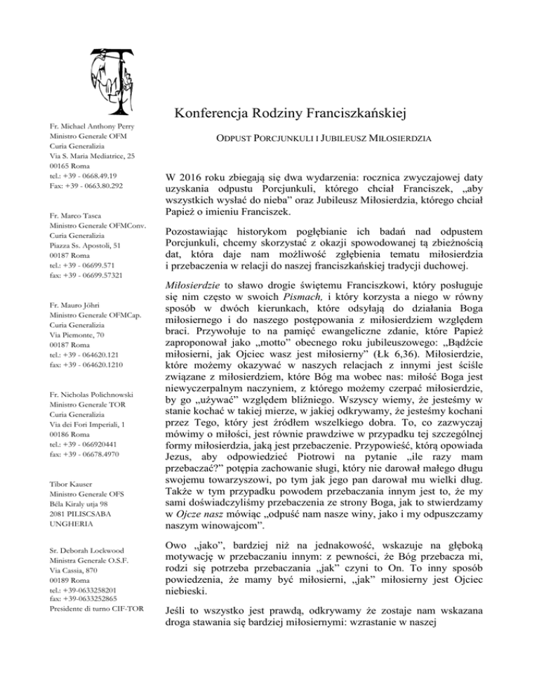 Fr. Michael Anthony Perry Ministro Generale OFM Curia Generalizia Via S. Maria Mediatrice, 25 00165 Roma tel.: +39 - 0668.49.19 Fax: +39 - 0663.80.292 Fr. Marco Tasca Ministro Generale OFMConv. Curia Generalizia Piazza Ss. Apostoli, 51 00187 Roma tel.: +39 - 06699.571 fax: +39 - 06699.57321 Fr. Mauro Jöhri Ministro Generale OFMCap. Curia Generalizia Via Piemonte, 70 00187 Roma tel.: +39 - 064620.121 fax: +39 - 064620.1210 Fr. Nicholas Polichnowski Ministro Generale TOR Curia Generalizia Via dei Fori Imperiali, 1 00186 Roma tel.: +39 - 066920441 fax: +39 - 06678.4970 Tibor Kauser Ministro Generale OFS Béla Kiraly utja 98 2081 PILISCSABA UNGHERIA Sr. Deborah Lockwood Ministra Generale O.S.F. Via Cassia, 870 00189 Roma tel.: +39-0633258201 fax: +39-0633252865 Presidente di turno CIF-TOR Konferencja Rodziny Franciszkańskiej ODPUST PORCJUNKULI I JUBILEUSZ MIŁOSIERDZIA W 2016 roku zbiegają się dwa wydarzenia: rocznica zwyczajowej daty uzyskania odpustu Porcjunkuli, którego chciał Franciszek, „aby wszystkich wysłać do nieba” oraz Jubileusz Miłosierdzia, którego chciał Papież o imieniu Franciszek. Pozostawiając historykom pogłębianie ich badań nad odpustem Porcjunkuli, chcemy skorzystać z okazji spowodowanej tą zbieżnością dat, która daje nam możliwość zgłębienia tematu miłosierdzia i przebaczenia w relacji do naszej franciszkańskiej tradycji duchowej. Miłosierdzie to sławo drogie świętemu Franciszkowi, który posługuje się nim często w swoich Pismach, i który korzysta a niego w równy sposób w dwóch kierunkach, które odsyłają do działania Boga miłosiernego i do naszego postępowania z miłosierdziem względem braci. Przywołuje to na pamięć ewangeliczne zdanie, które Papież zaproponował jako „motto” obecnego roku jubileuszowego: „Bądźcie miłosierni, jak Ojciec wasz jest miłosierny” (Łk 6,36). Miłosierdzie, które możemy okazywać w naszych relacjach z innymi jest ściśle związane z miłosierdziem, które Bóg ma wobec nas: miłość Boga jest niewyczerpalnym naczyniem, z którego możemy czerpać miłosierdzie, by go „używać” względem bliźniego. Wszyscy wiemy, że jesteśmy w stanie kochać w takiej mierze, w jakiej odkrywamy, że jesteśmy kochani przez Tego, który jest źródłem wszelkiego dobra. To, co zazwyczaj mówimy o miłości, jest równie prawdziwe w przypadku tej szczególnej formy miłosierdzia, jaką jest przebaczenie. Przypowieść, którą opowiada Jezus, aby odpowiedzieć Piotrowi na pytanie „ile razy mam przebaczać?” potępia zachowanie sługi, który nie darował małego długu swojemu towarzyszowi, po tym jak jego pan darował mu wielki dług. Także w tym przypadku powodem przebaczania innym jest to, że my sami doświadczyliśmy przebaczenia ze strony Boga, jak to stwierdzamy w Ojcze nasz mówiąc „odpuść nam nasze winy, jako i my odpuszczamy naszym winowajcom”. Owo „jako”, bardziej niż na jednakowość, wskazuje na głęboką motywację w przebaczaniu innym: z pewności, że Bóg przebacza mi, rodzi się potrzeba przebaczania „jak” czyni to On. To inny sposób powiedzenia, że mamy być miłosierni, „jak” miłosierny jest Ojciec niebieski. Jeśli to wszystko jest prawdą, odkrywamy że zostaje nam wskazana droga stawania się bardziej miłosiernymi: wzrastanie w naszej świadomości, że my sami jesteśmy umiłowani przez Boga. Chodzi o tę relację pomiędzy darem otrzymanym od Boga i darem ofiarowanym braciom, która jest tak charakterystyczna dla franciszkańskiego duchowego doświadczenia. W mierze w jakiej my, jak Franciszek, odkrywamy, że Bóg „jest dobrem, wszelkim dobrem, całym dobrem i że tylko On jest dobry”, wzrasta w nas potrzeba odpowiedzi na to dobro, które otrzymujemy, ofiarowując dobro, do którego jesteśmy zdolni. A ponieważ dla stania się bardziej świadomym miłości, jaką Bóg ma w stosunku do mnie muszę zatrzymać się na chwilę i pomyśleć, zdajemy sobie sprawę, że po raz kolejny jesteśmy zachęcani do kultywowania ducha modlitwy i pobożności, do połączenia kontemplacji i działania, jeśli chcemy odnaleźć prawdziwe źródło naszego zaangażowania i naszej miłości ku bliźnim, dla odnalezienia siły i energii w oddawaniu całego naszego życia braciom i dla tworzenia wokół siebie pokoju i pojednania, które są owocami kontemplowanej miłości. Swoją prośbą skierowaną do Papieża o uzyskanie nadzwyczajnego odpustu dla małego kościółka Porcjunkuli Franciszek wymyślił nowy sposób celebrowania nadmiaru przebaczenia i miłosierdzia wobec nas ze strony Boga. Możemy podjąć i zgłębić piękną definicję odpustu, którą podarował nam Papież w Misericordiae vultus, stwierdzając, że „staje się ono odpustem Ojca, który poprzez Kościół — Oblubienicę Chrystusa — dociera do grzesznika, któremu udzielił już przebaczenia, i uwalnia go od wszelkich pozostałości skutków grzechu, pozwalając mu działać z miłością oraz wzrastać w miłości, zamiast ponownie popaść w grzech” (22). Za każdym razem, gdy otrzymujemy ten nadzwyczajny odpust Ojca przez posługę Kościoła, także my doświadczamy nadmiaru miłosierdzia nad nami, by stawać się zdolnymi do miłosierdzia i do pojednania względem innych, w konkretnych życiowych sytuacjach. Franciszek pokazuje nam wspaniałe przykłady tej twórczej zdolności promowania pokoju i pojednania. Pomyślmy choćby o epizodzie z ostatnich lat jego życia, kiedy to nakazał odśpiewać swoją Pieśń słoneczną dodając w niej zwrotkę o pojednaniu, i w ten sposób doprowadził do zgody między burmistrzem i biskupem Asyża. Dawny biograf na początku tego opowiadania przypomina nam, co Franciszek powiedział do swoich towarzyszy: „Wielki to wstyd dla was, sług Bożych, że biskup i burmistrz tak się nawzajem nienawidzą, a nikt nie zabiega o ich pokój i zgodę” (ZA 84). Franciszek nie uważa, że jest to sprawa, która go nie dotyczy i odczu