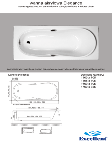 wanna akrylowa Elegance Wanna wyposażona jest standardowo w uchwyty metalowe w kolorze chrom zaprezentowany na zdjęciu system odpływowy nie należy do standardowego wyposażenia wanny Dane techniczne: Dostępne rozmiary: 1400 x 705 1495 x 705 1600 x 705 1700 x 755 705, 705, 705, 755 230, 250, 250, 320 1400, 1495, 1600, 1700 900, 1000, 1100, 1200 410 290 530 1200, 1300, 1400, 1500 40 BATERIA NAWANNOWA
