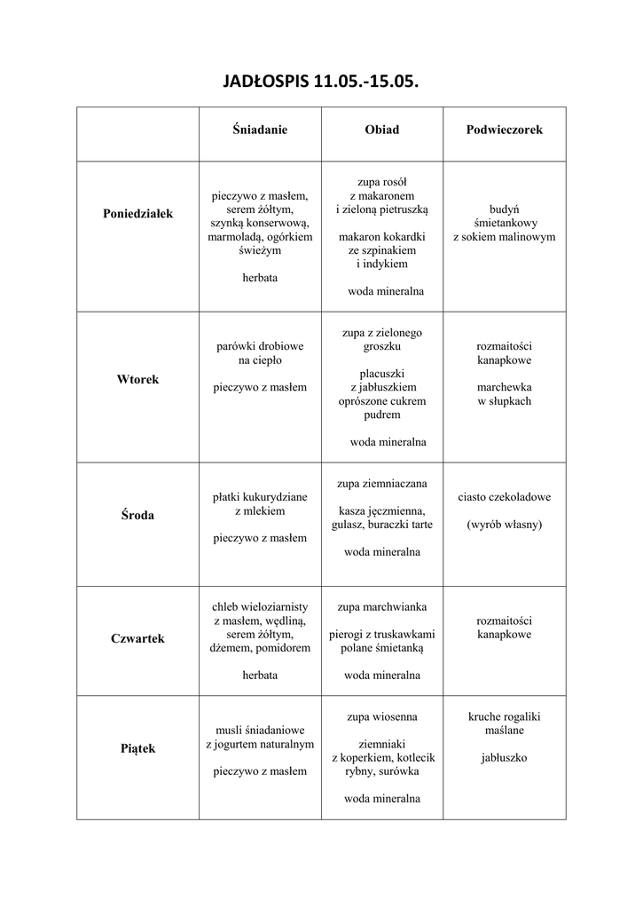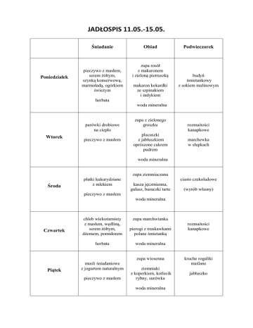 JADŁOSPIS 11.05.-15.05. Śniadanie Poniedziałek pieczywo z masłem, serem żółtym, szynką konserwową, marmoladą, ogórkiem świeżym Obiad zupa rosół z makaronem i zieloną pietruszką makaron kokardki ze szpinakiem i indykiem Podwieczorek budyń śmietankowy z sokiem malinowym herbata woda mineralna parówki drobiowe na ciepło Wtorek pieczywo z masłem zupa z zielonego groszku placuszki z jabłuszkiem oprószone cukrem pudrem rozmaitości kanapkowe marchewka w słupkach woda mineralna zupa ziemniaczana Środa płatki kukurydziane z mlekiem ciasto czekoladowe kasza jęczmienna, gulasz, buraczki tarte (wyrób własny) pieczywo z masłem woda mineralna Czwartek chleb wieloziarnisty z masłem, wędliną, serem żółtym, dżemem, pomidorem zupa marchwianka pierogi z truskawkami polane śmietanką herbata woda mineralna zupa wiosenna Piątek musli śniadaniowe z jogurtem naturalnym pieczywo z masłem ziemniaki z koperkiem, kotlecik rybny, surówka woda mineralna rozmaitości kanapkowe kruche rogaliki maślane jabłuszko