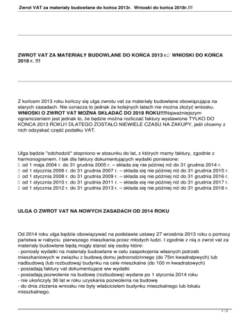 Zwrot VAT za materiały budowlane do końca 2013r. Wnioski do końca 2018r.!!! ZWROT VAT ZA MATERIAŁY BUDOWLANE DO KOŃCA 2013 r. WNIOSKI DO KOŃCA 2018 r. !!! Z końcem 2013 roku kończy się ulga zwrotu vat za materiały budowlane obowiązująca na starych zasadach. Nie oznacza to jednak że kolejnych latach nie można złożyć wniosku. WNIOSKI O ZWROT VAT MOŻNA SKŁADAĆ DO 2018 ROKU!!!Najważniejszym ograniczeniem jest jednak to, że będzie można rozliczać faktury wystawione TYLKO DO KONCA 2013 ROKU!! DLATEGO ZOSTAŁO NIEWIELE CZASU NA ZAKUPY, jeśli chcemy z nich odzyskać część podatku VAT. Ulga będzie "odchodzić" stopniono w stosunku do lat, z których mamy faktury, zgodnie z harmonogramem. I tak dla faktury dokumentujących wydatki poniesione: ● od 1 maja 2004 r. do 31 grudnia 2005 r. – składa się nie później niż do 31 grudnia 2014 r. ● od 1 stycznia 2006 r. do 31 grudnia 2007 r. – składa się nie później niż do 31 grudnia 2015 r. ● od 1 stycznia 2008 r. do 31 grudnia 2009 r. – składa się nie później niż do 31 grudnia 2016 r. ● od 1 stycznia 2010 r. do 31 grudnia 2011 r. – składa się nie później niż do 31 grudnia 2017 r. ● od 1 stycznia 2012 r. do 31 grudnia 2013 r. – składa się nie później niż do 31 grudnia 2018 r. ULGA O ZWROT VAT NA NOWYCH ZASADACH OD 2014 ROKU Od 2014 roku ulga będzie obowiązywać na podstawie ustawy 27 września 2013 roku o pomocy państwa w nabyciu pierwszego mieszkania przez młodych ludzi. I zgodnie z nią o zwrot vat za materiały budowlane będą mogły starać się osoby które: - poniosły wydatki na materialy budowlane w celu zaspokojenia własnych potrzeb mieszkaniowych w zwiazku z budową domu jednorodzinnego (do 75m kwadratpwych) lub nadbudową (lub rozbudową) budynku na cele mieszkalne (do 100 m kwadratowych) - posiadają faktury vat dokumentujace ww wydatki - posiadają pozwolenie na budowę (rozbudowę) wydane po 1 stycznia 2014 roku - nie ukończyły 36 lat w roku uzyskania pozwolenia na budowę - do dnia zlożenia wniosku nie były właścicielem budynku mieszkalnego lub lokalu mieszkalnego. 1/2 Zwrot VAT za materiały budowlane do końca 2013r. Wnioski do końca 2018r.!!! 2/2