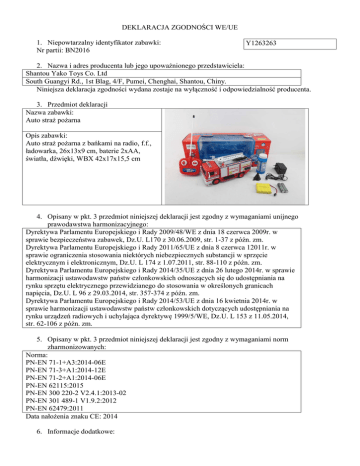 DEKLARACJA ZGODNOŚCI WE/UE 1. Niepowtarzalny identyfikator zabawki: Nr partii: BN2016 Y1263263 2. Nazwa i adres producenta lub jego upoważnionego przedstawiciela: Shantou Yako Toys Co. Ltd South Guangyi Rd., 1st Blag, 4/F, Pumei, Chenghai, Shantou, Chiny. Niniejsza deklaracja zgodności wydana zostaje na wyłączność i odpowiedzialność producenta. 3. Przedmiot deklaracji Nazwa zabawki: Auto straż pożarna Opis zabawki: Auto straż pożarna z bańkami na radio, f.f., ładowarka, 26x13x9 cm, baterie 2xAA, światła, dźwięki, WBX 42x17x15,5 cm 4. Opisany w pkt. 3 przedmiot niniejszej deklaracji jest zgodny z wymaganiami unijnego prawodawstwa harmonizacyjnego: Dyrektywa Parlamentu Europejskiego i Rady 2009/48/WE z dnia 18 czerwca 2009r. w sprawie bezpieczeństwa zabawek, Dz.U. L170 z 30.06.2009, str. 1-37 z późn. zm. Dyrektywa Parlamentu Europejskiego i Rady 2011/65/UE z dnia 8 czerwca 12011r. w sprawie ograniczenia stosowania niektórych niebezpiecznych substancji w sprzęcie elektrycznym i elektronicznym, Dz.U. L 174 z 1.07.2011, str. 88-110 z późn. zm. Dyrektywa Parlamentu Europejskiego i Rady 2014/35/UE z dnia 26 lutego 2014r. w sprawie harmonizacji ustawodawstw państw członkowskich odnoszących się do udostępniania na rynku sprzętu elektrycznego przewidzianego do stosowania w określonych granicach napięcia, Dz.U. L 96 z 29.03.2014, str. 357-374 z późn. zm. Dyrektywa Parlamentu Europejskiego i Rady 2014/53/UE z dnia 16 kwietnia 2014r. w sprawie harmonizacji ustawodawstw państw członkowskich dotyczących udostępniania na rynku urządzeń radiowych i uchylająca dyrektywę 1999/5/WE, Dz.U. L 153 z 11.05.2014, str. 62-106 z późn. zm. 5. Opisany w pkt. 3 przedmiot niniejszej deklaracji jest zgodny z wymaganiami norm zharmonizowanych: Norma: PN-EN 71-1+A3:2014-06E PN-EN 71-3+A1:2014-12E PN-EN 71-2+A1:2014-06E PN-EN 62115:2015 PN-EN 300 220-2 V2.4.1:2013-02 PN-EN 301 489-1 V1.9.2:2012 PN-EN 62479:2011 Data nałożenia znaku CE: 2014 6. Informacje dodatkowe: Dokument odniesienia: Rozporządzenie (WE) Parlamentu europejskiego i Rady nr 1907/2006 REACH – Aneks XVII, Dz.U. L 396 z 30.12.2006, str. 1-794 wraz z późn. zm. Miejsce: Shantou Data wystawienia deklaracji: 02.05.2016 Menadżer sprzedaży Imię i nazwisko: Jamy Wong