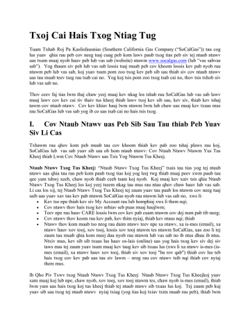 Txoj Cai Hais Txog Ntiag Tug Tuam Txhab Roj Pa Kaslisfausnias (Southern California Gas Company (“SoCalGas”)) tau cog lus yuav qhia rau peb cov neeg tuaj cuag peb kom lawv paub txog tias peb siv tej ntaub ntawv uas txum muaj nyob hauv peb lub vas sab (website) ntawm www.socalgas.com (lub “vas sabvas sab”). Yog thaum siv peb lub vas sab lossis tuaj muab peb cov khoom lossis kev pab nyob rau ntawm peb lub vas sab, koj yuav tsum pom zoo txog kev peb sib sau thiab siv cov ntaub ntawv uas tau muab teev tseg rau tsab cai no. Yog koj tsis pom zoo txog tsab cai no, thov tsis txhob siv lub vas sab no. Thov ceev faj tias lwm thaj chaw yeej muaj kev nkag los tshab rau SoCalGas lub vas sab lawv muaj lawv cov kev cai tiv thaiv tus kheej thiab lawv txoj kev sib sau, kev siv, thiab kev tshaj tawm cov ntaub ntawv. Cov kev khiav hauj lwm ntawm lwm lub chaw uas muaj kev txuas mus rau SoCalGas lub vas sab yog ib co uas tsab cai no hais tsis txog. I. Cov Ntaub Ntawv uas Peb Sib Sau Tau thiab Peb Yuav Siv Li Cas Txhawm rau qhov kom peb muab tau cov khoom thiab kev pab zoo tshaj plaws rau koj, SoCalGas lub vas sab yuav sib sau ob hom ntaub ntawv: Cov Ntaub Ntawv Ntawm Yus Tus Kheej thiab Lwm Cov Ntaub Ntawv uas Tsis Yog Ntawm Tus Kheej. Ntaub Ntawv Txog Tus Kheej: “Ntaub Ntawv Txog Tus Kheej” txais tau tias yog tej ntaub ntawv uas qhia tau rau peb kom paub txog tias koj yog leej twg thiab muaj peev xwm paub tau qee yam tshwj xeeb, chaw nyob thiab ceeb tsam koj nyob. Koj muaj kev xaiv tsis qhia Ntaub Ntawv Txog Tus Kheej los koj yeej tseem nkag tau mus rau ntau qhov chaw hauv lub vas sab. Li cas los xij, tej Ntaub Ntawv Txog Tus Kheej tej zaum yuav tau paub los ntawm cov neeg tuaj saib uas yuav xav tau kev pab ntawm SoCalGas nyob rau ntawm lub vas sab no, xws li: • Kev tso npe thiab kev siv My Account rau lub homphiaj xws li them nqi; • Cov ntawv thov hais txog kev nrhiav seb puas muaj haujlwm; • Teev npe rau hauv CARE lossis lwm cov kev pab cuam ntawm cov dej num pab tib neeg; • Cov ntawv thov koom rau kev pab, kev thim nyiaj, thiab kev ntaus nqi; thiab • Ntawv thov kom muab tso nrog rau daim ntawv teev npe xa ntawv, xa is-mes (email), xa ntawv hauv xov tooj, xov tooj, lossis xov tooj ntawm tes ntawm SoCalGas, uas zoo li tej zaum tau muab qhia kom meej dua nyob rau ntawm lub vas sab no ib ntus dhau ib ntus. Ntxiv mus, kev sib sib txuas lus hauv os-lais (online) uas yog hais txog kev siv dej siv taws mas tej zaum yuav tsum muaj kev taug kev sib txuas lus (xws li xa ntawv is-mes (ismes (email), xa ntawv hauv xov tooj, thiab siv xov tooj "hu rov qab") thiab cov lus teb hais txog cov kev pab uas tau siv lawm – nrog rau cov ntawv tsib nqi thiab cov nyiaj them mus. Ib Qho Piv Txwv txog Ntaub Ntawv Txog Tus Kheej Ntaub Ntawv Txog Tus Kheejkoj yuav xam muaj koj lub npe, chaw nyob, xov tooj, xov tooj ntawm tes, chaw nyob is-mes (email), thiab lwm yam uas hais txog koj tus kheej thiab tej ntaub ntawv sib txuas lus koj. Tej zaum peb kuj yuav sib sau txog tej ntaub ntawv nyiaj txiag (yog tias koj txiav txim muab rau peb), thiab lwm yam ntaub ntawv uas tej zaum koj tau muab tso rau hauv cov ntaub ntawv thov ua hauj lwm. Yog tias thaum koj ua ntawv tuaj thov rau CARE txoj kev pab, tej zaum koj yuav tau qhia txog koj cov kev teev npe rau lwm yam kev pab ntawm tsoomfwv (xws li nyiaj muas noj/SNAP, Nyiaj Laus (Social Security Income,) thiab Tes Dej Num Pab Noj Su Thoob Tebchaws (the National School Lunch Program)). SoCalGas siv Ntaub Ntawv Txog Tus Kheej coj los muab kev pab, los mus khiav hauj lwm, thiab txhim kho peb cov neeg uas tuaj saib peb lub vas sab kom muaj paus muaj ntsis. Ntaub Ntawv Tsis Yog Tus Kheej: “Ntaub Ntawv Tsis Yog Tus Kheej” yog hais txog cov ntaub ntawv uas tsis teev txog ib tug neeg twg lossis muab zom ua ke nrog tau rau lwm tsab Ntaub Ntawv Tsis Yog Tus Kheej. Tej zaum SoCalGas yuav sib sau Ntaub Ntawv Tsis Yog Tus Kheej uas yog siv ib co kev cim tseg hauv kauspivtawj (kaus-piv-tawj), cov duab pom tseeb GIF, lossis siv kev sib sau tej ntaub ntawv thaum uas neeg siv kaus-piv-tawj. Kubkib (cookies): Tej zaum SoCalGas lub vas sab yuav xa kubkib tuaj mus rau koj lub kauspiv-tawj lossis lwm lub tshuab mas thiaj lub tso cai tau rau peb saib xyuas tus neeg ntawv txoj kev siv lub vas sab. Yuav tsis nrhiav kev los mus teev cov neeg siv ntawm saib lawv yog leej twg yog tias cov kev uas yuav los qhia lawv tus kheej ntawd yog ib qho uas yus yeej "kam tso cai," piv tswv li: • Tau thov kev pab rau ib tug neeg twg lawm; • Dai ntawv thov yog ua hais txog kev rhiav saib puas muaj haujlwm; • Tau thov kom muaj nyob rau hauv SoCalGas daim ntawv xa ua tau teev tseg lawm; • Yog xoom xaim muaj tus cwj pwm yuam cai lossis ua yam tsis muaj kev tso cai; lossis • Yuav tsum muaj npe raws li txoj kev cai lij choj. Kubkib yog siv los pab txiaj ntsim zoo rau sawvdaws cov uas tuaj siv peb lub vas sab. Cov duab pom tseeb GIF: Tej lub sijhawm, peb ua haujlwm nrog cov kev pab sab nrauv uas siv cov duab pom tseeb GIF (uas sawvdaws kuj paub tias ho hu ua pixel tags, single pixel GIFs, web beacons lossis action tags). Cov duab pom tseeb GIF yog ib cov menyuam duab uas muaj ib qho qhia tau tias tus siv yog leej twg, zoo thooj li kubkib uas yog siv los mus taug cov neeg saib lawv txav mus los li cas. Peb ho siv cov duab pom tseeb los mus muab thiab khaws cov ntaub ntawv kom peb thiaj li tsim tau cov kev pab rau koj. Tej zaum cov duab pom tseeb GIF yuav teev tau tias cov neeg siv yog leej twg nrog rau Ntaub Ntawv Txog Tus Kheej uas tau muab yav tag los lawm. Kev Xa Ntaub Ntawv Mus-Los: SoCalGas yuav cim austausmastiv (automatically) thiab khaws cia tej kev xa ntaub ntawv mus los uas yog muab los ntawm peb lub vas sab cov ntaub ntawv thaum uas neeg siv txhua tes dej num ntawm lub vas sab yog li cas, kev taug hauv kev, kev mus los hauv lub kaus-piv-tawj, thiab ntaub npaum li cas (“Kev xa ntaub ntawv mus-los.”). Ib co piv txwv txog kev xa ntaub ntawv mus los yog: • Npe lub vas sab, lossis URL, uas yog 
