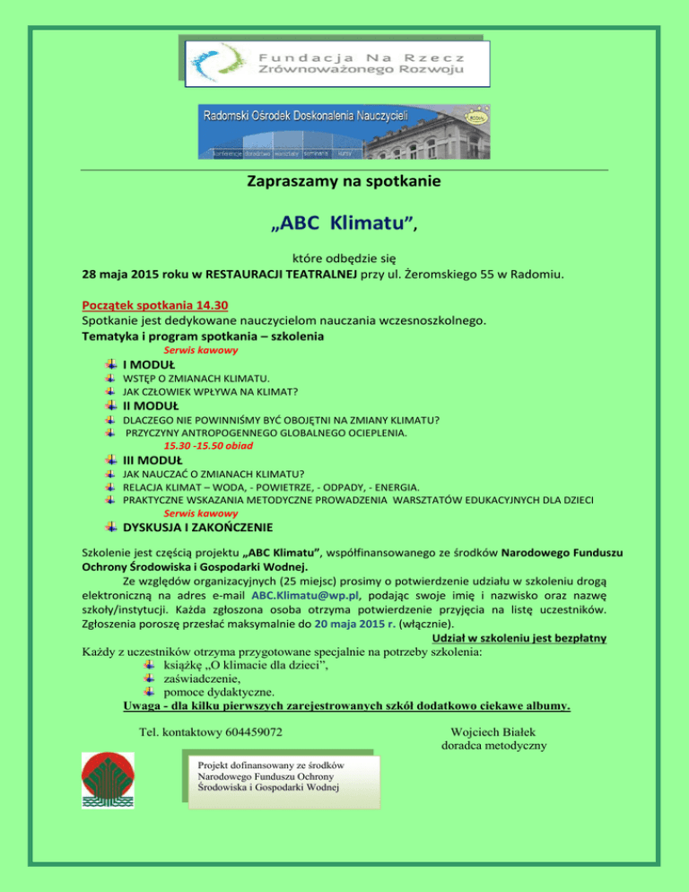 Zapraszamy na spotkanie „ABC Klimatu”, które odbędzie się 28 maja 2015 roku w RESTAURACJI TEATRALNEJ przy ul. Żeromskiego 55 w Radomiu. Początek spotkania 14.30 Spotkanie jest dedykowane nauczycielom nauczania wczesnoszkolnego. Tematyka i program spotkania – szkolenia Serwis kawowy I MODUŁ WSTĘP O ZMIANACH KLIMATU. JAK CZŁOWIEK WPŁYWA NA KLIMAT? II MODUŁ DLACZEGO NIE POWINNIŚMY BYĆ OBOJĘTNI NA ZMIANY KLIMATU? PRZYCZYNY ANTROPOGENNEGO GLOBALNEGO OCIEPLENIA. 15.30 -15.50 obiad III MODUŁ JAK NAUCZAĆ O ZMIANACH KLIMATU? RELACJA KLIMAT – WODA, - POWIETRZE, - ODPADY, - ENERGIA. PRAKTYCZNE WSKAZANIA METODYCZNE PROWADZENIA WARSZTATÓW EDUKACYJNYCH DLA DZIECI Serwis kawowy DYSKUSJA I ZAKOŃCZENIE Szkolenie jest częścią projektu „ABC Klimatu”, współfinansowanego ze środków Narodowego Funduszu Ochrony Środowiska i Gospodarki Wodnej. Ze względów organizacyjnych (25 miejsc) prosimy o potwierdzenie udziału w szkoleniu drogą elektroniczną na adres e-mail [email protected], podając swoje imię i nazwisko oraz nazwę szkoły/instytucji. Każda zgłoszona osoba otrzyma potwierdzenie przyjęcia na listę uczestników. Zgłoszenia poroszę przesłać maksymalnie do 20 maja 2015 r. (włącznie). Udział w szkoleniu jest bezpłatny Każdy z uczestników otrzyma przygotowane specjalnie na potrzeby szkolenia: książkę „O klimacie dla dzieci”, zaświadczenie, pomoce dydaktyczne. Uwaga - dla kilku pierwszych zarejestrowanych szkół dodatkowo ciekawe albumy. Tel. kontaktowy 604459072 Projekt dofinansowany ze środków Narodowego Funduszu Ochrony Środowiska i Gospodarki Wodnej Wojciech Białek doradca metodyczny