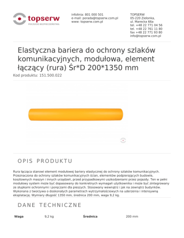 infolinia: 801 000 501 e-mail: [email protected] www: topserw.com.pl TOPSERW 05-220 Zielonka, ul. Marecka 66a tel. +48 22 771 04 56 tel. +48 22 761 11 80 fax +48 22 771 93 80 [email protected] Elastyczna bariera do ochrony szlaków komunikacyjnych, modułowa, element łączący (rura) Śr*D 200*1350 mm Kod produktu: 151.500.022 OPIS PRODUKTU Rura łącząca stanowi element modułowej bariery elastycznej do ochrony szlaków komunikacyjnych. Przeznaczona do ochrony szlaków komunikacyjnych ścian, elementów podpierających budowle, kosztownych maszyn i innych urządzeń, przed przypadkowymi uszkodzeniami przez pojazdy. Ten w pełni modułowy system może być dopasowany do konkretnych wymagań użytkownika i może być zintegrowany ze słupkami ochronnymi i poręczami dla pieszych. Stosowany wewnątrz i jak na zewnątrz budynków. Wykonana z tworzywa o doskonałych parametrach wytrzymałościowych na uderzenia i intensywną eksplatację. Wymiary długość 1350 mm, średnica 200 mm, waga 9,2 kg. DANE TECHNICZNE Waga 9,2 kg Średnica 200 mm