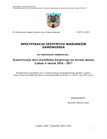 Zamawiający: Gmina Miejska Lubań Przetarg nieograniczony na: Konserwację sieci oświetlenia drogowego na terenie miasta Lubań w latach 2016-2017 Nr referencyjny nadany sprawie przez Zamawiającego ZP.271.3.2015 SPECYFIKACJA ISTOTNYCH WARUNKÓW ZAMÓWIENIA na wykonanie zadania pn.: Konserwacja sieci oświetlenia drogowego na terenie miasta Lubań w latach 2016 - 2017 Postępowanie prowadzone jest w trybie przetargu nieograniczonego zgodnie z ustawą z dnia 29 stycznia 2004 roku Prawo zamówień publicznych (Dz. U. z 2013 r. poz. 907 ze zm.) Zatwierdzam: Burmistrz Miasta Lubań Lubań, dnia 7 grudnia 2015 roku 1 Zamawiający: Gmina Miejska Lubań Przetarg nieograniczony na: Konserwację sieci oświetlenia drogowego na terenie miasta Lubań w latach 2016-2017 Rozdział 1. Tryb udzielenia zamówienia publicznego oraz miejsca, w których zostało zamieszczone ogłoszenie o zamówieniu Postępowanie o udzielanie zamówienia publicznego prowadzone jest w trybie przetargu nieograniczonego, zgodnie z przepisami ustawy z dnia 29 stycznia 2004 r. Prawo zamówień publicznych (tekst jednolity: Dz. U. z 2013 r., poz. 907, ze zm.) zwanej dalej „ustawą” oraz aktów wykonawczych do ustawy. 1. Miejsce publikacji ogłoszenia o przetargu: _ Biuletyn Zamówień Publicznych: Ogłoszenie nr 335126 – 2015 z dnia 08.12.2015 r. _ strona internetowa Zamawiającego: http://bip.um-luban.dolnyslask.pl/index.php?idmp=23&r=r _ tablice ogłoszeń w siedzibie Zamawiającego: przy ul. 7-mej Dywizji 14 i przy ul. Mickiewicza 6 w Lubaniu, Rozdział 2. Opis przedmiotu zamówienia 1.Przedmiotem zamówienia jest prowadzenie bieżącej konserwacji obwodów oświetlenia drogowego na terenie miasta Lubań w latach 2016-2017 w ramach zadania pn.: „Konserwacja sieci oświetlenia drogowego na terenie miasta Lubań w latach 2016-2017”, 2. Strony zgodnie ustalają następujący szczegółowy zakres obowiązków Wykonawcy w trakcie realizacji Przedmiotu umowy: 2.1. Wymiana uszkodzonych źródeł światła, kloszy, dławików, kondensatorów i układów zapłonowych w oprawach oświetleniowych, 2.2. Wymiana uszkodzonych wkładek topikowych i główek bezpiecznikowych w słupach oświetleniowych; 2.3. Wymiana uszkodzonych zamknięć skrzynek oświetleniowych, 2.4. Wymiana uszkodzonych listew zaciskowych, 2.5. Wymiana uszkodzonych styczników i bezpieczników w skrzynkach oświetlenia ulicznego, 2.6. Lokalizacja uszkodzeń w napowietrznej i podziemnej sieci oświetleniowej oraz niezwłoczne usuwanie tych uszkodzeń, wymiana i remont linii kablowych, 2.7. Sprawdzanie działania i regulacja urządzeń sterujących, w tym regulacja czasów świecenia (zegarów sterujących) stosownie do długości dnia, 2.8. Prostowanie przekrzywionych opraw i wysięgników do prawidłowej pozycji, 2.9. Sprawdzanie posadowienia i przywracanie pionowości słupów oświetleniowych, 2.10. Wykonywanie pomiarów: skuteczności ochrony przeciwporażeniowej, rezystancji izolacji, innych wymaganych pomiarów w sposób i z częstotliwością określoną w szczegółowych przepisach oraz na wniosek Zamawiającego, 2.11. Usuwanie nieprawidłowości stwierdzonych w wyniku przeprowadzonych pomiarów, 2.12. Prowadzenie wymaganej przepisami dokumentacji eksploatacyjnej oświetlenia drogowego z wykazem materiałów wmontowanych w miejsce zużytych. Sporządzone sprawozdanie winno być załączone do wystawionej przez Wykonawcę faktury VAT, 2.12. Dokonywanie oględzin i oceny stanu technicznego urządzeń oświetlenia drogowego, 2.14. Naprawy lamp i innych urządzeń elektrycznych zapewniających sprawne funkcjonowanie oświetlenia, 2.15. Okresowe przeglądy punktów świetlnych typu parkowego polegające na oczyszczaniu i przemyciu kloszy co najmniej 2 razy w roku tj.: 1) I-wsza dekada maja, 2) I-wsza dekada sierpnia, pod rygorem nałożenia kar określonych w Umowie, 2.16. Przycinanie gałęzi drzew i krzewów bezpośrednio zasłaniających punkty świetlne oraz ograniczające skuteczność świecenia, jak również powodujące zbliżenie do przewodów linii napowietrznych, 2.17. Niezwłoczna likwidacja zagrożeń dla osób trzecich, takich jak: złamany wysięgnik, zwisająca lampa, wyrwane drzwiczki skrzynki powstałe na skutek niekorzystnych 2 Zamawiający: Gmina Miejska Lubań Przetarg nieograniczony na: Konserwację sieci oświetlenia drogowego na terenie miasta Lubań w latach 2016-2017 czynników atmosferycznych oraz dewastacji dokonanej przez osoby trzecie. 2.18. Malowanie i konserwacja metalowych konstrukcji latarń, tablic rozdzielczych i szafek oraz numeracji słupów oświetleniowych, 2.19. Utrzymanie w należytym stanie technicznym i w stałej sprawności powierzonych urządzeń oświetleniowych, w tym urządzeń sterujących oświetleniem drogowym, 3. Wykonawca zobowiązuje się dokonywać zakupów części i urządzeń niezbędnych do wykonywania przedmiotu umowy na własny koszt. 4. Przy wykonywaniu czynności konserwacyjnych Wykonawca zobowiązuje się do przestrzegania obowiązujących przepisów i polskich norm technicznych dotyczących oświetlenia drogowego. 5. Naprawy uszkodzeń i awarii urządzeń oraz obwodów oświetlenia drogowego, które powodują zagrożenie dla życia lub zdrowia ludzkiego, bezpieczeństwa środowiska i strat w majątku będą dokonywane niezwłocznie. Miejsca wystąpienia takich uszkodzeń i awarii zostaną odpowiednio zabezpieczone przez Wykonawcę w wypadku niemożliwości podjęcia natychmiastowej naprawy z przyczyn niezależnych od Wykonawcy. 6. Przy wykonywaniu prac konserwacyjnych na urządzeniach oświetlenia drogowego zainstalowanych na sieci dystrybucyjnej niskiego napięcia TAURON Dystrybucja S.A. Oddział w Jeleniej Górze Wykonawca jest zobowiązany do przestrzegania obowiązujących przepisów eksploatacji urządzeń elektrycznych, a szczególnie ustawy z dnia 10 kwietnia 1997 r. Prawo energetyczne (Dz.U. z 2012 r., poz. 1059 ze zm.) oraz „Instrukcji organizacji prac zespołów pracowników obc
