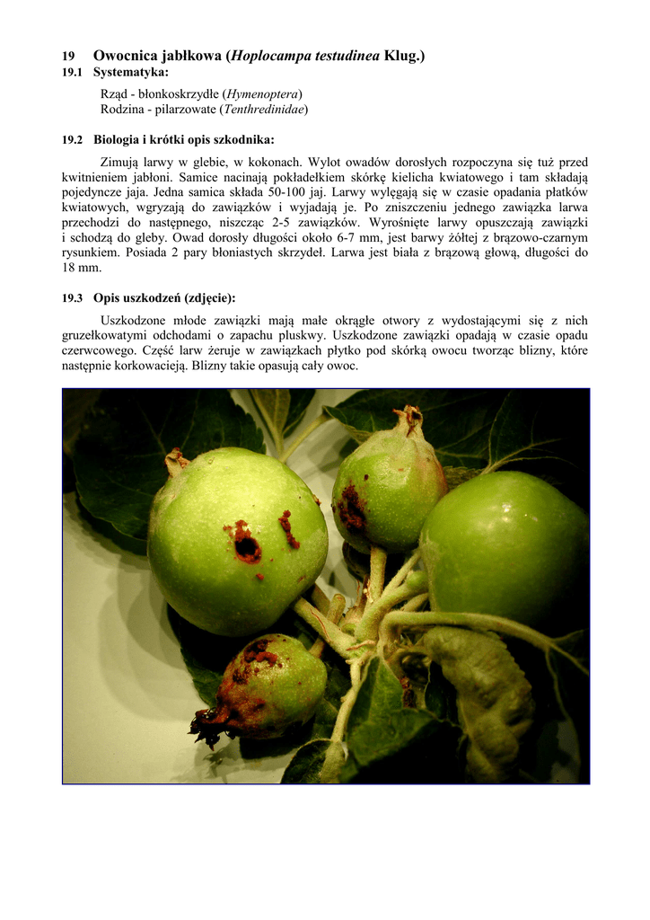 19 Owocnica jabłkowa (Hoplocampa testudinea Klug.) 19.1 Systematyka: Rząd - błonkoskrzydłe (Hymenoptera) Rodzina - pilarzowate (Tenthredinidae) 19.2 Biologia i krótki opis szkodnika: Zimują larwy w glebie, w kokonach. Wylot owadów dorosłych rozpoczyna się tuż przed kwitnieniem jabłoni. Samice nacinają pokładełkiem skórkę kielicha kwiatowego i tam składają pojedyncze jaja. Jedna samica składa 50-100 jaj. Larwy wylęgają się w czasie opadania płatków kwiatowych, wgryzają do zawiązków i wyjadają je. Po zniszczeniu jednego zawiązka larwa przechodzi do następnego, niszcząc 2-5 zawiązków. Wyrośnięte larwy opuszczają zawiązki i schodzą do gleby. Owad dorosły długości około 6-7 mm, jest barwy żółtej z brązowo-czarnym rysunkiem. Posiada 2 pary błoniastych skrzydeł. Larwa jest biała z brązową głową, długości do 18 mm. 19.3 Opis uszkodzeń (zdjęcie): Uszkodzone młode zawiązki mają małe okrągłe otwory z wydostającymi się z nich gruzełkowatymi odchodami o zapachu pluskwy. Uszkodzone zawiązki opadają w czasie opadu czerwcowego. Część larw żeruje w zawiązkach płytko pod skórką owocu tworząc blizny, które następnie korkowacieją. Blizny takie opasują cały owoc. 19.4 Metodyka wykonania obserwacji: Odławianie owadów dorosłych na białe pułapki lepowe. Pod koniec zielonego (skala BBCH 56) lub na początku różowego pąka kwiatowego (skala BBCH 57) zawieszać na drzewach białe pułapki lepowe do odłowu owadów dorosłych. Pułapki należy przeglądać co 2-3 dni, notując każdorazowo liczbę odłowionych osobników. 19.5 Progi szkodliwości i terminy zabiegów: 20 odłowionych owadów dorosłych średnio na 1 pułapkę w okresie od wywieszenia do końca kwitnienia (skala BBCH 67). Zwalczanie wykonuje się pod koniec opadania płatków kwiatowych danej odmiany (skala BBCH 67). Termin określenia strat: podczas czerwcowego opadania zawiązków (skala BBCH 73) określa się procent zawiązków całkowicie zniszczonych przez owocnicę jabłkową, a podczas zbioru owoców (skala BBCH 87) procent owoców z bliznami.
