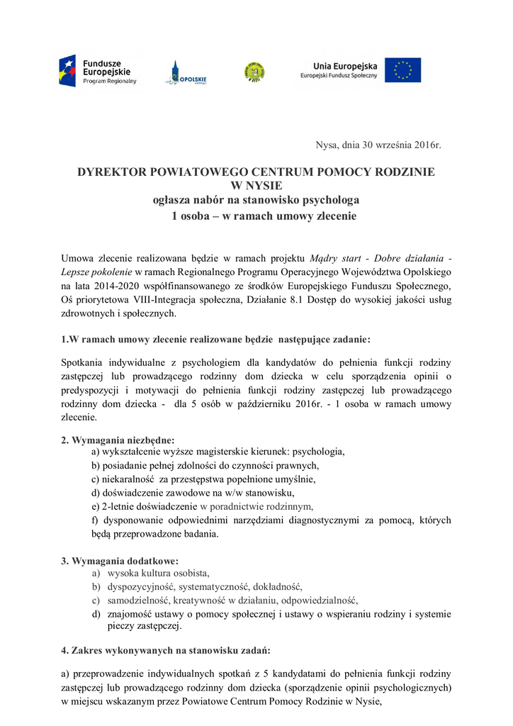 Nysa, dnia 30 września 2016r. DYREKTOR POWIATOWEGO CENTRUM POMOCY RODZINIE W NYSIE ogłasza nabór na stanowisko psychologa 1 osoba – w ramach umowy zlecenie Umowa zlecenie realizowana będzie w ramach projektu Mądry start - Dobre działania Lepsze pokolenie w ramach Regionalnego Programu Operacyjnego Województwa Opolskiego na lata 2014-2020 współfinansowanego ze środków Europejskiego Funduszu Społecznego, Oś priorytetowa VIII-Integracja społeczna, Działanie 8.1 Dostęp do wysokiej jakości usług zdrowotnych i społecznych. 1.W ramach umowy zlecenie realizowane będzie następujące zadanie: Spotkania indywidualne z psychologiem dla kandydatów do pełnienia funkcji rodziny zastępczej lub prowadzącego rodzinny dom dziecka w celu sporządzenia opinii o predyspozycji i motywacji do pełnienia funkcji rodziny zastępczej lub prowadzącego rodzinny dom dziecka - dla 5 osób w październiku 2016r. - 1 osoba w ramach umowy zlecenie. 2. Wymagania niezbędne: a) wykształcenie wyższe magisterskie kierunek: psychologia, b) posiadanie pełnej zdolności do czynności prawnych, c) niekaralność za przestępstwa popełnione umyślnie, d) doświadczenie zawodowe na w/w stanowisku, e) 2-letnie doświadczenie w poradnictwie rodzinnym, f) dysponowanie odpowiednimi narzędziami diagnostycznymi za pomocą, których będą przeprowadzone badania. 3. Wymagania dodatkowe: a) wysoka kultura osobista, b) dyspozycyjność, systematyczność, dokładność, c) samodzielność, kreatywność w działaniu, odpowiedzialność, d) znajomość ustawy o pomocy społecznej i ustawy o wspieraniu rodziny i systemie pieczy zastępczej. 4. Zakres wykonywanych na stanowisku zadań: a) przeprowadzenie indywidualnych spotkań z 5 kandydatami do pełnienia funkcji rodziny zastępczej lub prowadzącego rodzinny dom dziecka (sporządzenie opinii psychologicznych) w miejscu wskazanym przez Powiatowe Centrum Pomocy Rodzinie w Nysie, b)stała współpraca z konsultantem-koordynatorem projektu Mądry start - Dobre działania Lepsze pokolenie realizowanego w ramach Regionalnego Programu Operacyjnego Województwa Opolskiego na lata 2014-2020 współfinansowanego ze środków Europejskiego Funduszu Społecznego, Oś priorytetowa VIII-Integracja społeczna, Działanie 8.1 Dostęp do wysokiej jakości usług zdrowotnych i społecznych, c)przygotowanie materiałów niezbędnych do przeprowadzenia spotkań. 5.Wymagane dokumenty: życiorys (CV), list motywacyjny, kserokopie dokumentów poświadczających wykształcenie i staż pracy, inne dokumenty o posiadanych kwalifikacjach i umiejętnościach, kwestionariusz osobowy, oświadczenie o aktualnym zaangażowaniu w realizację zadań w ramach projektów współfinansowanych ze środków Unii Europejskiej, g) oświadczenie o pełnej zdolności do czynności prawnych, korzystaniu z pełni praw publicznych i o niekaralności za przestępstwo popełnione umyślnie. a) b) c) d) e) f) Wymagane dokumenty aplikacyjne należy składać osobiście w siedzibie Powiatowego Centrum Pomocy Rodzinie w Nysie w sekretariacie lub pocztą na adres Powiatowego Centrum Pomocy Rodzinie ul. Słowiańska 17, 48-300 Nysa : „Nabór na stanowisko psychologa w ramach umowy zlecenie” - w terminie do dnia 7 października 2016 roku do godziny 12.00. Aplikacje, które wpłyną do PCPR po wyżej określonym terminie lub bez kompletu wymaganych dokumentów nie wezmą udziału w postępowaniu rekrutacyjnym. Kandydat wybrany przez Komisję, na podstawie złożonych dokumentów, zostanie powiadomiony telefonicznie o terminie rozpoczęcia pracy. Wymagane dokumenty: list motywacyjny, szczegółowe CV (z uwzględnieniem dokładnego przebiegu kariery zawodowej) powinny być opatrzone klauzulą: „Wyrażam zgodę na przetwarzanie moich danych osobowych zawartych w ofercie pracy dla potrzeb niezbędnych do realizacji procesu rekrutacji zgodnie z ustawą z dnia 29.08.1997r. o ochronie danych osobowych (Dz. U. z 2016r., poz. 922) oraz ustawą z dnia 21 listopada 2008r. o pracownikach samorządowych (Dz. U. z 2016r., poz. 902)”. Powiatowe Centrum Pomocy Rodzinie ul. Słowiańska 17 48-300 Nysa tel./fax (077) 448-26-10 e-mail: [email protected] Mądry start-Dobre działania-Lepsze pokolenie