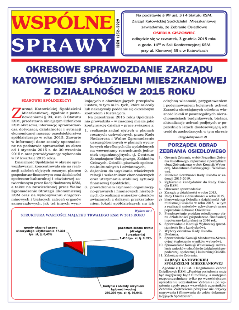 ISSN 1232–5929 WSPÓLNE SPRAW Y Na podstawie § 99 ust. 3 i 4 Statutu KSM, Zarząd Katowickiej Spółdzielni Mieszkaniowej zawiadamia, że Zebranie Osiedlowe Osiedla giszowiec odbędzie się w czwartek, 3 grudnia 2015 roku o godz. 1600 w Sali Konferencyjnej KSM przy ul. Klonowej 35 c w Katowicach OKRESOWE Sprawozdanie ZARZĄDU KATOWICKIEJ SPÓŁDZIELNI MIESZKANIOWEJ Z DZiAŁALNOŚCI W 2015 ROKU Szanowni Spółdzielcy! Z kających z obowiązujących przepisów i ustaw, w tym m.in. tych, które zalecały lub nakazywały poddanie się określonym kontrolom i lustracjom. Na przestrzeni 2015 roku Spółdzielnia prowadziła – w znacznej mierze jako kontynuację działań – prace związane z: arząd Katowickiej Spółdzielni Mieszkaniowej, zgodnie z postanowieniami § 94, ust. 3 Statutu KSM, przedstawia niniejszym Członkom KSM okresową informację sprawozdawczą dotyczącą działalności i sytuacji 1. realizacją zadań ujętych w planach ekonomicznej naszego przedsiębiorstwa rocznych uchwalonych przez Radę spółdzielczego w roku 2015. Zawarte Nadzorczą i Walne Zgromadzenie w informacji dane zostały sporządzouszczegółowionych w planach wycinne na podstawie sprawozdań za okres kowych określonych dla wydzielonych od 1 stycznia 2015 r. do 30 września na wewnętrzny rozrachunek jedno2015 r. oraz przewidywanego wykonania stek organizacyjnych, tj. Centrum w IV kwartale 2015 roku. Zarządzająco-Usługowego, Zakładów Działalność Spółdzielni w okresie spraCelowych, Osiedli i placówek społeczwozdawczym koncentrowała się na realino-kulturalnych i oświatowych, zacji założeń objętych rocznym planem 2. dążeniem do uzyskania właściwych gospodarczo-finansowym oraz działalności relacji i wskaźników ekonomicznych społeczno-kulturalnej i oświatowej zaoraz utrzymania stabilnej sytuacji twierdzonym przez Radę Nadzorczą KSM, finansowej Spółdzielni, a także na zatwierdzonej przez Walne 3. prowadzeniem czynności organizacyjZgromadzenie Strategii Ekonomicznej no-prawnych i finansowych niezbędKSM oraz na wykonywaniu długoternych do realizacji wniosków członków minowych i bieżących zaleceń organów związanych z dalszym przekształcesamorządowych, jak też innych wyniniem lokali spółdzielczych na ich Wykres nr 1 Struktura wartości majątku trwałego KSM w 2015 roku grunty własne i prawa wieczystego użytkowania 17.304 tys. zł, tj. 6,43% WSPÓLNE SPRAWY OSIEDLA GISZOWIEC pozostałe środki trwałe (dźwigi i urządzenia) 1.415 tys. zł, tj. 0,53% budynki i obiekty inżynierii lądowej i wodnej 250.295 tys. zł, tj. 93,04% odrębną własność, przygotowaniem i podejmowaniem kolejnych uchwał Zarządu określających odrębną własność lokali w poszczególnych nieruchomościach budynkowych, bieżącą aktualizację uchwał podjętych w poprzednich latach dostosowującą ich treść do zachodzących w tym okresie (Ciąg dalszy na str. 2) Porządek obrad Zebrania Osiedlowego 1. Otwarcie Zebrania, wybór Prezydium Zebrania Osiedlowego, zapoznanie z porządkiem obrad Zebrania oraz wybór Komisji: Wyborczej, Mandatowo-Skrutacyjnej i Wnioskowej. 2. Ustalenie liczebności Rady Osiedla w kadencji 2015-2019. 3. Zgłaszanie kandydatów do Rady Osiedla KSM. 4. Okresowe sprawozdania: a) Zarządu z działalności w roku 2015, b) Rady Osiedla z działalności w roku 2015, c) kierownictwa Osiedla z działalności Administracji Osiedla w roku 2015, w tym z realizacji wniosków uchwalonych przez poprzednie Zebranie Osiedlowe. 5. Przedstawienie projektu osiedlowego planu działalności gospodarczo-finansowej i społeczno-kulturalnej na 2016 rok. 6. Sprawozdanie Komisji Wyborczej (przedstawienie listy kandydatów). 7. Wybory członków Rady Osiedla. 8. Dyskusja. 9. Sprawozdanie Komisji Mandatowo-Skrutacyjnej (ogłoszenie wyników wyborów). 10.Sprawozdanie Komisji Wnioskowej i uchwalenie wniosków odnośnie do działalności gospodarczej, społecznej i kulturalnej Osiedla. 11.Zakończenie Zebrania. ZARZĄD KATOWICKIEJ SPÓŁDZIELNI MIESZKANIOWEJ Zgodnie z § 12 ust. 1 Regulaminu Zebrań Osiedlowych KSM: „Przebieg posiedzenia może być nagrywany bądź filmowany, a następnie rozpowszechniany tylko po wcześniejszym uprzedzeniu uczestników Zebrania i po wyrażeniu zgody przez wszystkich uczestników Zebrania. Zastrzeżenie powyższe nie dotyczy nagrywania i filmowania do celów dokumentacyjnych Spółdzielni”. 1 Sprawozdanie ZARZĄDU KSM (Ciąg dalszy ze str. 1) zmian w strukturze osób uprawnionych do lokali oraz kontynuowaniem prac zmierzających do uporządkowania spraw terenowo-prawnych dla wszystkich nieruchomości spółdzielczych i mienia spółdzielczego, 4. dążeniem do uzyskania korzystnych dla Spółdzielni i Spółdzielców zapisów w nowo opracowanych przez Radę Miasta planach zagospodarowania przestrzennego Katowic, a w szczególności – bieżące śledzenie i analizowanie projektowanych zapisów, opiniowanie i wnioskowanie zmian w tym zakresie, podejmowanie niezbędnych interwencji, itp., 5. bieżącym monitorowaniem i analizowaniem warunków wykonawczych zakresu rzeczowego i finansowego zadań remontowych i modernizacyjnych, mających na względzie niezbędne oszczędności i optymalizację wydatków z funduszu remontowego (część „A” i część „B”). Roczne sprawozdanie finansowe Zarządu, jak co roku, zostanie sporządzone po zamknięciu roku obrachunkowego i poddane będzie badaniu przez biegłych rewidentów księgowych wybranych przez Radę Nadzorczą KSM, a ich ocena znajdzie potwierdzenie wydaniem stosownej, wymaganej przepisami o rachunkowości, opinii wraz z raportem po zakończeniu badania. Dokumenty te zostaną przedstawione Spółdzielcom wraz z materiałami sprawozdawczymi przed Walnym Zgromadzeniem w I półroczu 2016 roku. Dane do oceny sytuacji ekonomicznej Spółdzielni w poszczególnych elementach składowych sprawozdania przedstawiają się następująco: I. Majątek trwały Wartość majątku trwałego ogółem netto 