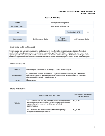 kierunek BIOINFORMATYKA, semestr II studia I stopnia KARTA KURSU Nazwa Funkcje matematyczne Nazwa w j. ang. Mathematical functions Kod Koordynator Punktacja ECTS* Dr Mirosława Sajka Zespół dydaktyczny 3 dr Mirosława Sajka Opis kursu (cele kształcenia) Celem kursu jest usystematyzowanie podstawowych wiadomości związanych z pojęciem funkcji, a następnie bardziej szczegółowe omówienie własności tych funkcji, których najczęściej używa się przy opisie zjawisk biologicznych. Zastosowanie metod rachunku różniczkowego do badania funkcji będzie kontynuacją kształcenia w zakresie analizy matematycznej rozpoczętego w czasie kursu "Matematyka". Warunki wstępne Wiedza Umiejętności Kursy Podstawy rachunku różniczkowego z kursu "Matematyka". Wykonywanie działań na liczbach i wyrażeniach algebraicznych. Obliczanie pochodnych funkcji wielomianowych i wymiernych. Rozwiązywanie równań i nierówności liniowych i kwadratowych. Matematyka Efekty kształcenia Efekt kształcenia dla kursu Wiedza Odniesienie do efektów kierunkowych W01 Student wie, jak wyglądają wykresy funkcji liniowej, funkcji kwadratowej, funkcji trygonometrycznych, funkcji wykładniczych o różnych podstawach, funkcji logarytmicznej. K_W 02 W02 Student zna podstawowe własności operacji potęgowania i logarytmowania. K_W 02 1 Odniesienie do efektów kierunkowych Efekt kształcenia dla kursu Umiejętności U01 Student umie odczytać z wykresu własności funkcji, w tym wartość funkcji w zadanym punkcie, a także, w jakich przedziałach dana funkcja jest rosnąca, w jakich malejąca. K_U 07 U02 Student umie napisać wzór na złożenie podanych funkcji i na odwrót - wyodrębnić funkcje, których złożenie opisane jest daną skomplikowaną formułą. K_W 02 U03 Student umie stosować wzór na pochodną funkcji złożonej. K_W 02 K_W 02, K_U 07 U04 Student umie stosować metody rachunku różniczkowego do badania funkcji jednej zmiennej (znajdowanie przedziałów monotoniczności, znajdowanie punktów, w których funkcja przyjmuje wartość ekstremalną, szkicowanie wykresu funkcji). Odniesienie do efektów kierunkowych Efekt kształcenia dla kursu Kompetencje społeczne K01 Student poznaje ograniczenia własnej wiedzy i rozumie potrzebę jej uzupełniania, w szczególności potrzebę samokształcenia. K_K 01 Organizacja Forma zajęć Liczba godzin Ćwiczenia w grupach Wykład (W) A 10 K L S P E 30 Opis metod prowadzenia zajęć Wykład interaktywny z wykorzystaniem dynamicznych prezentacji komputerowych, prowadzony konwersatoryjnie, z aktywnym udziałem studentów. Na ćwiczeniach aktywizujące metody nauczania, dyskusja, praca w grupach, omawianie prac pisemnych studentów. Formy sprawdzania efektów kształcenia 2 Kryteria oceny Uwagi Inne x x x x x x Egzamin pisemny Kartkówka x x x x x x Egzamin ustny Rozwiązywanie zadań przy tablicy Udział w dyskusji Projekt grupowy Projekt indywidualny Praca laboratoryjna Zajęcia terenowe Ćwiczenia w szkole E – learning Gry dydaktyczne x x x x x x x W01 W02 U01 U02 U03 U04 K01 Ocena końcowa uwzględnia zarówno systematyczny i aktywny udział studenta w pracy na zajęciach (dyskusje, rozwiązywanie zadań) jak i ocenę prac pisemnych (sprawdziany pisemne i kartkówki). Warunkiem otrzymania zaliczenia jest uzyskanie co najmniej 50% sumy punktów możliwych do uzyskania z wszystkich prac pisemnych i kartkówek. Aktywny udział w ćwiczeniach może zostać nagrodzony dodatkowymi punktami. Warunkiem uczestnictwa w kursie jest ukończenie kursu Matematyka. Treści merytoryczne (wykaz tematów) 1. Usystematyzowanie wiadomości związanych z pojęciem funkcji. Funkcja. Wykres funkcji. Funkcja różnowartościowa, funkcja rosnąca, funkcja malejąca, funkcja stała. Funkcja odwrotna do danej funkcji różnowartościowej. Funkcja złożona. Funkcja ciągła. Podstawowe własności funkcji ciągłych. 2. Niektóre funkcje elementarne i ich wykresy. Funkcje wielomianowe. Funkcje wymierne. Funkcje trygonometryczne. Funkcje odwrotne do funkcji trygonometrycznych. 3. Poszerzenie wiadomości z rachunku różniczkowego. Zastosowanie rachunku różniczkowego do badania funkcji: związek znaku pochodnej z monotonicznością funkcji, warunek konieczny na ekstremum. Twierdzenie o pochodnej funkcji złożonej. Pochodna funkcji odwrotnej do danej funkcji. Wzory na pochodne poznanych funkcji elementarnych. 4. Funkcja wykładnicza i logarytmiczna. Potęga o wykładniku naturalnym, całkowitym, wymiernym. Liczba e. Funkcja wykładnicza. Logarytm, logarytm naturalny. Pochodna funkcji wykładniczej. Pochodna funkcji logarytmicznej. Wykaz literatury podstawowej 3 1. Dariusz Wrzosek, Matematyka dla biologów, Wydawnictwa Uniwersytetu Warszawskiego 2010. 2. Marek Ptak,"Matematyka dla studentów kierunków technicznych i przyrodniczych", Wydawnictwo UR w Krakowie, Kraków 2009. Wykaz literatury uzupełniającej 1. Urszula Foryś, Matematyka w biologii, Wydawnictwa Naukowo-Techniczne, Warszawa 2005. 2. M. Gewert, Z. Skoczylas, Analiza matematyczna 1 (definicje, twierdzenia, wzory), Oficyna Wydawnicza GiS, Wrocław 2005. 3. M. Gewert, Z. Skoczylas, Analiza matematyczna 1 (przykłady i zadania), Oficyna Wydawnicza GiS, Wrocław 2005. 4. Jerzy Ginter, Nie bój się pochodnej, Wydawnictwa Naukowo-Techniczne, Warszawa 2008. 5. Wiesława Korczak i Marianna Trajdos, Wektory, pochodne, całki, Wydawnictwo Naukowe PWN, Warszawa 1998. 6. W. Krysicki, L. Włodarski, Analiza matematyczna w zadaniach, cz. I, PWN, Warszawa 1994. 7. Franciszek Leja, Rachunek różniczkowy i całkowy, PWN, Warszawa 1976. 8. Anna Leksińska, Wacław Leksiński i Wojciech Żakowski, Rachunek różniczkowy i całkowy z zastosowaniami. Zajęcia fakultatywne w grupie matematyczno-fizycznej, Państwowe Zakłady Wydawnictw Szkolnych, Warszawa 1972. 9. Donald A. McQuarrie, Matematyka dla przyrodników i inżynierów, tom 1, Wydawnictwo Naukowe PWN, Warszawa 2005. 10. Maciej Skwarczyński, Przystępny podręcznik matematyki