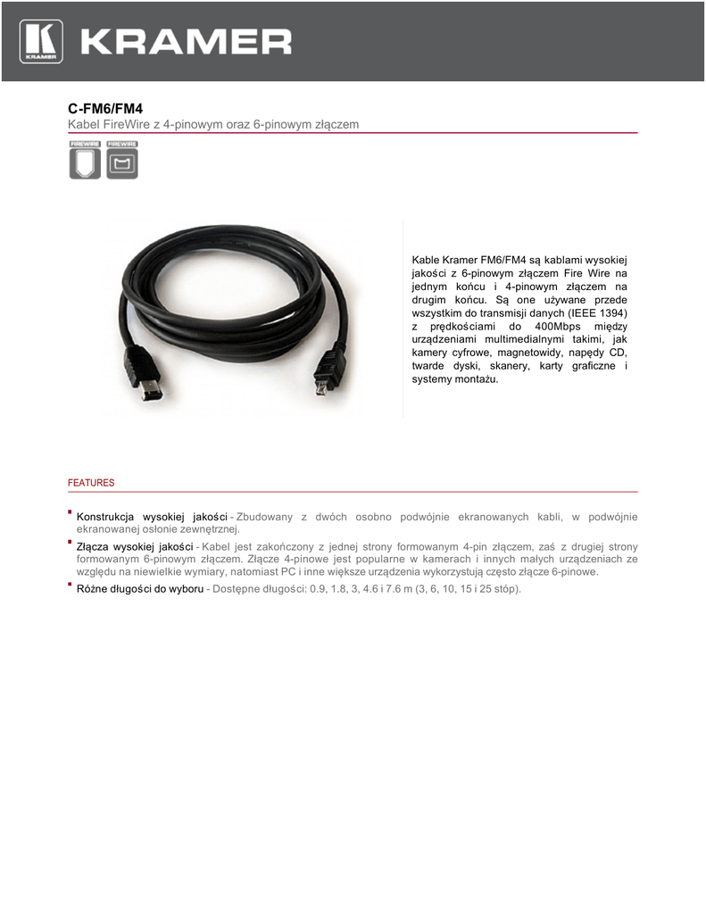C-FM6/FM4 Kabel FireWire z 4-pinowym oraz 6-pinowym złączem Kable Kramer FM6/FM4 są kablami wysokiej jakości z 6-pinowym złączem Fire Wire na jednym końcu i 4-pinowym złączem na drugim końcu. Są one używane przede wszystkim do transmisji danych (IEEE 1394) z prędkościami do 400Mbps między urządzeniami multimedialnymi takimi, jak kamery cyfrowe, magnetowidy, napędy CD, twarde dyski, skanery, karty graficzne i systemy montażu. FEATURES Konstrukcja wysokiej jakości - Zbudowany z dwóch osobno podwójnie ekranowanych kabli, w podwójnie ekranowanej osłonie zewnętrznej. Złącza wysokiej jakości - Kabel jest zakończony z jednej strony formowanym 4-pin złączem, zaś z drugiej strony formowanym 6-pinowym złączem. Złącze 4-pinowe jest popularne w kamerach i innych małych urządzeniach ze względu na niewielkie wymiary, natomiast PC i inne większe urządzenia wykorzystują często złącze 6-pinowe. Różne długości do wyboru - Dostępne długości: 0.9, 1.8, 3, 4.6 i 7.6 m (3, 6, 10, 15 i 25 stóp).