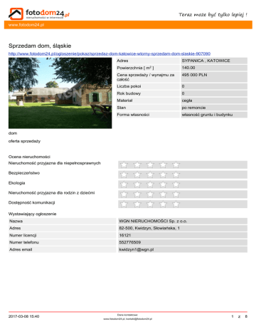 Teraz może być tylko lepiej ! www.fotodom24.pl Sprzedam dom, śląskie http://www.fotodom24.pl/ogloszenie/pokaz/sprzedaz-dom-katowice-wtorny-sprzedam-dom-slaskie-907090 Adres SYPANICA , KATOWICE Powierzchnia [ m2 ] 140.00 Cena sprzedaży / wynajmu za całość 495 000 PLN Liczba pokoi 0 Rok budowy 0 Materiał cegła Stan po remoncie Forma własności własność gruntu i budynku dom oferta sprzedaży Ocena nieruchomości Nieruchomość przyjazna dla niepełnosprawnych Bezpieczeństwo Ekologia Nieruchomość przyjazna dla rodzin z dziećmi Dostępność komunikacji Wystawiający ogłoszenie Nazwa WGN NIERUCHOMOŚCI Sp. z o.o. Adres 82-500, Kwidzyn, Słowiańska, 1 Numer licencji 16121 Numer telefonu 552776509 Adres email [email protected] 2017-03-08 15:40 Dane kontaktowe: www.fotodom24.pl, [email protected] 1 z 8 Teraz może być tylko lepiej ! www.fotodom24.pl Lokalizacja Adres Województwo śląskie Powiat pszczyński Miejscowość KATOWICE Dzielnica PRABUTY Ulica SYPANICA 2017-03-08 15:40 Dane kontaktowe: www.fotodom24.pl, [email protected] 2 z 8 Teraz może być tylko lepiej ! www.fotodom24.pl Parametry Media Prąd TAK Linia telefoniczna NIE Internet (stałe łącze) NIE Woda wodociąg Dane szczegółowe Powierzchnia całkowita [ m2 ] Powierzchnia mieszkalna[ m2 140 ] 140 Liczba pokoi 0 Liczba łazienek 0 Liczba pięter 2 Rok budowy 0 Balkon NIE Garaż wolnostojący Winda NIE Działka Powierzchnia działki [m2] 16 900 Kształt działki prostokąt Ogrodzenie drewniane Dane podstawowe Materiał cegła Stan po remoncie Forma własności własność gruntu i budynku 2017-03-08 15:40 Dane kontaktowe: www.fotodom24.pl, [email protected] 3 z 8 Teraz może być tylko lepiej ! www.fotodom24.pl Opłaty Cena sprzedaży 495 000 PLN Cena sprzedazy Cena sprzedaży / m2 3 536 PLN Średnie koszty eksploatacji Media m-c 2017-03-08 15:40 0 Dane kontaktowe: www.fotodom24.pl, [email protected] 4 z 8 Teraz może być tylko lepiej ! www.fotodom24.pl Opis NOWA NIŻSZA CENA !!! REWELACYJNA OKAZJA !!! DOM SKĄPANY W SŁOŃCU !!! NOWA JAKOŚĆ ŻYCIA, POSIADŁOŚĆ GODNA UWAGI!!! SYPANICA MIEJSCOWOŚĆ W WOJEWÓDZTWIE POMORSKIM, POWIECIE KWIDZYŃSKIM; Pięknie położone siedlisko złożone z budynku mieszkalnego jednorodzinnego o pow.140 m2, budynku o pow. 200 m2 (z przeznaczeniem na stajnię budynek gospodarczy może być wykorzystany według WŁASNYCH potrzeb), na działce o powierzchni 2,0 ha, wraz z niezbędnymi urządzeniami infrastruktury technicznej położonej w województwie pomorskim, powiecie kwidzyńskim, w gminie Prabuty. Budynek parterowy z poddaszem użytkowym, podpiwniczony, wykonany w technologii tradycyjnej. Dach dwuspadowy.(dachówka ceramiczna) strop nad parterem drewniany belkowy.Dom na wzgórzu z wystawą południową, teren suchy,posiadłość w otulinie lasu mieszanego (sosnowego, dębowego,świerkowego). Izolacje przeciwwilgociowe. Stolarka okienna drewniana nowa zrekonstruowana, podwójnie szklona. Ogrzewanie CO i kominowe. Zabezpieczenie przed szkodnikami i korozją biologiczną. Odległość do Prabut 7km, do Kwidzyna 17 km, do Sztumu 15 km..W okolicy piękne tereny do jazdy rowerem i pieszych wycieczek. W 1789 roku Sypanica była wsią 2017-03-08 15:40 Dane kontaktowe: www.fotodom24.pl, [email protected] 5 z 8 Teraz może być tylko lepiej ! www.fotodom24.pl Galeria 2017-03-08 15:40 Dane kontaktowe: www.fotodom24.pl, [email protected] 6 z 8 Teraz może być tylko lepiej ! www.fotodom24.pl Notatki 2017-03-08 15:40 Dane kontaktowe: www.fotodom24.pl, [email protected] 7 z 8 Teraz może być tylko lepiej ! www.fotodom24.pl 2017-03-08 15:40 Dane kontaktowe: www.fotodom24.pl, [email protected] 8 z 8