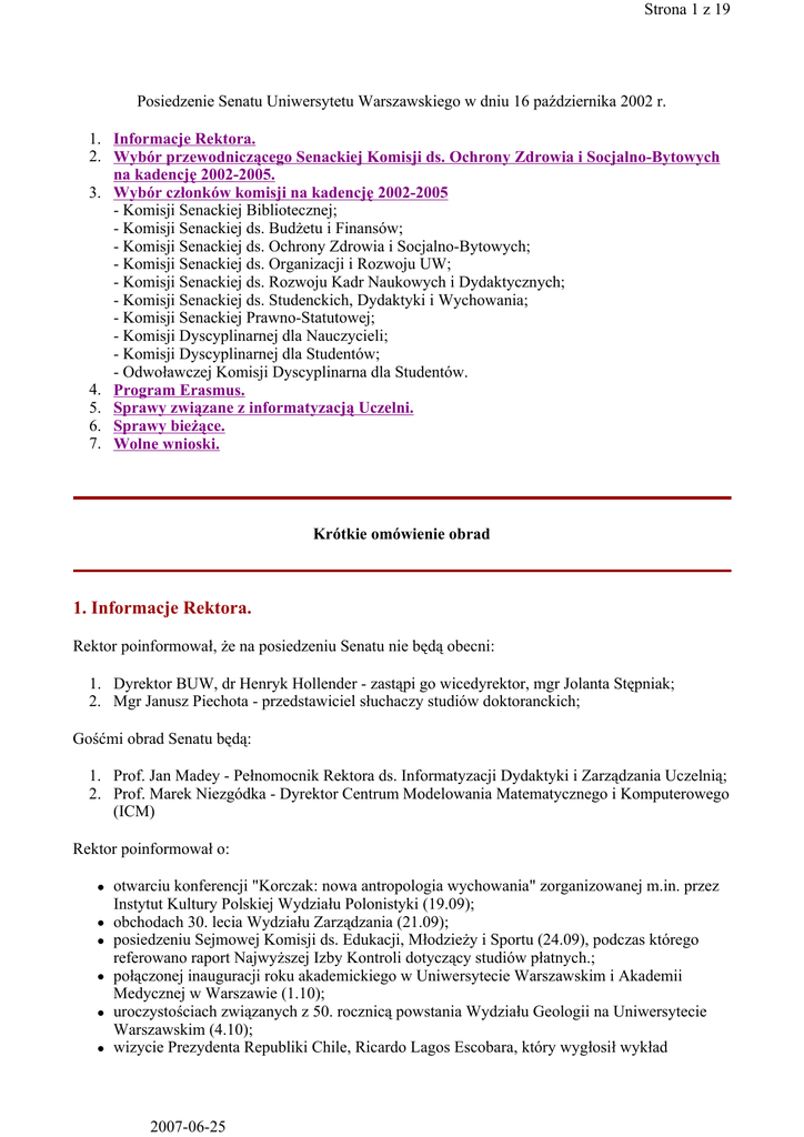 Strona 1 z 19 Posiedzenie Senatu Uniwersytetu Warszawskiego w dniu 16 października 2002 r. 1. Informacje Rektora. 2. Wybór przewodniczącego Senackiej Komisji ds. Ochrony Zdrowia i Socjalno-Bytowych na kadencję 2002-2005. 3. Wybór członków komisji na kadencję 2002-2005 - Komisji Senackiej Bibliotecznej; - Komisji Senackiej ds. Budżetu i Finansów; - Komisji Senackiej ds. Ochrony Zdrowia i Socjalno-Bytowych; - Komisji Senackiej ds. Organizacji i Rozwoju UW; - Komisji Senackiej ds. Rozwoju Kadr Naukowych i Dydaktycznych; - Komisji Senackiej ds. Studenckich, Dydaktyki i Wychowania; - Komisji Senackiej Prawno-Statutowej; - Komisji Dyscyplinarnej dla Nauczycieli; - Komisji Dyscyplinarnej dla Studentów; - Odwoławczej Komisji Dyscyplinarna dla Studentów. 4. Program Erasmus. 5. Sprawy związane z informatyzacją Uczelni. 6. Sprawy bieżące. 7. Wolne wnioski. Krótkie omówienie obrad 1. Informacje Rektora. Rektor poinformował, że na posiedzeniu Senatu nie będą obecni: 1. Dyrektor BUW, dr Henryk Hollender - zastąpi go wicedyrektor, mgr Jolanta Stępniak; 2. Mgr Janusz Piechota - przedstawiciel słuchaczy studiów doktoranckich; Gośćmi obrad Senatu będą: 1. Prof. Jan Madey - Pełnomocnik Rektora ds. Informatyzacji Dydaktyki i Zarządzania Uczelnią; 2. Prof. Marek Niezgódka - Dyrektor Centrum Modelowania Matematycznego i Komputerowego (ICM) Rektor poinformował o: z z z z z z otwarciu konferencji "Korczak: nowa antropologia wychowania" zorganizowanej m.in. przez Instytut Kultury Polskiej Wydziału Polonistyki (19.09); obchodach 30. lecia Wydziału Zarządzania (21.09); posiedzeniu Sejmowej Komisji ds. Edukacji, Młodzieży i Sportu (24.09), podczas którego referowano raport Najwyższej Izby Kontroli dotyczący studiów płatnych.; połączonej inauguracji roku akademickiego w Uniwersytecie Warszawskim i Akademii Medycznej w Warszawie (1.10); uroczystościach związanych z 50. rocznicą powstania Wydziału Geologii na Uniwersytecie Warszawskim (4.10); wizycie Prezydenta Republiki Chile, Ricardo Lagos Escobara, który wygłosił wykład 2007-06-25 Strona 2 z 19 z z z z dotyczący obecnej sytuacji społeczno-politycznej Chile oraz spotkał się ze studentami i pracownikami CESLA (9.10); wręczeniu na Zamku Królewskim w Warszawie nagród i wyróżnień TOTUS (12.10). Nagrody te fundowane są przez Fundację Trzeciego Tysiąclecia. Podczas uroczystości wręczono indeksy, m.in. Wydziału Dziennikarstwa i Nauk Politycznych UW, osobom będącym stypendystami Funduszu im. Bp. Jana Chrapka; duszpasterskiej inauguracji roku akademickiego w Kościele św. Anny (13.10); wręczeniu dyplomu Doktora Honoris Causa UW, prof. Jackowi Furdynie z University of Notre Dame (USA) - fizykowi (14.10); debacie kandydatów na prezydenta M. St. Warszawy: Lecha Kaczyńskiego, Andrzeja Olechowskiego oraz Marka Balickiego, zorganizowanej przez studentów UW (15.10). Ponadto: z z z z z z z z z z z z Zespół Pieśni i Tańca "Warszawianka" otrzymał nagrodę im. Oskara Kolberga w kategorii zespołów folklorystycznych (22.09); Prof. Jerzy Pelc z Wydziału Filozofii i Socjologii został wybrany członkiem Polskiej Akademii Umiejętności; Prof. Ricardo Giacconi Doktor Honoris Causa UW z roku 1995 otrzymał nagrodę Nobla w dziedzinie fizyki; O. Marian Żelazek - opiekun osób trędowatych w Indiach - przesłał list z podziękowaniami dla pracowników UW, którzy przedstawili jego kandydaturę do pokojowej nagrody Nobla; Prorektor ds. Finansów i Polityki Kadrowej, prof. Chałasińska-Macukow uruchomiła kolejną edycję stypendiów rektorskich, które wypłacane będą od 1 stycznia 2003 r. Według szacunków ok. 20 procent nauczycieli akademickich będzie mogło skorzystać ze stypendiów, przyznawanych tym razem na rok kalendarzowy 2003. PZU Życie ufundowało 120 stypendiów dla najlepszych studentów w wysokości 300 złotych miesięcznie (każde na rok akademicki) oraz 20 stypendiów dla młodych pracowników nauki (którzy nie ukończyli 40. roku życia) w wysokości 2.000 złotych miesięczne. Stypendia dla pracowników naukowych zasilą fundusz stypendiów rektorskich; Rząd Japoński podjął decyzję o przekazaniu 3,5 mln złotych ze środków Polsko- Japońskiego Funduszu Złotowego. Środki te przeznaczone są na remont dawnego gmachu BUW; Uniwersytet Warszawski uzyskał 30. letnią dzierżawę 8 budynków przekazanych (bez dopełnienia czynności prawnych) uczelni przez premiera Tadeusza Mazowieckiego. Nie uzyskano prawa do dzierżawy dla budynku obecnego hotelu "Hera", spowodowane jest to skomplikowaną sytuacją prawną nieruchomości. Łączny czynsz dzierżawny wyniesie około 100 tys. złotych rocznie. Dzierżawa nie zatrzymuje prac nad uregulowaniem sytuacji prawnej nieruchomości, pozwala natomiast dokonywać inwestycji na ww. nieruchomościach przez UW; Prof. Zbigniew Lewowicki z Wydziału Pedagogicznego został Doktorem Honoris Causa Akademii Pedagogicznej w Krakowie; W dniach 15-17 października br. odbywa się tzw. "Wampiriada" - akcja krwiodawstwa, zorganizowana przez Niezależny Związek Studentów; 24 października br. odbędzie się wykład Władysława Bartoszewskiego pt: "Polacy i Żydzi w godzinach próby: 60-lecie utworzenia Żegoty"; 30 października br. odbędzie się uroczystość wręczenia dyplomu Doktora Honoris Causa prof. Mieczysławowi Porębskiemu - historykowi sztuki W dyskusji Prof. Nawrocki powrócił do informacji dotyczącej 30. letniej dzierżawy budynków przyznanych przez premiera T. Mazowieckiego. Podkreślił, że dzierżawę należy uznać za stan tymczasowy, a Uczelnia powinna podjąć starania o trwałe uregulowanie stanu posiadania tych budynków. W odpowiedzi, Rektor podkreślił, że jest to pierwszy krok w kierunku uzyskania wieczystego 2007-06-25 Strona 3 z 19 użytkowania wymienionych budynków i gruntów. Uzupełniając wypowiedź Rektora, Dyrektor Pieszczurykow poinformował, że przed wyborami samorządowymi uzyskanie użytkowania wieczystego