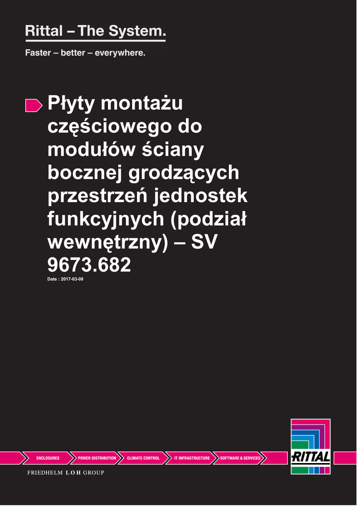 Płyty montażu częściowego do modułów ściany bocznej grodzących przestrzeń jednostek funkcyjnych (podział wewnętrzny) – SV 9673.682 Date : 2017-03-08 Płyty montażu częściowego do modułów ściany bocznej grodzących przestrzeń jednostek funkcyjnych (podział wewnętrzny) – SV 9673.682 created: 08.03.2017 on www.rittal.com/pl-pl Opis produktu Opis: Do bezpośredniego montażu na modułach ścian bocznych do podziału wewnętrznego. Uniwersalny montaż aparatury i urządzeń sterujących. Utworzenie dodatkowych płaszczyzn montażowych. W kombinacji z oddzielaczami przestrzeni jednostek funkcyjnych i modułami ściany bocznej możliwy jest podział przestrzeni typu 2, 3 lub 4. Materiał: blacha stalowa, 2 mm Powierzchnia: Ocynkowana Zakres dostawy: Wraz z kątownikiem mocującym i zestawem montażowym Cechy produktu Wersja: bez prowadzenia Pasujący do: Typ obudowy: TS 8 Szerokość: = 800 mm Wymiary: Szerokość: 702 mm Wysokość: 193 mm Pasuje do przestrzeni funkcyjnych: o wysokości: 200 mm Jednostka opakowania: 1 szt. © Rittal 2017 1 Masa/opak.: 3,65 kg EAN: 4028177544031 Numer taryfy celnej: 73269098 ETIM 6.0: EC001900 ETIM 5.0: EC001900 eCl@ss 8.0/8.1: 27400613 eCl@ss 7.0/7.1: 27400613 eCl@ss 6.0/6.1: 27400613 eCl@ss 5.1/5.1.4: 27370302 2017 © Rittal Sp. z o o. © Rittal 2017 2