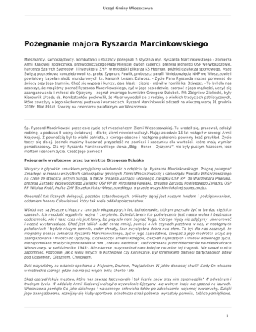 Urząd Gminy Włoszczowa Pożegnanie majora Ryszarda Marcinkowskiego Mieszkańcy, samorządowcy, kombatanci i strażacy pożegnali 5 stycznia mjr. Ryszarda Marcinkowskiego - żołnierza Armii Krajowej, społecznika, przewodniczącego Rady Miejskiej dwóch kadencji, prezesa Jednostki OSP we Włoszczowie, harcerza Szarych Szeregów i instruktora ZHP, w młodości piłkarza KS Hetman, później działacza sportowego. Mszę Świętą pogrzebową koncelebrowali ks. prałat Zygmunt Pawlik, proboszcz parafii Wniebowzięcia NMP we Włoszczowie i powiatowy kapelan służb mundurowych ks. kanonik Leszek Dziwosz. - Życie Pana Ryszarda można porównać do świecy przy Jego trumnie. Choć się wypala i kurczy, daje blask i ciepło - mówił w homilii ks. Dziwosz. - To był dla nas zaszczyt, że mogliśmy poznać Ryszarda Marcinkowskiego, żyć w jego sąsiedztwie, czerpać z jego mądrości, uczyć się zaangażowania i miłości do Ojczyzny - żegnał zmarłego burmistrz Grzegorz Dziubek. Płk Zbigniew Zieliński, były Kierownik Urzędu ds. Kombatantów podkreślił, że Major wywodził się z rodziny o wielkich tradycjach patriotycznych, które zaważyły o Jego niezłomnej postawie i wartościach. Ryszard Marcinkowski odszedł na wieczną wartę 31 grudnia 2016r. Miał 89 lat. Spoczął na cmentarzu parafialnym we Włoszczowie. Śp. Ryszard Marcinkowski przez całe życie był mieszkańcem Ziemi Włoszczowskiej. Tu urodził się, pracował, założył rodzinę, a podczas II wojny światowej – dla tej ziemi również walczył. Mając zaledwie 16 lat wstąpił w szeregi Armii Krajowej. Z pewnością był to wielki patriota, z którego obecne i następne pokolenia powinny brać przykład. Życie toczy się dalej. Jednak musimy budować przyszłość na pamięci i szacunku dla wartości, które mają wymiar ponadczasowy. Dla mjr Ryszarda Marcinkowskiego słowa „Bóg – Honor – Ojczyzna”, nie były pustym frazesem, lecz mottem i sensem życia. Cześć Jego pamięci! Pożegnanie wygłoszone przez burmistrza Grzegorza Dziubka Wszyscy z głębokim smutkiem przyjęliśmy wiadomość o odejściu śp. Ryszarda Marcinkowskiego. Pragnę pożegnać Zmarłego w imieniu wszystkich samorządów gminnych Ziemi Włoszczowskiej i samorządu Powiatu Włoszczowskiego na czele ze starostą Jerzym Suligą, a także prezesa Zarządu Głównego Związku OSP RP dh Waldemara Pawlaka, prezesa Zarządu Wojewódzkiego Związku OSP RP dh Mirosława Pawlaka, prezesa Zarządu Powiatowego Związku OSP RP Witolda Krotli, Hufca ZHP Szczekocińsko-Włoszczowskiego, a przede wszystkim lokalnej społeczności. Obecność tak licznych delegacji, pocztów sztandarowych, orkiestry dętej jest naszym hołdem i podziękowaniem, oddaniem honoru Człowiekowi, który tak wiele oddał społeczeństwu. Wśród nas są jeszcze chłopcy z tamtych okupacyjnych lat, bohaterowie, którym przyszło żyć w bardzo ciężkich czasach. Ich młodość wypełniła wojna i cierpienie. Dziedzictwem ich poświęcenia jest nasza wolna i beztroska codzienność. Ale i nasz czas nie jest łatwy, bo przyszło nam żegnać Tego, którego nigdy nie zdążymy uhonorować i uczcić wystarczająco. Choć jest takich ludzi coraz mniej, pamięć o ich czynach przetrwa w nas, w następnych pokoleniach i będzie niczym pomnik, order chwały, laur zwycięstwa dobra nad złem. To był dla nas zaszczyt, że mogliśmy poznać żołnierza Ryszarda Marcinkowskiego, żyć w jego sąsiedztwie, czerpać z jego mądrości, uczyć się zaangażowania i miłości do Ojczyzny. Doświadczył śmierci kolegów, cierpień najbliższych i trudów wojennego życia. Niezapomniane przeżycia pozostawiła w nim „krwawa niedziela”, rzeź dokonana przez hitlerowców na mieszkańcach Włoszczowy, w październiku 1943r. Nieustannie przypominał nam kolejne rocznice tej tragedii. Nie dawał o nich zapomnieć. Podobnie, jak o wielu innych: w Kurzelowie czy Koniecznie. Był strażnikiem pamięci partyzanckich bitew pod Kossowem, Olesznem, Chotowem. Dziś przyszliśmy na ostatnie spotkanie z Majorem, Druhem, Przyjacielem. W jakże doniosłej chwili! Kiedy On wkracza w niebieskie szeregi, gdzie nie ma już wojen, bólu, chorób i zła. Skąd czerpał lekcje męstwa, które nas zawsze fascynowało i tak licznie znów przy nim zgromadziło? W odważnym i trudnym życiu. W oddziale Armii Krajowej walczył o wyzwolenie Ojczyzny, ale wolnym kraju nie spoczął na laurach. Włoszczowa pamięta Go jako dzielnego i walecznego człowieka także po zakończeniu wojennej zawieruchy. Dzięki jego zaangażowaniu rozwijały się kluby sportowe, ochotnicza straż pożarna, wyrastały pomniki, tablice pamiątkowe. 1 Urząd Gminy Włoszczowa Zapamiętamy Go jako społecznika, radnego, ale też harcerza i po prostu niezwykle szlachetnego Obywatela naszego miasta. Zawsze oddany sprawom kombatanckim. Przewodniczący Powiatowej Rady Kombatantów i Osób Represjonowanych, prezes Koła Światowego Związku Żołnierzy Armii Krajowej stał się wzorem patriotyzmu dla kolejnych pokoleń młodych. Pielęgnując partyzanckie tradycje, uczestniczył w licznych spotkaniach z dziećmi i młodzieżą szkolną. Te spotkania były żywą lekcją historii. Wielokrotnie wspomnieniami ze swej żołnierskiej i życiowej drogi dzielił się z weteranami podczas dorocznych spotkań opłatkowych. Nie brakuje dowodów pamięci Jego bohaterstwa i postawy miłości do Ojczyzny, tej dużej i małej, lokalnej - Polaka, Oficera, Przewodniczącego Rady Miejskiej. Świadczą o tym liczne odznaczenie, ale przede wszystkim powszechny szacunek i uznanie. Takie codzienne: - Dzień dobry Panie Ryszardzie! Na co zawsze odpowiadał pogodnie i odwdzięczał się miłą rozmową. Mamy przed oczyma i w sercu uśmiechniętego komendanta uroczystości patriotycznych i religijnych. Nie mogły odbyć się bez niego. Podziwialiśmy Jego siłę, werwę, zapał mimo, że lata biegły nieubłaganie. Druhu, zaledwie kilka miesięcy temu przygotowywałe