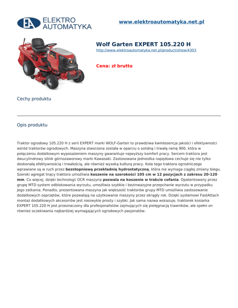 www.elektroautomatyka.net.pl Wolf Garten EXPERT 105.220 H http://www.elektroautomatyka.net.pl/product/show/4303 Cena: zł brutto Cechy produktu Opis produktu Traktor ogrodowy 105.220 H z serii EXPERT marki WOLF-Garten to prawdziwa kwintesencja jakości i efektywności wśród traktorów ogrodowych. Maszyna stworzona została w oparciu o solidną i trwałą ramę 900, która w połączeniu dodatkowym wyposażeniem maszyny gwarantuje najwyższy komfort pracy. Sercem traktora jest dwucylindrowy silnik górnozaworowy marki Kawasaki. Zastosowana jednostka napędowa cechuje się nie tylko doskonałą efektywnością i trwałością, ale również wysoką kulturą pracy. Koła tego traktora ogrodniczego wprawiane są w ruch przez bezstopniową przekładnię hydrostatyczną, która nie wymaga ciągłej zmiany biegu. Szeroki agregat tnący traktora umożliwia koszenie na szerokości 105 cm w 12 pozycjach z zakresu 20-120 mm. Co więcej, dzięki technologii OCR maszyna pozwala na koszenie w trakcie cofania. Opatentowany przez grupę MTD system odblokowania wyrzutu, umożliwia szybkie i bezinwazyjne przepchanie wyrzutu w przypadku jego zatkania. Ponadto, prezentowana maszyna jak większość traktorów grupy MTD umożliwia zastosowanie dodatkowych osprzętów, które pozwalają na użytkowanie maszyny przez okrągły rok. Dzięki systemowi FastAttach montaż dodatkowych akcesoriów jest niezwykle prosty i szybki. Jak sama nazwa wskazuje, traktorek kosiarka EXPERT 105.220 H jest przeznaczony dla profesjonalistów zajmujących się pielęgnacją trawników, ale spełni on również oczekiwania najbardziej wymagających ogrodowych pasjonatów. Kliknij aby obejrzeć filmik Dane techniczne: Silnik (typ/pojemność) Silnik (cylindry) Moc znamionowa (kW/min-1) Rozruch Pojemność zbiornika paliwa Rodzaj paliwa Rodzaj oleju Przekładnia napędowa Kawasaki FR 651 V / 726 cm³ 2 cylindry (V-Twin) 12,0 kW / 2400 min-1 elektryczny 10 L benzyna bezołowiowa SAE30 (10W30) Hydrostat Ilość biegów napędu 1 w przód / 1 w tył Oś skrętna (materiał) żeliwna Szerokość koszenia (cm) 105 cm Wysokość koszenia (mm) 20-120 mm Regulacja wysokości cięcia 12 pozycji, manualna Dysza do mycia agregatu Tak Cięcie na wstecznym biegu Tak Deflektor Kosz / pojemność kosza Zaślepka mieląca Koła (przód/tył) Łożyskowanie kół Promień skrętu opcja (196-972A678) Tak / 350 L opcja (196-751A678) 15" x 6" / 20" x 8" łożyska kulkowe 40 cm Reflektory przednie LED Zaczep tylny Tak Waga (około) 240 kg Dodatkowe informacje ładowarka do akumulatora w zestawie ELEKTRO-AUTOMATYKA Sprzedaż elektronarzędzi, urządzeń spawalniczych, maszyn budowlanych, pneumatyki, narzędzi warsztatowych, firmowych ubrań roboczych oraz maszyn ogrodowo leśnych. Sklep Bochnia ul. Brzeska 50 32-700 Bochnia Sklep Brzesko ul. Szarych Szeregów 23 32-800 Brzesko Serwis, Magazyn ul. Św. Brata Alberta 4 32-800 Brzesko tel. 691 572 333 e-mail: [email protected] tel. 609 523 230 e-mail: [email protected] tel. 609 523 645 e-mail: [email protected]
