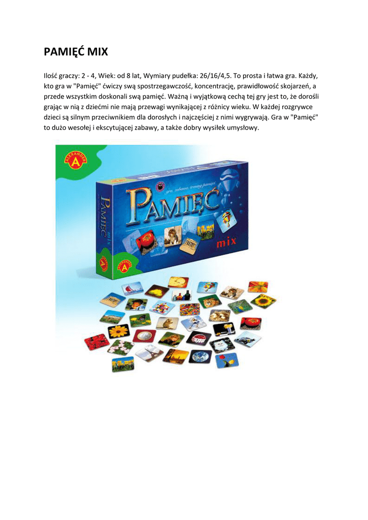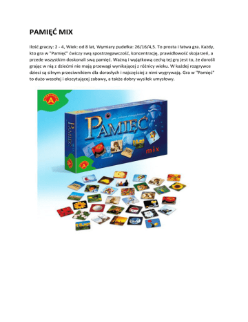 PAMIĘĆ MIX Ilośd graczy: 2 - 4, Wiek: od 8 lat, Wymiary pudełka: 26/16/4,5. To prosta i łatwa gra. Każdy, kto gra w "Pamięd" dwiczy swą spostrzegawczośd, koncentrację, prawidłowośd skojarzeo, a przede wszystkim doskonali swą pamięd. Ważną i wyjątkową cechą tej gry jest to, że dorośli grając w nią z dziedmi nie mają przewagi wynikającej z różnicy wieku. W każdej rozgrywce dzieci są silnym przeciwnikiem dla dorosłych i najczęściej z nimi wygrywają. Gra w "Pamięd" to dużo wesołej i ekscytującej zabawy, a także dobry wysiłek umysłowy.
