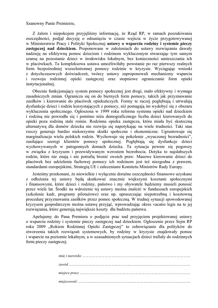 Szanowny Panie Premierze, Z żalem i niepokojem przyjęliśmy informację, że Rząd RP, w ramach poszukiwania oszczędności, podjął decyzję o odsunięciu w czasie wejścia w życie przygotowywanej w Ministerstwie Pracy i Polityki Społecznej ustawy o wsparciu rodziny i systemie pieczy zastępczej nad dzieckiem. Proponowane w założeniach do ustawy rozwiązania dawały nadzieję na efektywną pomoc dzieciom i rodzinom wykluczonym stwarzając tym samym szansę na pozostanie dzieci w środowisku lokalnym, bez konieczności umieszczania ich w placówkach. Ta kompleksowa ustawa umożliwiłaby powstanie po raz pierwszy realnych form bezpośredniej wszechstronnej pomocy rodzinie w kryzysie. Wyciągając wnioski z dotychczasowych doświadczeń, twórcy ustawy zaproponowali mechanizmy wsparcia i rozwoju rodzinnej opieki zastępczej oraz stopniowe ograniczanie form opieki instytucjonalnej. Obecnie funkcjonujący system pomocy społecznej jest drogi, mało efektywny i wymaga zasadniczych zmian. Ogranicza się on do biernych form pomocy, takich jak przyznawanie zasiłków i kierowanie do placówek opiekuńczych. Formy te raczej pogłębiają i utrwalają dysfunkcje dzieci i rodzin korzystających z pomocy, niż pomagają im wydobyć się z obszaru wykluczenia społecznego. Ogłoszona w 1999 roku reforma systemu opieki nad dzieckiem i rodziną nie powiodła się i pomimo niżu demograficznego liczba dzieci kierowanych do opieki poza rodziną stale rośnie. Rodzinna opieka zastępcza, która miała być skuteczną alternatywą dla domów dziecka nie rozwija się napotykając na wiele trudności. Taki stan rzeczy generuje bardzo niekorzystne skutki społeczne i ekonomiczne. Ugruntowuje się marginalizacja wielu polskich rodzin. Wychowuje się pokolenie „wyuczonej bezradności”, zasilające szeregi klientów pomocy społecznej. Pogłębiają się dysfunkcje dzieci wychowywanych w patogennych domach dziecka. Ta sytuacja pewnie się pogorszy w związku z kryzysem i przewidywanym wzrostem bezrobocia. Dotyka to najsłabszych rodzin, które nie znają i nie potrafią bronić swoich praw. Masowe kierowanie dzieci do placówek bez udzielenia fachowej pomocy ich rodzinom jest też niezgodna z prawem, standardami europejskimi, Strategią UE i zaleceniami Komitetu Ministrów Rady Europy. Jesteśmy przekonani, że niewielkie i wyłącznie doraźne oszczędności finansowe uzyskane z odłożenia tej ustawy będą skutkować znacznie większymi kosztami społecznymi i finansowymi, które dzieci i rodziny, państwo i my obywatele będziemy musieli ponosić przez wiele lat. Środki na wdrożenie tej ustawy można znaleźć w funduszach europejskich (szkolenie kadr, programy pilotażowe) oraz np. upraszczając niepotrzebną i kosztowną procedurę przyznawania zasiłków przez pomoc społeczną. W trudnej sytuacji spowodowanej kryzysem gospodarczym można ustawę przyjąć, wprowadzając okres vacatio legis na te jej rozwiązania, które generują największe koszty dla budżetu państwa. Apelujemy do Pana Premiera o podjęcie prac nad przyjęciem projektowanej ustawy o wsparciu rodziny i systemie pieczy zastępczej nad dzieckiem. Ogłoszenie przez Sejm RP roku 2009 „Rokiem Rodzinnej Opieki Zastępczej” to zobowiązanie dla polityków do stworzenia takich rozwiązań systemowych, by rodziny w kryzysie znajdowały pomoc i wsparcie na poziomie lokalnym, a w uzasadnionych sytuacjach dzieci trafiały do rodzinnych form pieczy zastępczej. imię i nazwisko ………………………………………………………………………………………. zawód …………………………………………………................................................................. miejsce pracy ………………………………………………………………………………………… miejscowość …………………………………………………………………………………………..
