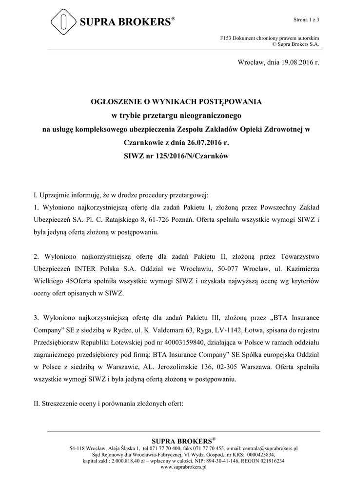 Strona 1 z 3 F153 Dokument chroniony prawem autorskim © Supra Brokers S.A. Wrocław, dnia 19.08.2016 r. OGŁOSZENIE O WYNIKACH POSTĘPOWANIA w trybie przetargu nieograniczonego na usługę kompleksowego ubezpieczenia Zespołu Zakładów Opieki Zdrowotnej w Czarnkowie z dnia 26.07.2016 r. SIWZ nr 125/2016/N/Czarnków I. Uprzejmie informuję, że w drodze procedury przetargowej: 1. Wyłoniono najkorzystniejszą ofertę dla zadań Pakietu I, złożoną przez Powszechny Zakład Ubezpieczeń SA. Pl. C. Ratajskiego 8, 61-726 Poznań. Oferta spełniła wszystkie wymogi SIWZ i była jedyną ofertą złożoną w postępowaniu. 2. Wyłoniono najkorzystniejszą ofertę dla zadań Pakietu II, złożoną przez Towarzystwo Ubezpieczeń INTER Polska S.A. Oddział we Wrocławiu, 50-077 Wrocław, ul. Kazimierza Wielkiego 45Oferta spełniła wszystkie wymogi SIWZ i uzyskała najwyższą ocenę wg kryteriów oceny ofert opisanych w SIWZ. 3. Wyłoniono najkorzystniejszą ofertę dla zadań Pakietu III, złożoną przez „BTA Insurance Company” SE z siedzibą w Rydze, ul. K. Valdemara 63, Ryga, LV-1142, Łotwa, spisana do rejestru Przedsiębiorstw Republiki Łotewskiej pod nr 40003159840, działająca w Polsce w ramach oddziału zagranicznego przedsiębiorcy pod firmą: BTA Insurance Company” SE Spółka europejska Oddział w Polsce z siedzibą w Warszawie, AL. Jerozolimskie 136, 02-305 Warszawa. Oferta spełniła wszystkie wymogi SIWZ i była jedyną ofertą złożoną w postępowaniu. II. Streszczenie oceny i porównania złożonych ofert: SUPRA BROKERS® 54-118 Wrocław, Aleja Śląska 1, tel.071 77 70 400, faks 071 77 70 455, e-mail: [email protected] Sąd Rejonowy dla Wrocławia-Fabrycznej, VI Wydz. Gospod., nr KRS: 0000425834, kapitał zakł.: 2.000.818,40 zł – wpłacony w całości, NIP: 894-30-41-146, REGON 021916234 www.suprabrokers.pl Strona 2 z 3 F153 Dokument chroniony prawem autorskim © Supra Brokers S.A. 1. Dla zadań Pakietu I Numer oferty 5 Nazwa i adres wykonawcy Liczba pkt. w kryterium CENA Liczba pkt. w kryterium WARUNKI UBEZPIECZENIA Łączna liczba punktów Powszechny Zakład Ubezpieczeń SA. Pl. C. Ratajskiego 8, 61-726 Poznań 90 10 100 Liczba pkt. w kryterium CENA Liczba pkt. w kryterium WARUNKI UBEZPIECZENIA Łączna liczba punktów 80 20 100 38,75 13,60 52,35 16,01 17,60 33,61 35,35 10,40 45,75 2. Dla zadań Pakietu II Numer oferty 2 3 4 5 Nazwa i adres wykonawcy Towarzystwo ubezpieczeń INTER Polska S.A. Oddział we Wrocławiu, 50-077 Wrocław, ul. Kazimierza Wielkiego 45 InterRisk Towarzystwo Ubezpieczeń S.A. VIG Oddział w Poznaniu, 60-589 Poznań, ul. Piękna 58 „BTA Insurance Company” SE z siedzibą w Rydze, ul. K. Valdemara 63, Ryga, LV-1142, Łotwa, spisana do rejestru Przedsiębiorstw Republiki Łotewskiej pod nr 40003159840, działająca w Polsce w ramach oddziału zagranicznego przedsiębiorcy pod firmą: BTA Insurance Company” SE Spółka europejska Oddział w Polsce z siedzibą w Warszawie, AL. Jerozolimskie 136, 02-305 Warszawa Powszechny Zakład Ubezpieczeń SA. Pl. C. Ratajskiego 8, 61-726 Poznań 3. Dla zadań Pakietu III SUPRA BROKERS® 54-118 Wrocław, Aleja Śląska 1, tel.071 77 70 400, faks 071 77 70 455, e-mail: [email protected] Sąd Rejonowy dla Wrocławia-Fabrycznej, VI Wydz. Gospod., nr KRS: 0000425834, kapitał zakł.: 2.000.818,40 zł – wpłacony w całości, NIP: 894-30-41-146, REGON 021916234 www.suprabrokers.pl Strona 3 z 3 F153 Dokument chroniony prawem autorskim © Supra Brokers S.A. Nazwa i adres wykonawcy Liczba pkt. w kryterium CENA Liczba pkt. w kryterium WARUNKI UBEZPIECZENIA Łączna liczba punktów „BTA Insurance Company” SE z siedzibą w Rydze, ul. K. Valdemara 63, Ryga, LV-1142, Łotwa, spisana do rejestru Przedsiębiorstw Republiki Łotewskiej pod nr 40003159840, działająca w Polsce w ramach oddziału zagranicznego przedsiębiorcy pod firmą: BTA Insurance Company” SE Spółka europejska Oddział w Polsce z siedzibą w Warszawie, AL. Jerozolimskie 136, 02-305 Warszawa 90 0 90 Numer oferty 4 III. W postępowaniu odrzucono oferty następujących wykonawców wykonawcy. Dla zadań Pakietu II 1) TUZ Towarzystwo Ubezpieczeń Wzajemnych, ul. Poleczki 35, 02-822 Warszawa uzasadnienie faktyczne: treść oferty nie odpowiada treści specyfikacji istotnych warunków zamówienia oraz oferta zawiera rażąco niską cenę w stosunku do przedmiotu zamówienia uzasadnienie prawne: art. 89 ust. 1 pkt. 2 ustawy Prawo zamówień publicznych oraz art. 89 ust. 1 pkt. 4 ustawy Prawo zamówień publicznych IV. Z postępowania nie wykluczono żadnego z wykonawców. V. Umowa w sprawie zamówienia publicznego dla zadań Pakietu I, II, III zostanie zawarta po upływie terminu wskazanego w art. 94 ust. 1 pkt 2 ustawy Prawo zamówień publicznych. Marek Kopecki SUPRA BROKERS® 54-118 Wrocław, Aleja Śląska 1, tel.071 77 70 400, faks 071 77 70 455, e-mail: [email protected] Sąd Rejonowy dla Wrocławia-Fabrycznej, VI Wydz. Gospod., nr KRS: 0000425834, kapitał zakł.: 2.000.818,40 zł – wpłacony w całości, NIP: 894-30-41-146, REGON 021916234 www.suprabrokers.pl