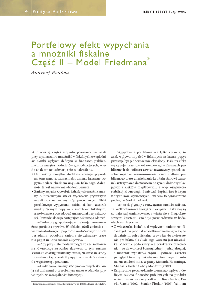 4 Polityka Bud˝etowa BANK I KREDYT l u t y 2 0 0 5 Portfelowy efekt wypychania a mno˝niki fiskalne Cz´Êç II – Model Friedmana * A n d rz e j R z o ƒ c a W pierwszej cz´Êci artyku∏u pokazano, ˝e je˝eli przy wyznaczaniu mno˝ników fiskalnych uwzgl´dni si´ skutki wp∏ywu deficytu w finansach publicznych na majàtek podmiotów gospodarujàcych, wtedy znak mno˝ników staje si´ nieokreÊlony. • Na zmiany majàtku dodatnio reaguje prywatna konsumpcja, wzmacniajàc zmian´ ∏àcznego popytu, b´dàcà skutkiem impulsu fiskalnego. Zale˝noÊç ta jest nazywana efektem Lernera. • Zmiany majàtku wywo∏ujà jednak jednoczeÊnie zmiany o przeciwnym znaku wydatków prywatnych wra˝liwych na zmiany stóp procentowych. Efekt portfelowego wypychania os∏abia dodatni zwiàzek mi´dzy ∏àcznym popytem a impulsami fiskalnymi, a mo˝e nawet spowodowaç zmian´ znaku tej zale˝noÊci. Prowadzi do tego nast´pujàca sekwencja zdarzeƒ. – Podmioty gospodarujàce preferujà zrównowa˝one portfele aktywów. W efekcie, je˝eli zmienia si´ wartoÊç skarbowych papierów wartoÊciowych w ich posiadaniu, podobnie zmienia si´ zg∏aszany przez nie popyt na inne rodzaje aktywów. – Aby przy sta∏ej poda˝y mog∏a zostaç zachowana równowaga na rynku aktywów, w tym samym kierunku co d∏ug publiczny muszà zmieniç si´ stopy procentowe i sprowadziç popyt na pozosta∏e aktywa do wyjÊciowego poziomu. – Dodatkowo, zmiany stóp procentowych skutkujà zaÊ zmianami o przeciwnym znaku wydatków prywatnych, w szczególnoÊci inwestycji. * Pierwszà cz´Êç artyku∏u opublikowaliÊmy w nr. 1/2005 „Banku i Kredytu”. Wypychanie portfelowe nie tylko sprawia, ˝e znak wp∏ywu impulsów fiskalnych na ∏àczny popyt przestaje byç jednoznacznie okreÊlony. JeÊli ten efekt wyst´puje, przejÊciu od równowagi w finansach publicznych do deficytu zawsze towarzyszy spadek zasobu kapita∏u. Zrównowa˝enie wzrostu d∏ugu publicznego przez zmniejszenie kapita∏u stanowi warunek zatrzymania dostosowaƒ na rynku dóbr, wynikajàcych z efektów majàtkowych, a wi´c osiàgni´cia stabilnej równowagi. Poniewa˝ kapita∏ jest jednym z czynników wytwórczych, oznacza to ograniczenie poda˝y w Êrednim okresie. Wniosek p∏ynàcy z rozwiàzania modelu Silbera, ˝e krótkookresowe korzyÊci z ekspansji fiskalnej sà co najwy˝ej umiarkowane, a wià˝à si´ z d∏ugookresowymi kosztami, znajduje potwierdzenie w badaniach empirycznych. • Z wi´kszoÊci badaƒ nad wp∏ywem zmiennych fiskalnych na produkt w krótkim okresie wynika, ˝e dodatnie impulsy fiskalne prowadzà do zwi´kszenia produktu, ale skala tego wzrostu jest niewielka. Mno˝nik podatkowy nie przekracza przeci´tnie – co do wartoÊci bezwzgl´dnej – jednej drugiej, a mno˝nik wydatków rzàdu – jednoÊci. Szeroki przeglàd literatury poÊwi´conej temu zagadnieniu mo˝na znaleêç m.in. w pracy Richarda Hemminga, Michaela Kella i Selmy Mahfouz (2002). • Empiryczne potwierdzenie ujemnego wp∏ywu deficytu sektora finansów publicznych na produkt w Êrednim okresie uzyskali m.in. Ross Levine, David Renelt (1992), Stanley Fischer (1993), William Polityka Bud˝etowa 5 BANK I KREDYT l u t y 2 0 0 5 Easterly, Carlos A. Rodriguez i Klaus Schmidt-Hebbel (1994) oraz Michael Bleaney, Norman Gemmell, Richard Kneller (2001). Model prezentowany w poprzedniej cz´Êci artyku∏u ma jednak co najmniej jednà dodatkowà s∏aboÊç oprócz tych, które tam wymieniono. Przyj´to w nim za standardowym modelem IS-LM za∏o˝enie, ˝e skarbowe papiery wartoÊciowe i kapita∏ fizyczny sà doskona∏ymi substytutami. Poni˝ej za∏o˝enie to zosta∏o uchylone. W rezultacie, w miejsce jednej stopy procentowej pojawi∏y si´ dwie1: oczekiwana (satysfakcjonujàca podmioty gospodarujàce) stopa zwrotu z kapita∏u fizycznego, okreÊlajàca minimalnà rentownoÊç wydatków inwestycyjnych planowanych przez sektor prywatny oraz stopa zwrotu ze skarbowych papierów wartoÊciowych, determinujàca rentownoÊç ich nowych emisji. Taka modyfikacja odró˝nia modele monetarystyczne od ortodoksyjnych keynesowskich (zob. np. Allan H. Meltzer, 1995). Przybli˝a ona zale˝noÊci zak∏adane w modelu do wyst´pujàcych w gospodarce. JednoczeÊnie, w jej wyniku poszerza si´ zakres mo˝liwych równowag osiàganych po wystàpieniu wstrzàsu; ostateczna reakcja poszczególnych zmiennych na wstrzàs staje si´ mniej jednoznaczna ni˝ w podejÊciu ortodoksyjnym keynesowskim. Model przedstawiony w tym artykule jest modyfikacjà modelu Benjamina Friedmana (1978). Przygotowujàc ten artyku∏, posi∏kowa∏em si´ tak˝e artyku∏ami: Jamesa Tobina i Williama C. Brainarda (1963), Jamesa Tobina (1969) i Allana H. Meltzera (1995). W polskiej literaturze ekonomicznej opis idei modelu Friedmana mo˝na znaleêç w pracy Urszuli Kosterny (1995). G∏ówna zmiana w porównaniu z wyjÊciowym modelem polega na uchyleniu upraszczajàcego za∏o˝enia, ˝e zasób kapita∏u jest sta∏y, tzn. nie zale˝y od wielkoÊci nak∏adów inwestycyjnych. Dzi´ki tej pozornie ma∏o istotnej modyfikacji zosta∏a usuni´ta wada wyjÊciowego modelu, polegajàca na niemo˝noÊci osiàgni´cia równowagi przez gospodark´ po wystàpieniu wstrzàsu. Do tej wady – wed∏ug najlepszej wiedzy autora – nikt wczeÊniej si´ nie odniós∏, a by∏a ona powa˝na; z modelu – w jego standardowej wersji – wynika∏o, ˝e skutkiem przejÊcia od równowagi do deficytu powinny byç niekoƒczàce si´ zmiany stóp procentowych i poziomu produktu. Benjamin Friedman (1978) przedstawi∏ jedynie ostateczny wynik algebraicznego rozwiàzania modelu. Urszula Kosterna (1995) pokaza∏a graficzne roz1 Faktycznie w standardowym modelu IS-LM wyst´pujà dwie stopy procentowe, a w niniejszym trzy. Tà dodatkowà stopà procentowà jest stopa zwrotu z pieniàdza. Poniewa˝ jednak przyjmuje si´ jà za sta∏à, nie ma ona wp∏ywu na wyniki analizy skutków wstrzàsów badanych przy u˝yciu modelu
