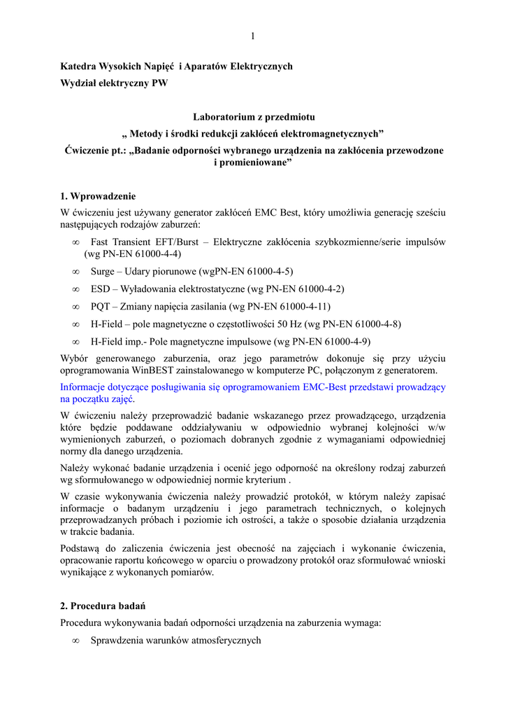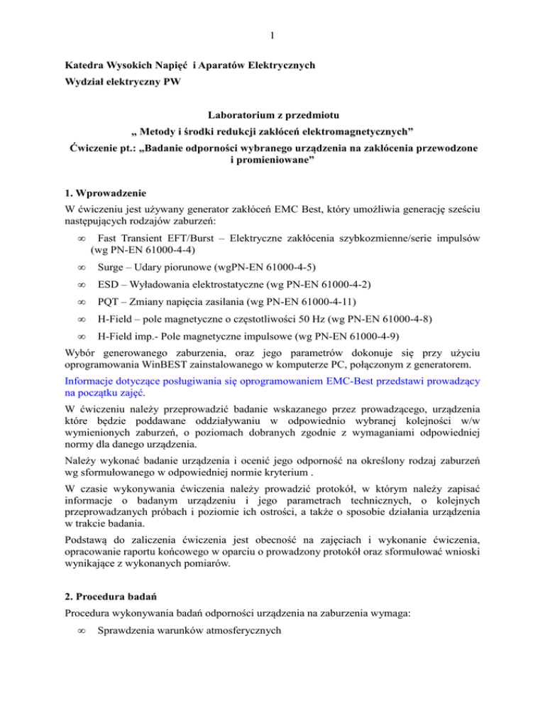 1 Katedra Wysokich Napięć i Aparatów Elektrycznych Wydział elektryczny PW Laboratorium z przedmiotu „ Metody i środki redukcji zakłóceń elektromagnetycznych” Ćwiczenie pt.: „Badanie odporności wybranego urządzenia na zakłócenia przewodzone i promieniowane” 1. Wprowadzenie W ćwiczeniu jest używany generator zakłóceń EMC Best, który umożliwia generację sześciu następujących rodzajów zaburzeń: • Fast Transient EFT/Burst – Elektryczne zakłócenia szybkozmienne/serie impulsów (wg PN-EN 61000-4-4) • Surge – Udary piorunowe (wgPN-EN 61000-4-5) • ESD – Wyładowania elektrostatyczne (wg PN-EN 61000-4-2) • PQT – Zmiany napięcia zasilania (wg PN-EN 61000-4-11) • H-Field – pole magnetyczne o częstotliwości 50 Hz (wg PN-EN 61000-4-8) • H-Field imp.- Pole magnetyczne impulsowe (wg PN-EN 61000-4-9) Wybór generowanego zaburzenia, oraz jego parametrów dokonuje się przy użyciu oprogramowania WinBEST zainstalowanego w komputerze PC, połączonym z generatorem. Informacje dotyczące posługiwania się oprogramowaniem EMC-Best przedstawi prowadzący na początku zajęć. W ćwiczeniu należy przeprowadzić badanie wskazanego przez prowadzącego, urządzenia które będzie poddawane oddziaływaniu w odpowiednio wybranej kolejności w/w wymienionych zaburzeń, o poziomach dobranych zgodnie z wymaganiami odpowiedniej normy dla danego urządzenia. Należy wykonać badanie urządzenia i ocenić jego odporność na określony rodzaj zaburzeń wg sformułowanego w odpowiedniej normie kryterium . W czasie wykonywania ćwiczenia należy prowadzić protokół, w którym należy zapisać informacje o badanym urządzeniu i jego parametrach technicznych, o kolejnych przeprowadzanych próbach i poziomie ich ostrości, a także o sposobie działania urządzenia w trakcie badania. Podstawą do zaliczenia ćwiczenia jest obecność na zajęciach i wykonanie ćwiczenia, opracowanie raportu końcowego w oparciu o prowadzony protokół oraz sformułować wnioski wynikające z wykonanych pomiarów. 2. Procedura badań Procedura wykonywania badań odporności urządzenia na zaburzenia wymaga: • Sprawdzenia warunków atmosferycznych 2 W celu określenia ewentualnego wpływu czynników środowiskowych na wyniki badań, badania powinny być wykonywane w warunkach atmosferycznych określonych poniżej. Warunki atmosferyczne wg norm powinny być następujące: o temperatura otoczenia od 15° C do 35° C • • • o wilgotność względna od 25% do 75% o ciśnienie atmosferyczne od 86 kPa (860 mbar) do 106 kPa (1060 mbar) Stwierdzenia, że pole elektromagnetyczne w laboratorium generowane przez niezidentyfikowane czynniki zewnętrzne nie powinno wpływać na poprawne działanie badanego urządzenia Wstępne sprawdzenie poprawności działania badanego urządzenia zgodnie ze specyfikacją techniczną. Określenia sposobu wykonywania badań Badania należy wykonywać na podstawie przyjętego planu. Należy obserwować pracę badanego urządzenia podczas wykonywania badań. W planie badania należy określić: o rodzaj badań, które będą wykonane; o poziomy probiercze zaburzeń (napięcia lub natężenia pola magnetycznego) o biegunowość napięcia probierczego (w zależności od rodzaju badania); o czas trwania badania (nie mniejszy niż 1 min); o liczbę narażeń napięciem probierczym / liczbę impulsów pola; o sposób przyłączenia badanego urządzenia (EUT); o kolejność generowania zaburzeń (napięcia / impulsów pola) do badanego urządzenia o użycie sprzętu pomocniczego. • Ocenę wyników badania. 3. Zakres wykonywania ćwiczenia Należy zapoznać się z poszczególnymi normami przedmiotowymi, głównie w zakresie: • procedur badawczych • klasyfikacji badanego urządzenia • sposobu ustalania poziomów probierczych • kryteriów oceny działania urządzenia • sposobu interpretacji wyników badań i przygotowania sprawozdania (raportu) z badania Wykonanie ćwiczenia polega na określeniu planu badania, realizację badań według przyjętego programu dla urządzenia przeznaczonego do badań. 3 4. Opracowanie raportu końcowego Warunkiem zaliczenia ćwiczenia jest opracowanie raportu zawierającego opis realizacji badań, wyniki badań i ich analizę oraz wnioski. Raport należy przedstawić do oceny na kolejnych zajęciach po wykonaniu ćwiczenia.