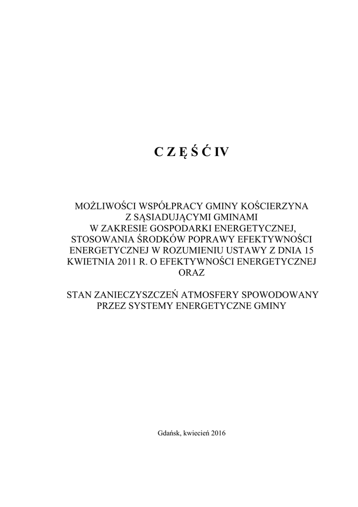 C Z Ę Ś Ć IV MOŻLIWOŚCI WSPÓŁPRACY GMINY KOŚCIERZYNA Z SĄSIADUJĄCYMI GMINAMI W ZAKRESIE GOSPODARKI ENERGETYCZNEJ, STOSOWANIA ŚRODKÓW POPRAWY EFEKTYWNOŚCI ENERGETYCZNEJ W ROZUMIENIU USTAWY Z DNIA 15 KWIETNIA 2011 R. O EFEKTYWNOŚCI ENERGETYCZNEJ ORAZ STAN ZANIECZYSZCZEŃ ATMOSFERY SPOWODOWANY PRZEZ SYSTEMY ENERGETYCZNE GMINY Gdańsk, kwiecień 2016 Projekt założeń do planu zaopatrzenia w ciepło, energię elektryczną i paliwa gazowe dla gminy Kościerzyna – aktualizacja C Z Ę Ś Ć IV - SPIS TREŚCI 1. CHARAKTERYSTYKA ENERGETYCZNA GMINY KOŚCIERZYNA ORAZ SĄSIADUJĄCYCH GMIN ............................................................................................ 3 1.1. CHARAKTERYSTYKA GMINY KOŚCIERZYNA............................................................................................... 3 1.2. CHARAKTERYSTYKA GMIN SĄSIADUJĄCYCH Z GMINĄ KOŚCIERZYNA ........................................................ 7 2. POTENCJALNE MOŻLIWOŚCI, ZAKRES WSPÓŁPRACY GMINY KOŚCIERZYNA Z SĄSIADUJĄCYMI GMINAMI W RÓŻNYCH SEKTORACH ENERGETYCZNYCH ........................................................................ 20 2.1. 2.2. 2.3. 2.4. 2.5. ZAOPATRZENIE W CIEPŁO ......................................................................................................................... 20 ZAOPATRZENIE W ENERGIĘ ELEKTRYCZNĄ .............................................................................................. 20 ZAOPATRZENIE W PALIWA GAZOWE ......................................................................................................... 21 ODNAWIALNE ŹRÓDŁA ENERGII (OZE) .................................................................................................... 21 UWAGI I WNIOSKI ..................................................................................................................................... 22 3. MOŻLIWOŚCI STOSOWANIA ŚRODKÓW POPRAWY EFEKTYWNOŚCI ENERGETYCZNEJ W ROZUMIENIU USTAWY Z DNIA 15 KWIETNIA 2011 R. O EFEKTYWNOŚCI ENERGETYCZNEJ............................................................. 23 4. STAN ZANIECZYSZCZEŃ ATMOSFERY SPOWODOWANY PRZEZ SYSTEMY ENERGETYCZNE MIASTA I GMINY .................................................. 25 4.1. 4.2. 4.3. 4.4. 4.5. 4.6. ŹRÓDŁA EMISJI ZANIECZYSZCZEŃ ............................................................................................................ 25 ANALIZA EMISJI ZANIECZYSZCZEŃ W LATACH 2014-2015 ....................................................................... 25 ANALIZA EMISJI ZANIECZYSZCZEŃ W ROKU 2021 .................................................................................... 26 ANALIZA EMISJI ZANIECZYSZCZEŃ W ROKU 2031 .................................................................................... 26 OCENA POPRAWY STANU POWIETRZA ATMOSFERYCZNEGO ..................................................................... 27 WNIOSKI DOTYCZĄCE STANU AKTUALNEGO POWIETRZA ATMOSFERYCZNEGO ........................................ 29 2 Fundacja Poszanowania Energii w Gdańsku 2016 Projekt założeń do planu zaopatrzenia w ciepło, energię elektryczną i paliwa gazowe dla gminy Kościerzyna – aktualizacja 1. CHARAKTERYSTYKA ENERGETYCZNA GMINY KOŚCIERZYNA ORAZ SĄSIADUJĄCYCH GMIN 1.1. Charakterystyka gminy Kościerzyna Gmina wiejska Kościerzyna leży w południowo - środkowej części Województwa Pomorskiego w Powiecie Kościerskim, na pograniczu Pojezierza Kaszubskiego (Szwajcarii Kaszubskiej) i Borów Tucholskich. Na terenie gminy znajduje się kilka większych jezior Pojezierza Kaszubskiego, tj. m.in. Gołuń, Sudomie, Garczyn i w bardzo niewielkim zakresie jezioro Wdzydze. Gmina Kościerzyna sąsiaduje bezpośrednio z następującymi gminami i miastami: - od strony wschodniej z gminami Nowa Karczma i Liniewo, - od strony południowej i południowego-wschodu z gminami Stara Kiszewa i Karsin, - od strony zachodniej z gminami Dziemiany i Lipusz, - od strony północnej i północnego-wschodu z gminami Stężyca, Sulęczyno i Somonino należącymi do powiatu kartuskiego, - otacza miasto Kościerzyna. Lokalizację gmin sąsiadujących z gminą Kościerzyna na terenie województwa pomorskiego przedstawiono na rysunku nr 1.1. Powierzchnia gminy w aktualnych granicach administracyjnych wynosi 309,19 km2. Na obszarze gminy zlokalizowane jest 74 miejscowości wiejskich w 36 sołectwach. Siedziba gminy zlokalizowana jest w mieście Kościerzyna. Według stanu na dzień 31.12.2015 r. gmina liczy 15.404 mieszkańców. Gęstość zaludnienia wynosi blisko 50 osób na 1 km2. Lasy i grunty leśne zajmują powierzchnię ok. 14.923 ha (48% powierzchni gminy), zaś użytki rolne – ok. 11.772 ha (znaczna większość to grunty orne), co stanowi ok. 38% powierzchni, natomiast wody zajmują powierzchnię ok. 1.879 ha, co stanowi ok. 6% powierzchni gminy. Tereny zurbanizowane zajmują około 1.474 ha i stanowią ok. 5% powierzchni. Nieużytki oraz pozostałe tereny obejmują obszar około 871 ha, co stanowi ponad 3% obszaru gminy. Gmina Kościerzyna jest typową gminą rolniczo – turystyczną. Główne sektory gospodarki gminy ukierunkowane są na: turystykę, rolnictwo oraz różnego rodzaju drobne usługi. Na terenie gminy funkcjonują także zakłady przemysłowe o znaczeniu ponadlokalnym, zajmujące się produkcją ceramiki, drzewną i materiałów budowlanych. Rolnictwo jest dominującą formą działalności gospodarczej. Gospodarstwa rolne i podmioty działające w otoczeniu rolnictwa, w tym turystyka stanowią potencjał gospodarczo – ekonomiczny gminy. Dogodne warunki dla rozwoju gospodarki rolnej na obszarze gminy stwarzają gleby. Na terenie gminy Kościerzyna występują zróżnicowane warunki glebowe. Dominują gleby brunatne wyługowane i brunatne kwaśne oraz gleby bielicowe i pseudobielicowe. Znaczne powierzchnie zajmują także gleby pochodzenia organogenicznego – torfowo-mułowe, murszowotorfowe i torfy. Na terenie gmi