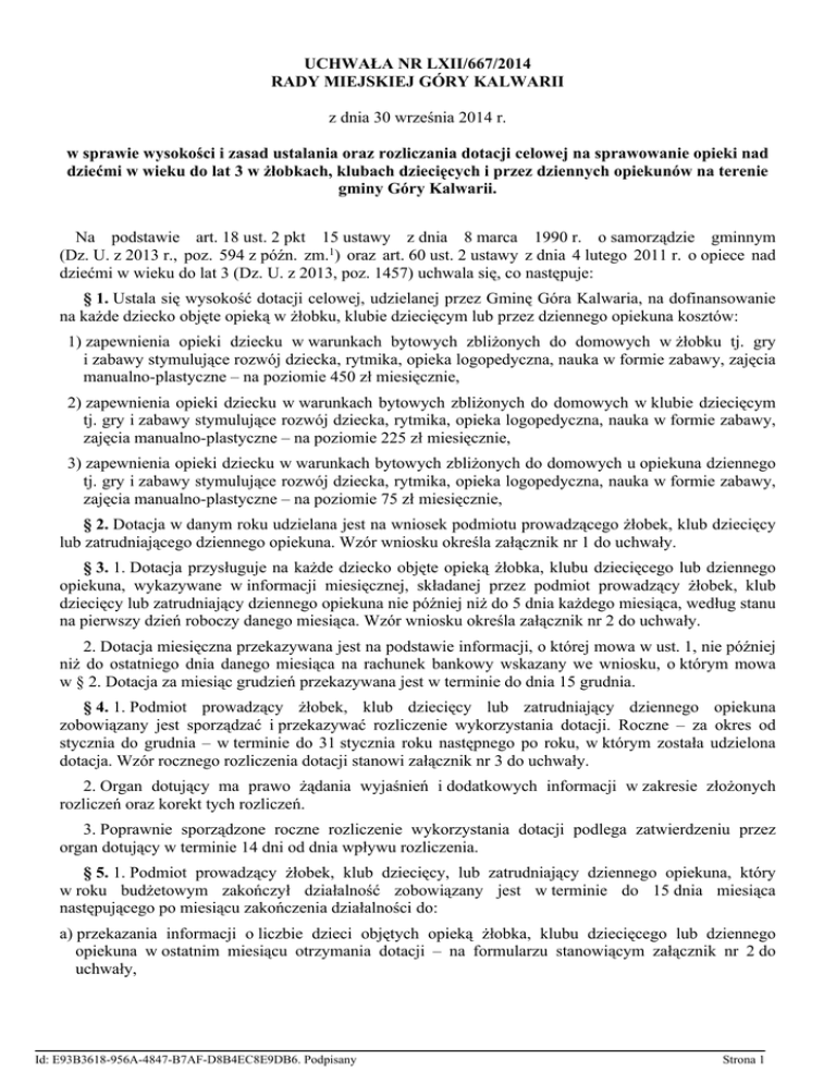 UCHWAŁA NR LXII/667/2014 RADY MIEJSKIEJ GÓRY KALWARII z dnia 30 września 2014 r. w sprawie wysokości i zasad ustalania oraz rozliczania dotacji celowej na sprawowanie opieki nad dziećmi w wieku do lat 3 w żłobkach, klubach dziecięcych i przez dziennych opiekunów na terenie gminy Góry Kalwarii. Na podstawie art. 18 ust. 2 pkt 15 ustawy z dnia 8 marca 1990 r. o samorządzie gminnym (Dz. U. z 2013 r., poz. 594 z późn. zm.1) oraz art. 60 ust. 2 ustawy z dnia 4 lutego 2011 r. o opiece nad dziećmi w wieku do lat 3 (Dz. U. z 2013, poz. 1457) uchwala się, co następuje: § 1. Ustala się wysokość dotacji celowej, udzielanej przez Gminę Góra Kalwaria, na dofinansowanie na każde dziecko objęte opieką w żłobku, klubie dziecięcym lub przez dziennego opiekuna kosztów: 1) zapewnienia opieki dziecku w warunkach bytowych zbliżonych do domowych w żłobku tj. gry i zabawy stymulujące rozwój dziecka, rytmika, opieka logopedyczna, nauka w formie zabawy, zajęcia manualno-plastyczne – na poziomie 450 zł miesięcznie, 2) zapewnienia opieki dziecku w warunkach bytowych zbliżonych do domowych w klubie dziecięcym tj. gry i zabawy stymulujące rozwój dziecka, rytmika, opieka logopedyczna, nauka w formie zabawy, zajęcia manualno-plastyczne – na poziomie 225 zł miesięcznie, 3) zapewnienia opieki dziecku w warunkach bytowych zbliżonych do domowych u opiekuna dziennego tj. gry i zabawy stymulujące rozwój dziecka, rytmika, opieka logopedyczna, nauka w formie zabawy, zajęcia manualno-plastyczne – na poziomie 75 zł miesięcznie, § 2. Dotacja w danym roku udzielana jest na wniosek podmiotu prowadzącego żłobek, klub dziecięcy lub zatrudniającego dziennego opiekuna. Wzór wniosku określa załącznik nr 1 do uchwały. § 3. 1. Dotacja przysługuje na każde dziecko objęte opieką żłobka, klubu dziecięcego lub dziennego opiekuna, wykazywane w informacji miesięcznej, składanej przez podmiot prowadzący żłobek, klub dziecięcy lub zatrudniający dziennego opiekuna nie później niż do 5 dnia każdego miesiąca, według stanu na pierwszy dzień roboczy danego miesiąca. Wzór wniosku określa załącznik nr 2 do uchwały. 2. Dotacja miesięczna przekazywana jest na podstawie informacji, o której mowa w ust. 1, nie później niż do ostatniego dnia danego miesiąca na rachunek bankowy wskazany we wniosku, o którym mowa w § 2. Dotacja za miesiąc grudzień przekazywana jest w terminie do dnia 15 grudnia. § 4. 1. Podmiot prowadzący żłobek, klub dziecięcy lub zatrudniający dziennego opiekuna zobowiązany jest sporządzać i przekazywać rozliczenie wykorzystania dotacji. Roczne – za okres od stycznia do grudnia – w terminie do 31 stycznia roku następnego po roku, w którym została udzielona dotacja. Wzór rocznego rozliczenia dotacji stanowi załącznik nr 3 do uchwały. 2. Organ dotujący ma prawo żądania wyjaśnień i dodatkowych informacji w zakresie złożonych rozliczeń oraz korekt tych rozliczeń. 3. Poprawnie sporządzone roczne rozliczenie wykorzystania dotacji podlega zatwierdzeniu przez organ dotujący w terminie 14 dni od dnia wpływu rozliczenia. § 5. 1. Podmiot prowadzący żłobek, klub dziecięcy, lub zatrudniający dziennego opiekuna, który w roku budżetowym zakończył działalność zobowiązany jest w terminie do 15 dnia miesiąca następującego po miesiącu zakończenia działalności do: a) przekazania informacji o liczbie dzieci objętych opieką żłobka, klubu dziecięcego lub dziennego opiekuna w ostatnim miesiącu otrzymania dotacji – na formularzu stanowiącym załącznik nr 2 do uchwały, Id: E93B3618-956A-4847-B7AF-D8B4EC8E9DB6. Podpisany Strona 1 b) przekazania rozliczenia wykorzystania otrzymanej dotacji – na formularzu stanowiącym załącznik nr 3 do uchwały. 2. O wynikach rozliczenia dotacji Burmistrz Gminy Góra Kalwaria powiadamia podmiot prowadzący żłobek, klub dziecięcy lub zatrudniający dziennego opiekuna w terminie do 15 dnia miesiąca następującego po miesiącu złożenia informacji, o których mowa w ust.1 lit a) i b). § 6. Dotacja, o której mowa w § 1, wykorzystana niezgodnie z przeznaczeniem, pobrana nienależnie lub w nadmiernej wysokości podlega zwrotowi do budżetu na zasadach określonych przepisami ustawy o finansach publicznych (Dz. U. z 2013 r., poz. 885 ze zm.). § 7. Traci moc uchwała Nr XIII/121/2011 Rady Miejskiej Góry Kalwarii z dnia 26 lipca 2011 r. w sprawie wysokości oraz zasad ustalania dotacji celowej dla podmiotów prowadzących żłobki lub kluby dziecięce, uchwała Nr XV/134/2011 Rady Miejskiej Góry Kalwarii z dnia 25 sierpnia 2011 r. w sprawie zmiany uchwały Nr XIII/121/2011 Rady Miejskiej Góry Kalwarii z dnia 26 lipca 2011 r. w sprawie wysokości oraz zasad ustalania dotacji celowej dla podmiotów prowadzących żłobki lub kluby dziecięce oraz uchwała Nr XIII/120/2011 Rady Miejskiej Góry Kalwarii z dnia 26 lipca 2011 r. w sprawie maksymalnej wysokości wynagrodzenia dziennego opiekuna oraz zasad jego ustalania. § 8. Wykonanie uchwały powierza się Burmistrzowi Miasta i Gminy Góra Kalwaria. § 9. Uchwała wchodzi w życie po upływie 14 dni od jej ogłoszenia w dzienniku Urzędowym Województwa Mazowieckiego. Przewodniczący Rady Miejskiej Zbigniew Bugno 1] Zmiany ustawy zostały ogłoszone w: Dz. U z 2013 r. poz. 645, poz. 1318; z 2014 r. poz. 379, poz. 1072. Id: E93B3618-956A-4847-B7AF-D8B4EC8E9DB6. Podpisany Strona 2 ………………………………………….. (pieczęć podmiotu prowadzącego żłobek/klub dziecięcy lub zatrudniającego dziennego opiekuna) Załącznik Nr 1 do Uchwały Rady Miejskiej Góry Kalwarii Nr LXII/667/2014 z dnia 30 września 2014 r. Burmistrz Miasta i Gminy Góra Kalwaria WNIOSEK o udzielenie dotacji celowej dla podmiotu prowadzącego żłobek/klub dziecięcy/lub zatrudniającego dziennego opiekuna* na terenie Gminy Góra Kalwaria w roku …………… 1. Nazwa/imię i nazwisko oraz siedziba/adres podmiotu prowadząc