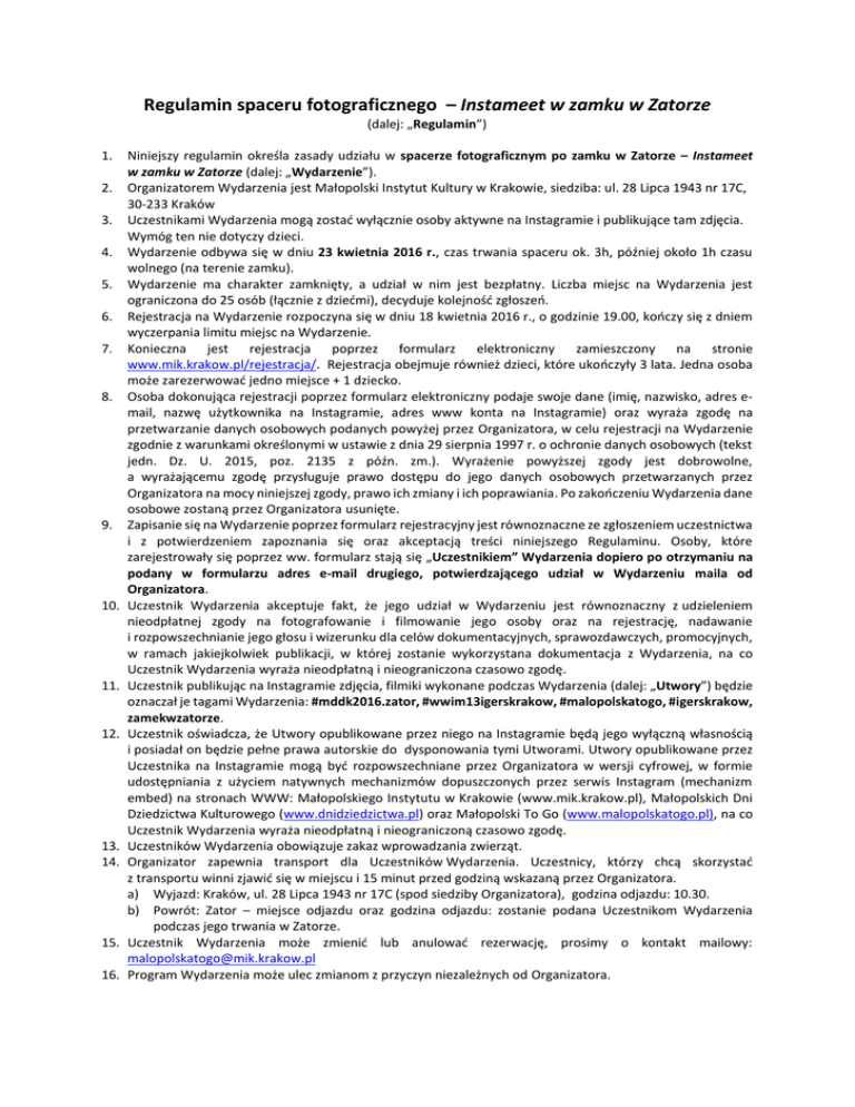 Regulamin spaceru fotograficznego – Instameet w zamku w Zatorze (dalej: „Regulamin”) 1. 2. 3. 4. 5. 6. 7. 8. 9. 10. 11. 12. 13. 14. 15. 16. Niniejszy regulamin określa zasady udziału w spacerze fotograficznym po zamku w Zatorze – Instameet w zamku w Zatorze (dalej: „Wydarzenie”). Organizatorem Wydarzenia jest Małopolski Instytut Kultury w Krakowie, siedziba: ul. 28 Lipca 1943 nr 17C, 30-233 Kraków Uczestnikami Wydarzenia mogą zostać wyłącznie osoby aktywne na Instagramie i publikujące tam zdjęcia. Wymóg ten nie dotyczy dzieci. Wydarzenie odbywa się w dniu 23 kwietnia 2016 r., czas trwania spaceru ok. 3h, później około 1h czasu wolnego (na terenie zamku). Wydarzenie ma charakter zamknięty, a udział w nim jest bezpłatny. Liczba miejsc na Wydarzenia jest ograniczona do 25 osób (łącznie z dziećmi), decyduje kolejność zgłoszeń. Rejestracja na Wydarzenie rozpoczyna się w dniu 18 kwietnia 2016 r., o godzinie 19.00, kończy się z dniem wyczerpania limitu miejsc na Wydarzenie. Konieczna jest rejestracja poprzez formularz elektroniczny zamieszczony na stronie www.mik.krakow.pl/rejestracja/. Rejestracja obejmuje również dzieci, które ukończyły 3 lata. Jedna osoba może zarezerwować jedno miejsce + 1 dziecko. Osoba dokonująca rejestracji poprzez formularz elektroniczny podaje swoje dane (imię, nazwisko, adres email, nazwę użytkownika na Instagramie, adres www konta na Instagramie) oraz wyraża zgodę na przetwarzanie danych osobowych podanych powyżej przez Organizatora, w celu rejestracji na Wydarzenie zgodnie z warunkami określonymi w ustawie z dnia 29 sierpnia 1997 r. o ochronie danych osobowych (tekst jedn. Dz. U. 2015, poz. 2135 z późn. zm.). Wyrażenie powyższej zgody jest dobrowolne, a wyrażającemu zgodę przysługuje prawo dostępu do jego danych osobowych przetwarzanych przez Organizatora na mocy niniejszej zgody, prawo ich zmiany i ich poprawiania. Po zakończeniu Wydarzenia dane osobowe zostaną przez Organizatora usunięte. Zapisanie się na Wydarzenie poprzez formularz rejestracyjny jest równoznaczne ze zgłoszeniem uczestnictwa i z potwierdzeniem zapoznania się oraz akceptacją treści niniejszego Regulaminu. Osoby, które zarejestrowały się poprzez ww. formularz stają się „Uczestnikiem” Wydarzenia dopiero po otrzymaniu na podany w formularzu adres e-mail drugiego, potwierdzającego udział w Wydarzeniu maila od Organizatora. Uczestnik Wydarzenia akceptuje fakt, że jego udział w Wydarzeniu jest równoznaczny z udzieleniem nieodpłatnej zgody na fotografowanie i filmowanie jego osoby oraz na rejestrację, nadawanie i rozpowszechnianie jego głosu i wizerunku dla celów dokumentacyjnych, sprawozdawczych, promocyjnych, w ramach jakiejkolwiek publikacji, w której zostanie wykorzystana dokumentacja z Wydarzenia, na co Uczestnik Wydarzenia wyraża nieodpłatną i nieograniczona czasowo zgodę. Uczestnik publikując na Instagramie zdjęcia, filmiki wykonane podczas Wydarzenia (dalej: „Utwory”) będzie oznaczał je tagami Wydarzenia: #mddk2016.zator, #wwim13igerskrakow, #malopolskatogo, #igerskrakow, zamekwzatorze. Uczestnik oświadcza, że Utwory opublikowane przez niego na Instagramie będą jego wyłączną własnością i posiadał on będzie pełne prawa autorskie do dysponowania tymi Utworami. Utwory opublikowane przez Uczestnika na Instagramie mogą być rozpowszechniane przez Organizatora w wersji cyfrowej, w formie udostępniania z użyciem natywnych mechanizmów dopuszczonych przez serwis Instagram (mechanizm embed) na stronach WWW: Małopolskiego Instytutu w Krakowie (www.mik.krakow.pl), Małopolskich Dni Dziedzictwa Kulturowego (www.dnidziedzictwa.pl) oraz Małopolski To Go (www.malopolskatogo.pl), na co Uczestnik Wydarzenia wyraża nieodpłatną i nieograniczoną czasowo zgodę. Uczestników Wydarzenia obowiązuje zakaz wprowadzania zwierząt. Organizator zapewnia transport dla Uczestników Wydarzenia. Uczestnicy, którzy chcą skorzystać z transportu winni zjawić się w miejscu i 15 minut przed godziną wskazaną przez Organizatora. a) Wyjazd: Kraków, ul. 28 Lipca 1943 nr 17C (spod siedziby Organizatora), godzina odjazdu: 10.30. b) Powrót: Zator – miejsce odjazdu oraz godzina odjazdu: zostanie podana Uczestnikom Wydarzenia podczas jego trwania w Zatorze. Uczestnik Wydarzenia może zmienić lub anulować rezerwację, prosimy o kontakt mailowy: [email protected] Program Wydarzenia może ulec zmianom z przyczyn niezależnych od Organizatora. 17. Organizator zastrzega sobie prawo zmiany Regulaminu w każdym czasie. Zmiana Regulaminu wejdzie w życie z chwilą jego publikacji na www.dnidziedzictwa.pl