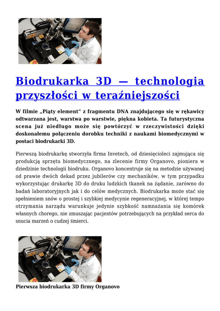 Biodrukarka 3D — technologia przyszłości w teraźniejszości W filmie „Piąty element” z fragmentu DNA znajdującego się w rękawicy odtwarzana jest, warstwa po warstwie, piękna kobieta. Ta futurystyczna scena już niedługo może się powtórzyć w rzeczywistości dzięki doskonałemu połączeniu dorobku techniki z naukami biomedycznymi w postaci biodrukarki 3D. Pierwszą biodrukarkę stworzyła firma Invetech, od dziesięcioleci zajmująca się produkcją sprzętu biomedycznego, na zlecenie firmy Organovo, pioniera w dziedzinie technologii biodruku. Organovo koncentruje się na metodzie używanej od prawie dwóch dekad przez jubilerów czy mechaników, w tym przypadku wykorzystując drukarkę 3D do druku ludzkich tkanek na żądanie, zarówno do badań laboratoryjnych jak i do celów medycznych. Biodrukarka może stać się spełnieniem snów o prostej i szybkiej medycynie regeneracyjnej, w której tempo otrzymania narządu warunkuje jedynie szybkość namnażania się komórek własnych chorego, nie zmuszając pacjentów potrzebujących na przykład serca do snucia marzeń o cudzej śmierci. Pierwsza biodrukarka 3D firmy Organovo Drukarka wyposażona jest w dwie głowice. Zadaniem pierwszej jest umieszczanie docelowych komórek, a druga wprowadza materiały wspomagające jak hydrożel, kolagen czy czynniki wzrostu, konstruując linia po linii i warstwa po warstwie trójwymiarowe struktury. Do druku służy specjalnie zmodyfikowany hydrożel alginianowy, który w temperaturach poniżej 20oC jest płynem, a powyżej 32oC ciałem stałym. Jest on wystarczająco sztywny by utrzymać zaprogramowany kształt i jednocześnie zachowuje właściwości pozwalające na swobodną manipulację. Precyzja sprzętu sięga mikrometrów dzięki zastosowaniu laserowego systemu kalibracji sterowanego komputerowo. Oprogramowanie utrzymuje także na optymalnym poziomie parametry „farby biologicznej” takie jak temperatura, lepkość oraz opór elektryczny. Wspomniana wyżej kompania poinformowała niedawno o udostępnieniu danych dotyczących pierwszej biodrukarki tworzącej naczynia krwionośne. Dane zostały zaprezentowane 10 grudnia 2010 roku na konferencji Tissue Engineering and Regenerative Medicine International Society (TERMIS) w Orlando na Florydzie. Naczynia krwionośne drukuje się z elementów natywnych tętnic: pierwotnych śródbłonkowych komórek mięśni gładkich i fibroblastów otrzymanych od ludzi. Są one pierwszymi na świecie tętnicami wykonanymi wyłącznie z komórek indywidualnej osoby. Wielu naukowców uważa, że na razie przy projektowaniu organów wystarczy wytworzyć jedynie główne naczynia i pozostawić czas i miejsce tkance by sama zbudowała resztę niezbędnych połączeń. To niewiarygodna siła technologii, którą uosabia biodrukarka NovoGen MMX, zaprojektowana specjalnie do budowy zaawansowanych, trójwymiarowych, półstałych struktur komórkowych przy jednoczesnym zachowaniu wysokiej zdolności do przeżycia komórek w trakcie procesu drukowania. Platforma, wyposażona w nowy sprzęt i oprogramowanie rozwiązuje wiele problemów, umożliwiając tym samym komercyjne wykorzystanie biodrukarki. Żywotność i elastyczność komórek, którą umożliwia platforma, gwarantuje szybki postęp w kreacji tkanek na żądanie. Zwłaszcza że plan zakłada, że za 5 lat chirurdzy będą mogli drukować tętnice bezpośrednio podczas operacji na otwartym sercu. Nie jest to jednak jedyny sposób wykorzystania opisywanej technologii. Zespół profesora Jake’a Barraleta z McGill University w Montrealu postanowił skupić się na odbudowywaniu kości. Przede wszystkim cały proces jest niewiarygodnie szybki — trwa około 10 minut. Do procesu potrzebny jest specjalny proszek, będący podstawą konstruowanej kości oraz kwasowy żel utwardzający. Stworzony produkt może od razu trafić do pacjenta, gdzie ulega zrośnięciu z jego tkanką. Technika ta może zrewolucjonizować chirurgię rekonstrukcyjną, i to już niedługo, gdyż w przypadku chrząstek, które są prostymi, niezbyt unaczynionymi strukturami, udało się osiągnąć już pewien sukces, a mianowicie zrekonstruowano uszkodzoną łękotkę. Inny pomysł na wykorzystanie biodruku 3D miał profesor James Yoo z Instytutu Medycyny Regeneracyjnej na Uniwersytecie Wake Forest w Karolinie Północnej. Yoo wraz z zespołem opracowuje system, który pozwoli na drukowanie bezpośrednio na skórę ran oparzeniowych. Zdobył on nie lada inwestora — Departament Obrony USA. System ma być skierowany do żołnierzy wałczących w Afganistanie, gdzie około 30% urazów dotyczy skóry. Rana ma być skanowana, a następnie przekształcana w trójwymiarowy obraz, na podstawie którego system wyliczy jak wiele warstw komórek musi zostać nałożone na ranę, by przywrócić pierwotny stan. Póki co za pomocą systemu udało się uzyskać plastry ze skóry 2 świni o powierzchni 10 cm , a eksperymenty ma myszach wykazały całkowite zasklepienie rany już po dwóch tygodniach. Dzięki użyciu komórek o właściwościach totipotencjalnych udało się odbudować takie struktury jak mieszki włosowe czy gruczoły łojowe. Jak pokazują powyższe przykłady, w biotechnologii nie należy za wszelką cenę szukać nowatorskich, skomplikowanych rozwiązań. Czasem warto rozejrzeć się dookoła i zaadoptować znaną i używaną od lat metodę do nowych celów. Niedobory nukleotydów przyczyną niestabilności chromosomalnej Niestabilność chromosomalna (ang. chromosomal instability, CIN) jest cechą charakterystyczną komórki nowotworowej. Naukowcy odkryli już wiele mechanizmów jej powstawania — skracanie telomerów, defekty mechanizmów naprawy DNA, stres oksydacyjny czy błędy w segregacji chromosomów w trakcie podziału komórki. Zauważono również, że w zaawansowanych stadiach raka, niestabilność chromosomalna obserwowana jest w wielu miejscach w genomie, natomiast w początkowych stadiach nowotworzenia g