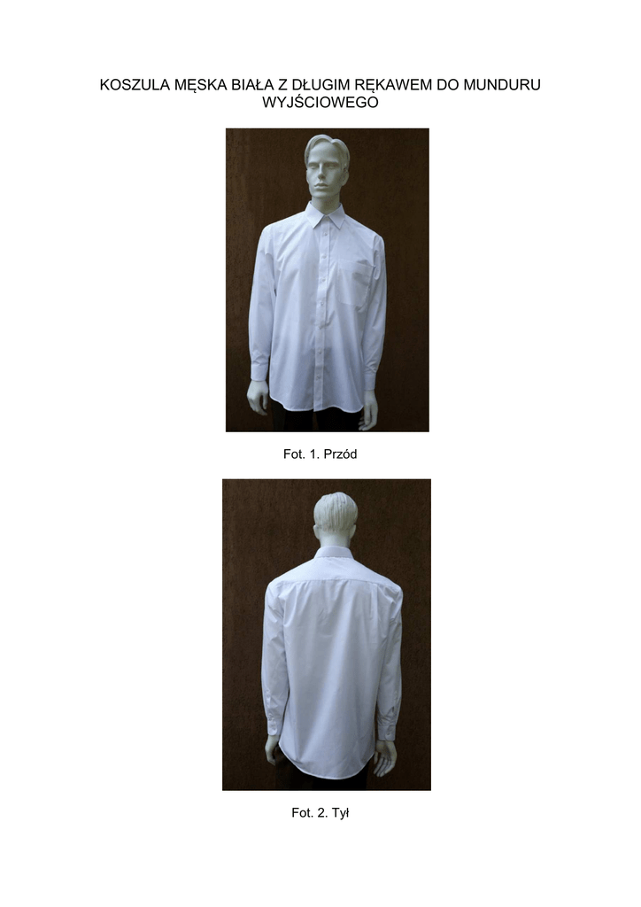 KOSZULA MĘSKA BIAŁA Z DŁUGIM RĘKAWEM DO MUNDURU WYJŚCIOWEGO Fot. 1. Przód Fot. 2. Tył Fot. 3. Detale - kołnierzyk Fot. 4. Detale – mankiet Fot. 5. Detale - kieszeń