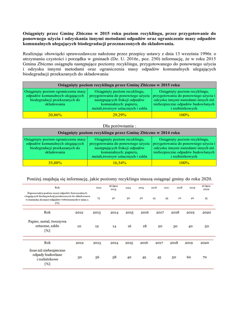 Osiągnięty przez Gminę Zbiczno w 2015 roku poziom recyklingu, przez przygotowanie do ponownego użycia i odzyskania innymi metodami odpadów oraz ograniczenie masy odpadów komunalnych ulegających biodegradacji przeznaczonych do składowania. Realizując obowiązki sprawozdawcze nałożone przez przepisy ustawy z dnia 13 września 1996r. o utrzymaniu czystości i porządku w gminach (Dz. U. 2016r., poz. 250) informację, że w roku 2015 Gmina Zbiczno osiągnęła następujące poziomy recyklingu, przygotowanego do ponownego użycia i odzysku innymi metodami oraz ograniczenia masy odpadów komunalnych ulegających biodegradacji przekazanych do składowania: Osiągnięty poziom recyklingu przez Gminę Zbiczno w 2015 roku Osiągnięty poziom ograniczenia masy Osiągnięty poziom recyklingu, Osiągnięty poziom recyklingu, odpadów komunalnych ulegających przygotowania do ponownego użycia przygotowania do ponownego użycia i biodegradacji przekazanych do następujących frakcji odpadów odzysku innymi metodami innych niż składowania komunalnych: papieru, niebezpieczne odpadów budowlanych metali,tworzyw sztucznych i szkła i rozbiórkowych 20,86% 29,29% 100% Dla porównania : Osiągnięty poziom recyklingu przez Gminę Zbiczno w 2014 roku Osiągnięty poziom ograniczenia masy Osiągnięty poziom recyklingu, Osiągnięty poziom recyklingu, odpadów komunalnych ulegających przygotowania do ponownego użycia przygotowania do ponownego użycia i biodegradacji przekazanych do następujących frakcji odpadów odzysku innymi metodami innych niż składowania komunalnych: papieru, niebezpieczne odpadów budowlanych metali,tworzyw sztucznych i szkła i rozbiórkowych 35,88% 16,54% 100% Poniżej znajdują się informację, jakie poziomy recyklingu muszą osiągnąć gminy do roku 2020.