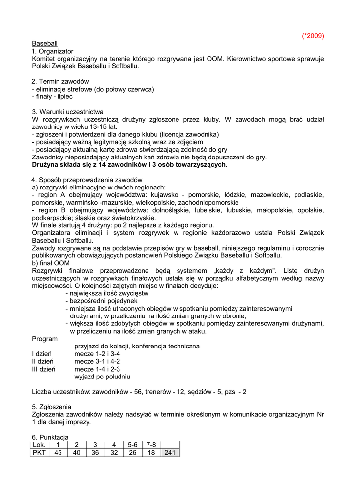 (*2009) Baseball 1. Organizator Komitet organizacyjny na terenie