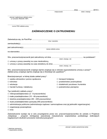.................................................., dnia ............................ 2010 r. miejscowość dzień, miesiąc ................................................... pieczęć nagłówkowa zakładu pracy (z numerem REGON i NIP) .................................................. numer PKD zakładu pracy ZAŚWIADCZENIE O ZATRUDNIENIU Zaświadcza się, że Pani/Pan ............................................................................................................................... imię i nazwisko zamieszkała(y)...................................................................................................................................................... jest zatrudniona(y)................................................................................................................................................. nazwa zakładu pracy na stanowisku ....................................................................................................................................................... Ww. pracownica/pracownik jest zatrudniony od dnia ............................................................ na podstawie*: dzień, miesiąc, rok □ umowy o pracę zawartej na czas nieokreślony, □ umowy o pracę zawartej na czas określony do dnia .................................................... dzień, miesiąc, rok Ww. pracownica/pracownik znajduje się/nie znajduje się w okresie wypowiedzenia umowy o pracę**. Zakład pracy znajduje się/nie znajduje się w likwidacji lub upadłości**. Branża/przemysł, w której działa zakład pracy*: □ opieka zdrowotna i pomoc społeczna □ rolnictwo □ edukacja □ handel hurtowy i detaliczny □ transport kolejowy □ przetwórstwo przemysłowe □ działalność pocztowa i kurierska □ pośrednictwo pieniężne Typ (wielkość) zakładu pracy*: □ mikroprzedsiębiorstwo (2 - 9 pracowników) □ małe przedsiębiorstwo (10 - 49 pracowników) □ średnie przedsiębiorstwo (50 - 249 pracowników) □ duże przedsiębiorstwo (powyżej 250 pracowników) □ administracja publiczna (administracja rządowa i samorządowa oraz jej jednostki organizacyjne) □ organizacja pozarządowa □ inne Zaświadczenie wydaje się w celu przystąpienia przez ww. pracownicę/pracownika do udziału w Projekcie „Adaptacja - program reintegracji zawodowej mieszkańców województwa podlaskiego dotkniętych negatywnymi skutkami procesów restrukturyzacyjnych”. ............................................................... pieczęć i podpis uprawnionej osoby * właściwe zaznaczyć ** niepotrzebne skreślić