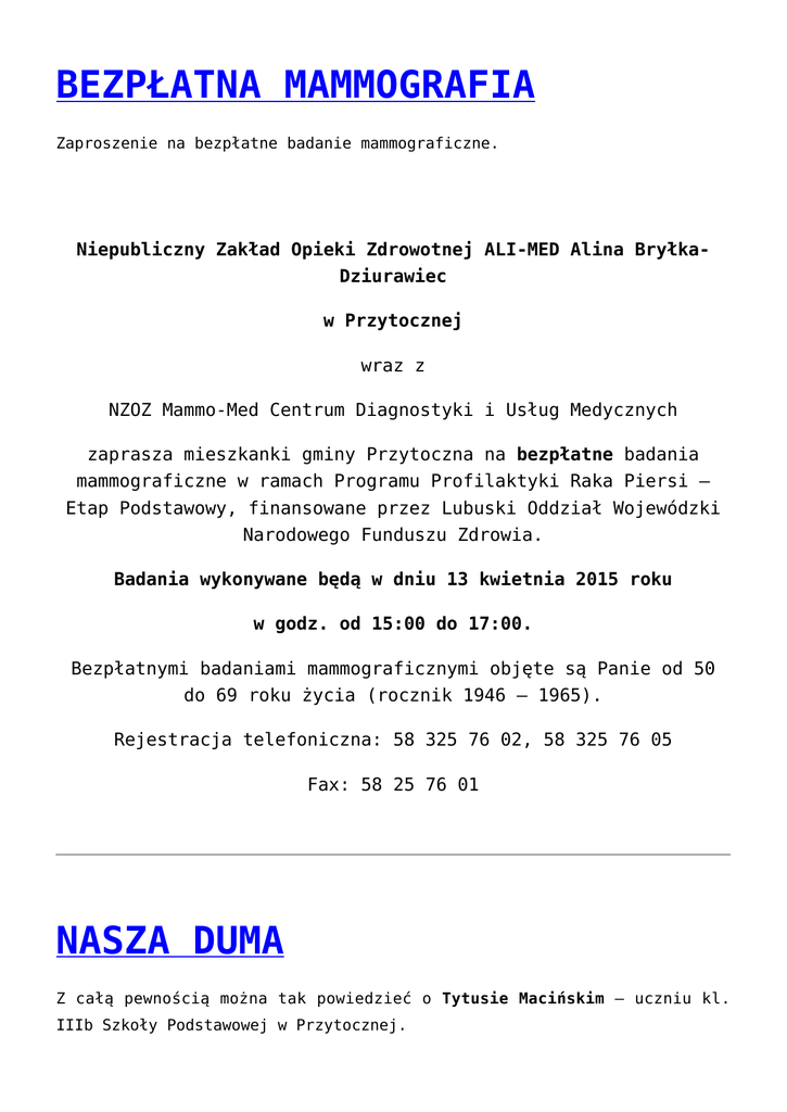 BEZPŁATNA MAMMOGRAFIA Zaproszenie na bezpłatne badanie mammograficzne. Niepubliczny Zakład Opieki Zdrowotnej ALI-MED Alina BryłkaDziurawiec w Przytocznej wraz z NZOZ Mammo-Med Centrum Diagnostyki i Usług Medycznych zaprasza mieszkanki gminy Przytoczna na bezpłatne badania mammograficzne w ramach Programu Profilaktyki Raka Piersi – Etap Podstawowy, finansowane przez Lubuski Oddział Wojewódzki Narodowego Funduszu Zdrowia. Badania wykonywane będą w dniu 13 kwietnia 2015 roku w godz. od 15:00 do 17:00. Bezpłatnymi badaniami mammograficznymi objęte są Panie od 50 do 69 roku życia (rocznik 1946 – 1965). Rejestracja telefoniczna: 58 325 76 02, 58 325 76 05 Fax: 58 25 76 01 NASZA DUMA Z całą pewnością można tak powiedzieć o Tytusie Macińskim – uczniu kl. IIIb Szkoły Podstawowej w Przytocznej. NASZA DUMA Z całą pewnością można tak powiedzieć o Tytusie Macińskim – uczniu kl. IIIb Szkoły Podstawowej w Przytocznej. Tytus już od pierwszej klasy zachwyca każdego słuchacza podczas recytacji wierszy, które prezentuje w sposób niezapomniany i wyjątkowy. Osiągnął kolejny sukces na szczeblu swojej artystycznej kariery. Podczas Powiatowego Konkursu Recytatorskiego dn. 19.03.2015r. w Międzyrzeckim Ośrodku Kultury. Uczeń zaprezentował wiersz Zygmunta Marka Miszczaka pt. „O skutkach pewnej diety”, a zrobił to tak wspaniale, że uzyskał tytuł laureata i tym samym dostał nominację do szczebla wojewódzkiego konkursu recytatorskiego. Swoje możliwości obok Tytusa zaprezentowali także: Dominik Matusiewicz, uczeń kl. IIb, który za swój występ otrzymał wyróżnienie oraz Julia Kogut i Wiktoria Gidlewicz. Trzymamy wszyscy mocno kciuki za Tytusa i wierzymy, że osiągnie jeszcze większy sukces, bo trzeba przyznać, że jest to chłopiec wyjątkowyJ. MSU przygotował niespodziankę, dzięki której każdy z nas będzie mógł Tytusa poznać bliżej, przeczytajcie krótki wywiad, jakiego udzielił Tytus, dzień po konkursie recytatorskim. WYWIAD Z TYTUSEM MACIŃSKIM Tytusie już od pierwszej klasy wiadomo, że masz niesamowity talent recytatorski, powiedz, kiedy już wychodzisz na scenę podczas ważnego konkursu jesteś jeszcze zestresowany? Tytus: Zwykle jestem wyluzowany, bo jak mam tremę, mogę zapomnieć tekstu. Co czujesz, kiedy się dowiadujesz, że to Ty wygrałeś? Tytus: Czuję wielką radość z kolejnego sukcesu. Tytusie opowiedz o swoich pasjach, zainteresowaniach? Tytus: Moje zainteresowania, jest ich wiele, ale są to: karate, pływanie, boks, aktorstwo, tenis, piłka nożna i piłka ręczna. Tytusie jakie jest Twoje największe marzenie? Tytus: Moim największym marzeniem jest zostać aktorem. Co byś powiedział uczniom ze swojej szkoły, tym co myślą, że marzenia zazwyczaj się nie spełniają? Tytus: Idź przed siebie. Nie wątp w swoje możliwości. Na pewno rodzice są bardzo z ciebie dumni, co powiedzieli o Twoim sukcesie? Tytus: Wszyscy się radowali, rodzice dzwonili do znajomych, aby podzielić się swoją radością. Gdybyś mógł, to co byś zmienił w naszej szkole lub na świecie? Tytus: Chciałbym, aby ludzie się nie zabijali, aby konflikt na Ukrainie został zażegnany. Dziękuję Ci za wywiad, życzę dalszych sukcesów i spełnienia marzeń! Wywiad przeprowadził: Julian Orzeł kl. IIIb – przewodniczący MSU Lucyna Tratwal – opiekun MSU KOLOROWY DZIEŃ... W piątek 27 marca 2015 roku dzieci z Kasztanowej Krainy odwiedziły salę zabaw „Acapulco” w galerii Nova Park w Gorzowie Wlkp. Doświadczenia ostatnich lat pokazują, że współczesnym małym dzieciom coraz częściej towarzyszą sytuacje trudne, lęki i problemy emocjonalne związane z wymaganiami i oczekiwaniami dorosłych wobec nich. Ten stan rzeczy nasze przedszkole stara się złagodzić lub całkowicie zmienić. Dlatego też realizujemy innowacje pedagogiczne, ciekawe programy edukacyjnowychowawcze. Szczególna wrażliwość małego dziecka sprawia, że chłonie ono obrazy, kształty, barwy, zapachy i dźwięki w sposób niezwykle intensywny. Dlatego też jedną z takich innowacji jest stosowanie metody daltońskiej, która m.in. wykorzystuje kolory przy utrwalaniu dni tygodnia. Piątek 27 marca 2015 roku był upragnionym przez Grupę Motylki „ żółtym dniem”. Główną atrakcją był pobyt w sali zabaw „Acapulco” w galerii Nova Park w Gorzowie Wlkp. Na miejscu gości z Kasztanowej Krainy zachwycił niesamowicie barwny wystrój nawiązujący do bajek Disneya. Zabawy było co nie miara: zjeżdżalnie, tory przeszkód, suchy basen, tor samochodowy, trampolina, boisko do gry w piłkę, karuzela. Na ten dzień dzieci czekały również inne atrakcje: malowanie tatuaży, zabawa z Kubusiem Puchatkiem i dyskoteka. Po zabawie w sali (3 godziny szaleństwa i zero zmęczenia) dzieci zjadły pizzę, która okazała się dla nich bardzo wytwornym daniem. Szczęśliwe i pełne wrażeń wróciły do przedszkola. Bardzo dziękujemy za pomoc Rodzicom oraz sponsorom: Marzenie Pacan oraz Marcie Kucharyk. dsc_0267 dsc_0269 dsc_0270 dsc_0271 dsc_0273 dsc_0276 dsc_0279 dsc_0281 dsc_0283 dsc_0289 dsc_0291 dsc_0292 dsc_0293 dsc_0294 dsc_0298 dsc_0303 dsc_0313 dsc_0316 dsc_0318 dsc_0325 dsc_0328 dsc_0329 dsc_0337 dsc_0339 dsc_0351 dsc_0370 dsc_0373 dsc_0377 T-TEENS WIOSENNIE, WYJAZDOWO, TANECZNIE Pierwszy dzień wiosny dla zespołu tanecznego T-Teens był wyjątkowo pracowity. Pierwszy dzień wiosny dla zespołu tanecznego T-Teens był wyjątkowo pracowity. 21 marca bowiem zespół reprezentował Gminę Przytoczna na Polsko- Niemieckim Festiwalu Tańca w Żarach. Młodzi tancerze już o godz. 6:30 spakowani i pełni pozytywnej, bo wiosennej, energii wyruszyli autokarem w podróż. Po dotarciu na miejsce odbyły się próby sytuacyjne parkietu, po czym uczestnicy przygotowywali się do swoich prezentacji. W imprezie udział wzięło blisko 90 zespołów z Polski i z Niemiec. T-Teens pokazał się z czterema tańcami. Grupa młodsza w kategorii disco show (9-11 l
