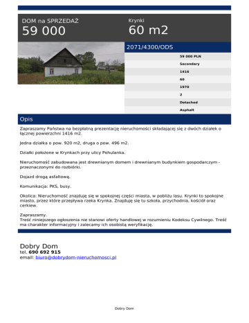Krynki DOM na SPRZEDAŻ 60 m2 59 000 2071/4300/ODS 59 000 PLN Secondary 1416 60 1970 2 Detached Asphalt Opis Zapraszamy Państwa na bezpłatną prezentację nieruchomości składającej się z dwóch działek o łącznej powierzchni 1416 m2. Jedna działka o pow. 920 m2, druga o pow. 496 m2. Działki położone w Krynkach przy ulicy Pohulanka. Nieruchomość zabudowana jest drewnianym domem i drewnianym budynkiem gospodarczym przeznaczonymi do rozbiórki. Dojazd drogą asfaltową. Komunikacja: PKS, busy. Okolica: Nieruchomość znajduję się w spokojnej części miasta, w pobliżu lasu. Krynki to spokojne miasto, przez które przepływa rzeka Krynka. Znajduję się tu szkoła, przychodnia, kościół oraz cerkiew. Zapraszamy. Treść niniejszego ogłoszenia nie stanowi oferty handlowej w rozumieniu Kodeksu Cywilnego. Treść ma charakter informacyjny i zalecamy ich osobistą weryfikację. Dobry Dom tel. 690 692 915 email: [email protected] Dobry Dom Powered by TCPDF (www.tcpdf.org)