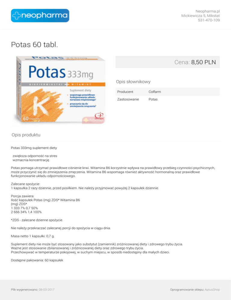 Neopharma.pl Mickiewicza 5, Mikstat 531-470-109 Potas 60 tabl. Cena: 8,50 PLN Opis słownikowy Producent Colfarm Zastosowanie Potas Opis produktu Potas 333mg suplement diety zwiększa odporność na stres wzmacnia koncentrację Potas pomaga utrzymać prawidłowe ciśnienie krwi. Witamina B6 korzystnie wpływa na prawidłowy przebieg czynności psychicznych, może przyczynić się do zmniejszenia zmęczenia. Witamina B6 wspomaga również aktywność hormonalną oraz prawidłowe funkcjonowanie układu odpornościowego. Zalecane spożycie: 1 kapsułka 2 razy dziennie, przed posiłkiem. Nie należy przyjmować powyżej 2 kapsułek dziennie. Porcja zawiera: Ilość kapsułek Potas (mg) ZDS* Witamina B6 (mg) ZDS* 1 333 7% 0,7 50% 2 666 34% 1,4 100% *ZDS - zalecane dzienne spożycie. Nie należy przekraczać zalecanej porcji do spożycia w ciągu dnia. Masa netto 1 kapsułki: 0,7 g. Suplement diety nie może być stosowany jako substytut (zamiennik) zróżnicowanej diety i zdrowego trybu życia. Ważne jest stosowanie zbilansowanej i zróżnicowanej diety oraz zdrowego trybu życia. Przechowywać w temperaturze pokojowej, w suchym miejscu, w sposób niedostępny dla małych dzieci. Dostępne pakowania: 60 kapsułek Plik wygenerowano: 08-03-2017 Powered by TCPDF (www.tcpdf.org) Oprogramowanie sklepu: AptusShop