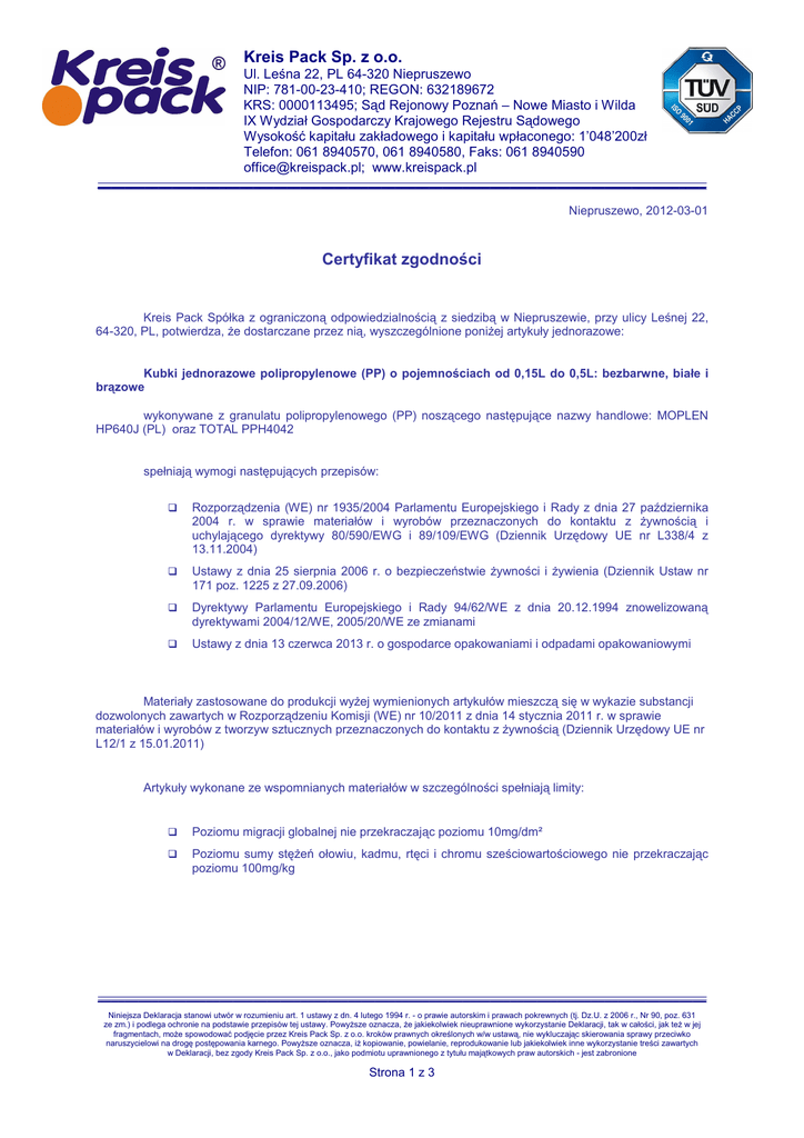 Kreis Pack Sp. z o.o. Ul. Leśna 22, PL 64-320 Niepruszewo NIP: 781-00-23-410; REGON: 632189672 KRS: 0000113495; Sąd Rejonowy Poznań – Nowe Miasto i Wilda IX Wydział Gospodarczy Krajowego Rejestru Sądowego Wysokość kapitału zakładowego i kapitału wpłaconego: 1’048’200zł Telefon: 061 8940570, 061 8940580, Faks: 061 8940590 [email protected]; www.kreispack.pl __________________________________________________________________________________________ Niepruszewo, 2012-03-01 Certyfikat zgodności Kreis Pack Spółka z ograniczoną odpowiedzialnością z siedzibą w Niepruszewie, przy ulicy Leśnej 22, 64-320, PL, potwierdza, że dostarczane przez nią, wyszczególnione poniżej artykuły jednorazowe: Kubki jednorazowe polipropylenowe (PP) o pojemnościach od 0,15L do 0,5L: bezbarwne, białe i brązowe wykonywane z granulatu polipropylenowego (PP) noszącego następujące nazwy handlowe: MOPLEN HP640J (PL) oraz TOTAL PPH4042 spełniają wymogi następujących przepisów: Rozporządzenia (WE) nr 1935/2004 Parlamentu Europejskiego i Rady z dnia 27 października 2004 r. w sprawie materiałów i wyrobów przeznaczonych do kontaktu z żywnością i uchylającego dyrektywy 80/590/EWG i 89/109/EWG (Dziennik Urzędowy UE nr L338/4 z 13.11.2004) Ustawy z dnia 25 sierpnia 2006 r. o bezpieczeństwie żywności i żywienia (Dziennik Ustaw nr 171 poz. 1225 z 27.09.2006) Dyrektywy Parlamentu Europejskiego i Rady 94/62/WE z dnia 20.12.1994 znowelizowaną dyrektywami 2004/12/WE, 2005/20/WE ze zmianami Ustawy z dnia 13 czerwca 2013 r. o gospodarce opakowaniami i odpadami opakowaniowymi Materiały zastosowane do produkcji wyżej wymienionych artykułów mieszczą się w wykazie substancji dozwolonych zawartych w Rozporządzeniu Komisji (WE) nr 10/2011 z dnia 14 stycznia 2011 r. w sprawie materiałów i wyrobów z tworzyw sztucznych przeznaczonych do kontaktu z żywnością (Dziennik Urzędowy UE nr L12/1 z 15.01.2011) Artykuły wykonane ze wspomnianych materiałów w szczególności spełniają limity: Poziomu migracji globalnej nie przekraczając poziomu 10mg/dm² Poziomu sumy stężeń ołowiu, kadmu, rtęci i chromu sześciowartościowego nie przekraczając poziomu 100mg/kg __________________________________________________________________________________________ Niniejsza Deklaracja stanowi utwór w rozumieniu art. 1 ustawy z dn. 4 lutego 1994 r. - o prawie autorskim i prawach pokrewnych (tj. Dz.U. z 2006 r., Nr 90, poz. 631 ze zm.) i podlega ochronie na podstawie przepisów tej ustawy. Powyższe oznacza, że jakiekolwiek nieuprawnione wykorzystanie Deklaracji, tak w całości, jak też w jej fragmentach, może spowodować podjęcie przez Kreis Pack Sp. z o.o. kroków prawnych określonych w/w ustawą, nie wykluczając skierowania sprawy przeciwko naruszycielowi na drogę postępowania karnego. Powyższe oznacza, iż kopiowanie, powielanie, reprodukowanie lub jakiekolwiek inne wykorzystanie treści zawartych w Deklaracji, bez zgody Kreis Pack Sp. z o.o., jako podmiotu uprawnionego z tytułu majątkowych praw autorskich - jest zabronione Strona 1 z 3 Kreis Pack Sp. z o.o. Ul. Leśna 22, PL 64-320 Niepruszewo NIP: 781-00-23-410; REGON: 632189672 KRS: 0000113495; Sąd Rejonowy Poznań – Nowe Miasto i Wilda IX Wydział Gospodarczy Krajowego Rejestru Sądowego Wysokość kapitału zakładowego i kapitału wpłaconego: 1’048’200zł Telefon: 061 8940570, 061 8940580, Faks: 061 8940590 [email protected]; www.kreispack.pl __________________________________________________________________________________________ Głównym przeznaczeniem wytwarzanych przez nas kubków jest konsumpcja za ich pomocą wszystkich rodzajów napojów, w tym napojów tłustych, kwaśnych i zawierających alkohol. Należy zwrócić uwagę na fakt, że użytkowy zakres temperatur dla tych wyrobów mieści się w zakresie od +120ºC do -30ºC. W szczególności nie należy przekraczać górnego poziomu wytrzymałości temperaturowej artykułów. Artykuły te mogą mieć zastosowanie do podgrzewania żywności w kuchenkach mikrofalowych. Przy zachowaniu powyższych ograniczeń temperaturowych, artykuły te wprowadzane do obrotu użytkowane w normalnych lub możliwych do przewidzenia warunkach: nie stanowią zagrożenia dla zdrowia człowieka; nie powodują niemożliwych do przyjęcia zmiany w składzie żywności; nie powodują pogorszenia cech organoleptycznych żywności Artykuły przez nas dostarczane są produkowane zgodnie z Dobrą Praktyką Produkcyjną (GMP) zgodnie z Rozporządzeniem Komisji (WE) nr 2023/2006 (Dziennik Urzędowy UE nr L384/75 z 29.12.2006) i Dobrą Praktyką Higieniczną (GHP). Dodatkowo, Kreis Pack Sp. z o.o. ogranicza ilość i negatywne oddziaływanie na środowisko substancji stosowanych do produkcji opakowań oraz wytwarzanych odpadów opakowaniowych, a w szczególności: Ogranicza do niezbędnego minimum objętość i masę opakowań tak, aby spełniały swoją funkcję, biorąc pod uwagę oczekiwania użytkownika, Projektuje i wykonuje wyroby w sposób umożliwiający ich recykling. Zgodnie z Artykułem 15 pkt 3 Rozporządzenia Komisji (WE) nr 10/2011 „Deklaracje odnawia się, jeżeli w składzie lub procesie wytwarzania zachodzą znaczące zmiany pociągające za sobą zmiany poziomu migracji z materiałów lub wyrobów lub jeżeli udostępnione zostają nowe dane naukowe”. Kreis Pack Sp. z o.o. zobowiązuje się do niezwłocznego wydania nowej wersji niniejszej deklaracji jeśli tylko takie fakty będą mieć miejsce. Kreis Pack Sp. z o.o. __________________________________________________________________________________________ Niniejsza Deklaracja stanowi utwór w rozumieniu art. 1 ustawy z dn. 4 lutego 1994 r. - o prawie autorskim i prawach pokrewnych (tj. Dz.U. z 2006 r., Nr 90, poz. 631 ze zm.) i podlega ochronie na podstawie przepisów tej ustawy. Powyższe oznacza, że jakiekolwiek nieuprawnione wykorzystanie Deklaracji, tak w całości, jak też w jej fragmentach, może spowodo