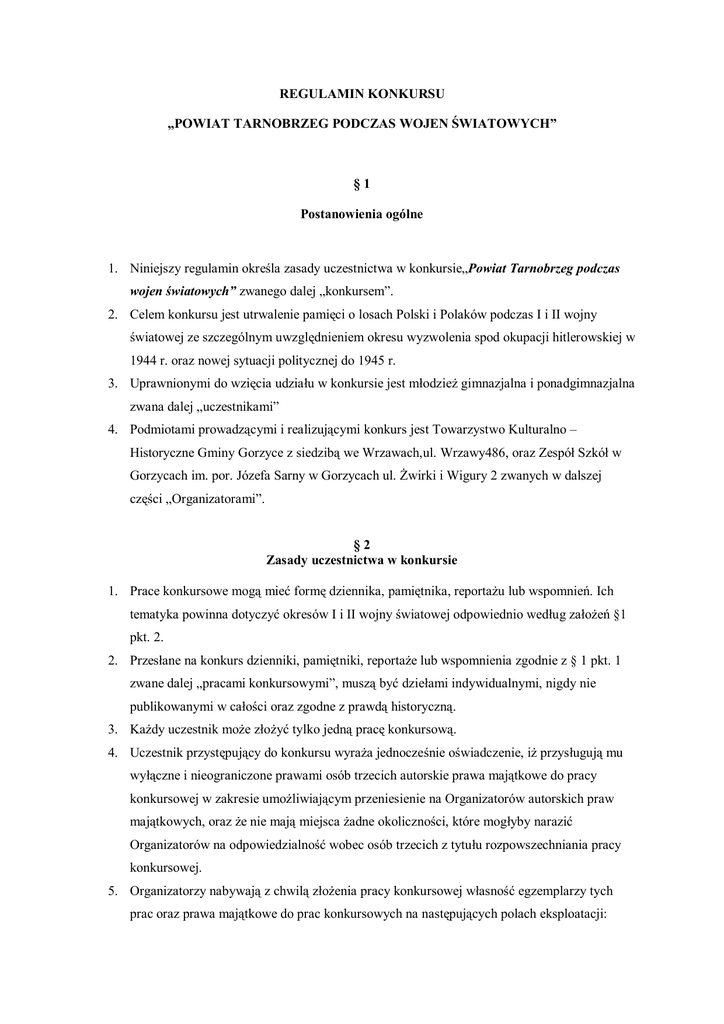 REGULAMIN KONKURSU „POWIAT TARNOBRZEG PODCZAS WOJEN ŚWIATOWYCH” §1 Postanowienia ogólne 1. Niniejszy regulamin określa zasady uczestnictwa w konkursie„Powiat Tarnobrzeg podczas wojen światowych” zwanego dalej „konkursem”. 2. Celem konkursu jest utrwalenie pamięci o losach Polski i Polaków podczas I i II wojny światowej ze szczególnym uwzględnieniem okresu wyzwolenia spod okupacji hitlerowskiej w 1944 r. oraz nowej sytuacji politycznej do 1945 r. 3. Uprawnionymi do wzięcia udziału w konkursie jest młodzież gimnazjalna i ponadgimnazjalna zwana dalej „uczestnikami” 4. Podmiotami prowadzącymi i realizującymi konkurs jest Towarzystwo Kulturalno – Historyczne Gminy Gorzyce z siedzibą we Wrzawach,ul. Wrzawy486, oraz Zespół Szkół w Gorzycach im. por. Józefa Sarny w Gorzycach ul. Żwirki i Wigury 2 zwanych w dalszej części „Organizatorami”. §2 Zasady uczestnictwa w konkursie 1. Prace konkursowe mogą mieć formę dziennika, pamiętnika, reportażu lub wspomnień. Ich tematyka powinna dotyczyć okresów I i II wojny światowej odpowiednio według założeń §1 pkt. 2. 2. Przesłane na konkurs dzienniki, pamiętniki, reportaże lub wspomnienia zgodnie z § 1 pkt. 1 zwane dalej „pracami konkursowymi”, muszą być dziełami indywidualnymi, nigdy nie publikowanymi w całości oraz zgodne z prawdą historyczną. 3. Każdy uczestnik może złożyć tylko jedną pracę konkursową. 4. Uczestnik przystępujący do konkursu wyraża jednocześnie oświadczenie, iż przysługują mu wyłączne i nieograniczone prawami osób trzecich autorskie prawa majątkowe do pracy konkursowej w zakresie umożliwiającym przeniesienie na Organizatorów autorskich praw majątkowych, oraz że nie mają miejsca żadne okoliczności, które mogłyby narazić Organizatorów na odpowiedzialność wobec osób trzecich z tytułu rozpowszechniania pracy konkursowej. 5. Organizatorzy nabywają z chwilą złożenia pracy konkursowej własność egzemplarzy tych prac oraz prawa majątkowe do prac konkursowych na następujących polach eksploatacji: a. Wprowadzenie do pamięci komputera; b. Utrwalenia i zwielokrotniania, w nieograniczonej liczbie, za pomocą wszelkich dostępnych technik (w tym przede wszystkim techniką drukarską jak również wytwarzanie techniką cyfrową) na jakimkolwiek nośniku lub/i w sieci multimedialnej (w tym internetowych, intranetowych oraz powiązanych serwisach on-line); c. Wprowadzania wytworzonych egzemplarzy do obrotu na terenie Rzeczpospolitej Polskiej oraz poza jej granicami; d. Publicznego udostępniania utworu w taki sposób, aby każdy mógł mieć do niego dostęp w miejscu i w czasie przez siebie wybranym (w szczególności wprowadzenie i udostępnianie w Internecie na stronach internetowych Towarzystwa Kulturalno Historycznego Gminy, serwisach tekstowych, multimedialnych i innych); e. Wykorzystanie utworu (w całości lub/i fragmencie) w celach informacyjnoedukacyjnych i promocyjnych w ramach realizacji misji wynikającej ze statutu Towarzystwa Kulturalno-Historycznego Gminy Gorzyce. 6. Prace konkursowe należy dostarczyć osobiście lub przesłać pocztą do dnia 30 stycznia 2014 r. (decyduje data złożenia lub stempla pocztowego) na adres: Zespół Szkół im. por. Józefa Sarny w Gorzycach ul. Żwirki i Wigury 2, 39 – 432 Gorzyce; sekretariat czynnyw godz. od 7-15. 7. Zgłoszone prace powinny mieć formę rękopisu lub maszynopisu (tradycyjnego lub komputerowego) z możliwością dołączenia nagrania audio lub video. 8. Organizatorzy nie są zobowiązani do zwrotu kosztów wynikających z przygotowania, i złożenia pracy konkursowej. 9. Udział w konkursie jest bezpłatny. 10. Złożone prace są już ostateczne i nie mogą być po ich złożeniu zwracane w celu dokonania przeróbek lub poprawek (oczywiste błędy lub omyłki pisarskie zostaną poprawione po wcześniejszym poinformowaniu przez Organizatorów uczestnika konkursu bądź odwrotnie w drodze wzajemnych konsultacji). Nie dotyczy to sytuacji, gdy uczestnik odstąpi od konkursu. 11. Przesłanie pracy na konkurs jest jednoznaczne z akceptacja regulaminu konkursu. §3 Tryb oceny prac i przyznawania nagród 1. Oceny dokona komisja konkursowa powołana przez Organizatorów. Rozstrzygnięcie konkursu nastąpi w lutym 2014 r. po uprzedniej informacji zamieszczonej na stronach internetowych Organizatorów lub po ogłoszeniu w inny dobrowolny sposób.Informacja o rozstrzygnięciu konkursu powinna pojawić się najpóźniej na 7 dni przed ogłoszeniem wyników. 2. Wyniki konkursu zostaną opublikowane na stronach internetowych Organizatorów według założeń § 3 pkt. 1 zd. 2 i 3. Laureaci konkursu zostaną także odpowiednio powiadomieni. 3. Nagrodami w konkursie są nagrody rzeczowe oraz publikacja w specjalnym wydaniu rocznika Towarzystwa Kulturalno – Historycznego Gminy Gorzyce „Chata”. 4. Organizatorzy zastrzegają sobie prawo przyznawania więcej niż jednej nagrody głównej. 5. Towarzystwo Kulturalno – Historyczne Gminy Gorzyce zastrzega sobie prawo opublikowania prac konkursowych. 6. Organizatorzy zastrzegają sobie prawo przyznawania dodatkowych wyróżnień. 7. Decyzje komisji są ostateczne i nie podlegają weryfikacji lub zaskarżeniu. §4 Ochrona danych osobowych 1. Uczestnik wyraża zgodę na przetwarzanie danych osobowych na potrzeby konkursu zgodnie z przepisami ustawy z dnia 29 sierpnia 1997 r. o ochronie danych osobowych (Dz. U. z 2002 r. Nr. 101, poz. 926 ze zm.) 2. Uczestnik konkursu podaje swoje dane osobowe dobrowolnie. 3. Uczestnik konkursu wyraża zgodę na przetwarzanie przez Organizatora swych danych osobowych w celach związanych z organizacją konkursu. 4. Na zasadach przewidzianych przepisami w/w ustawy o ochronie danych osobowych uczestnik konkursu ma prawo dostępu do swoich danych, ich poprawiania oraz żądania zaprzestania ich przetwarzania. 5. Żądanie zaprzestania przetwarzania danych osobowych jest równoznaczne z rezygnacją w konkurs