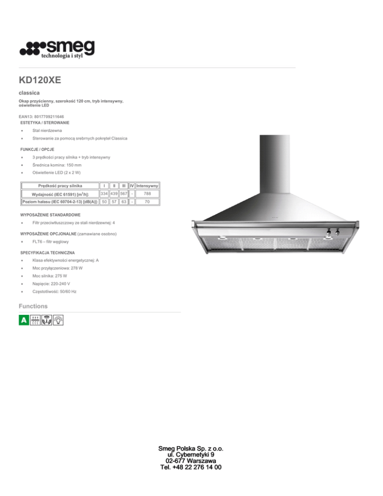KD120XE classica Okap przyścienny, szerokość 120 cm, tryb intensywny, oświetlenie LED EAN13: 8017709211646 ESTETYKA / STEROWANIE Stal nierdzewna Sterowanie za pomocą srebrnych pokręteł Classica FUNKCJE / OPCJE 3 prędkości pracy silnika + tryb intensywny Średnica komina: 150 mm Oświetlenie LED (2 x 2 W) Prędkość pracy silnika 3 Wydajność (IEC 61591) [m /h]: I II III 334 439 567 Poziom hałasu (IEC 60704-2-13) [dB(A)]: 50 57 63 IV Intensywny - 788 - 70 WYPOSAŻENIE STANDARDOWE Filtr przeciwtłuszczowy ze stali nierdzewnej: 4 WYPOSAŻENIE OPCJONALNE (zamawiane osobno) FLT6 – filtr węglowy SPECYFIKACJA TECHNICZNA Klasa efektywności energetycznej: A Moc przyłączeniowa: 278 W Moc silnika: 275 W Napięcie: 220-240 V Częstotliwość: 50/60 Hz Functions Smeg Polska Sp. z o.o. ul. Cybernetyki 9 02-677 Warszawa Tel. +48 22 276 14 00 KD120XE classica przyścienne 120 cm stal nierdzewna Klasa A: Klasa A piekarnika zapewnia niskie zużycie energii. FILT PRZECIWTŁUSZCZOWY: Wielowarstwowe filtry, wykonane ze stali nierdzewnej lub aluminium, stanowią idealne rozwiązanie w oczyszczaniu tłustych oparów powstałych podczas gotowania. TRYB INTENSYWNY: Tryb intensywny pozwala na uruchomienie okapu z maksymalną wydajnością, tak aby w sposób istotny przyspieszyć niwelowanie najbardziej uporczywych zapachów powstałych podczas gotowania. OŚWIETLENIE: Okapy zostały wyposażone w oświetlenie standardowe lub halogenowe, zależnie od modelu. Oświetlenie może być aktywowane podczas pracy wentylatora okapu lub niezależnie, dając możliwość oświetlenia blatu kuchennego podczas codziennych czynności. Smeg Polska Sp. z o.o. ul. Cybernetyki 9 02-677 Warszawa Tel. +48 22 276 14 00 KD120XE classica przyścienne 120 cm stal nierdzewna Smeg Polska Sp. z o.o. ul. Cybernetyki 9 02-677 Warszawa Tel. +48 22 276 14 00